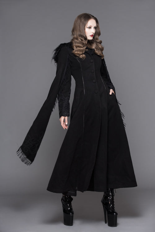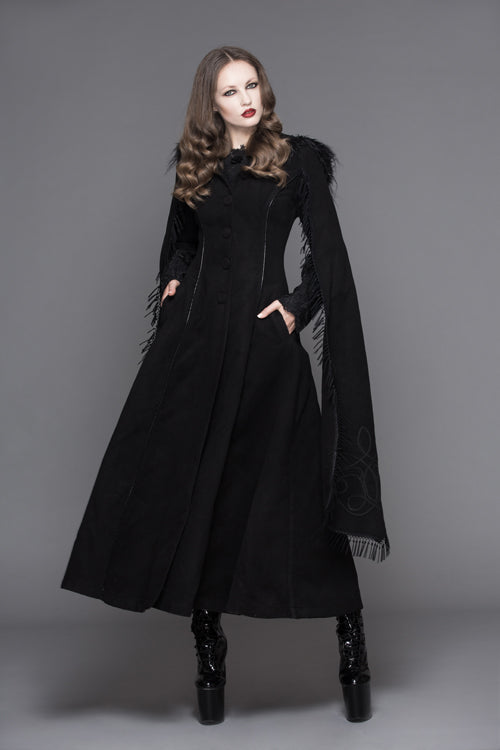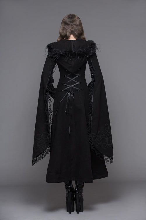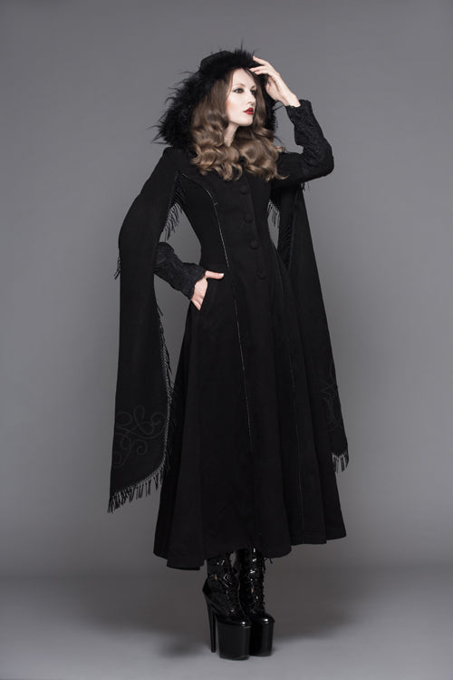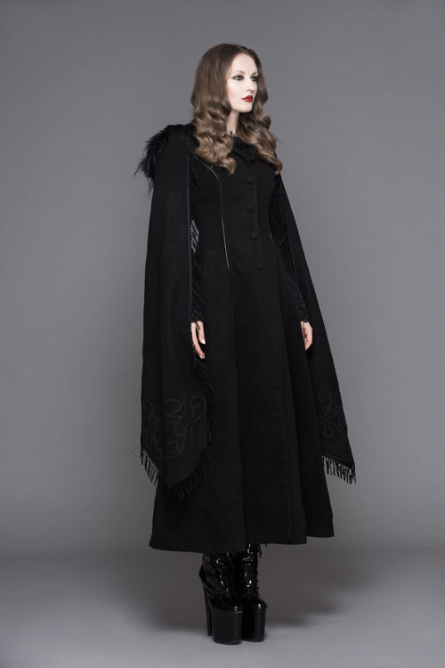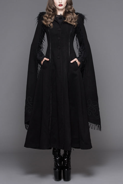 The whole piece coat is made of black double-sided cloth, the cuffs are decorated with black lace, the shawl is hand-embroidered, the edge is stitching with macrame, the back waist is tied with rope, and the wool strips on the hat can not be removed.