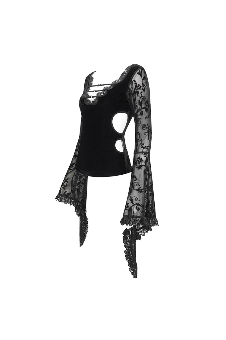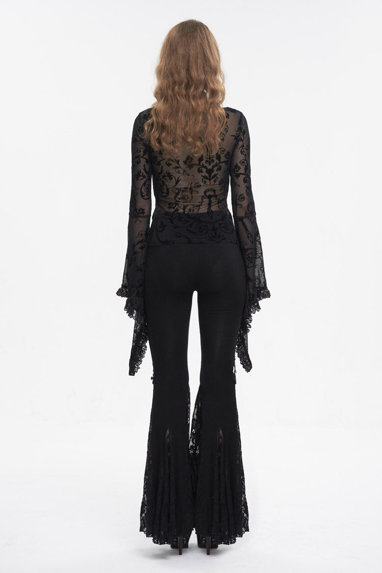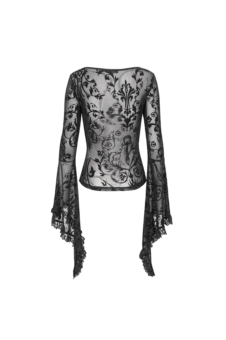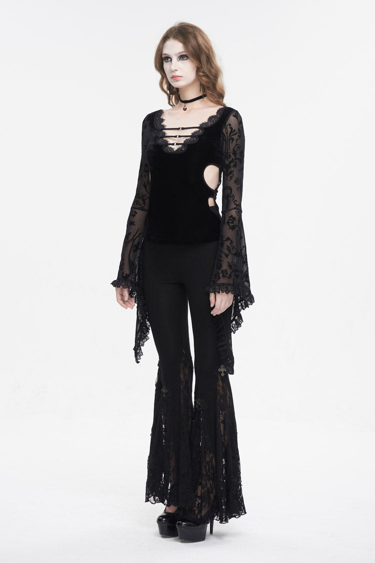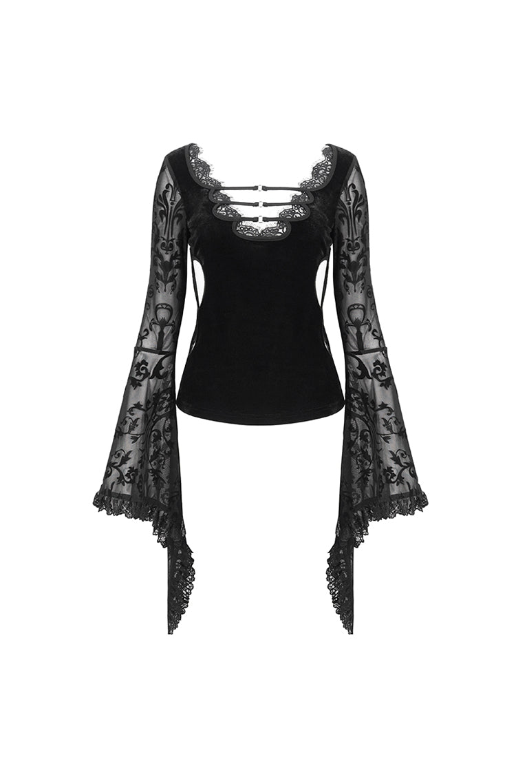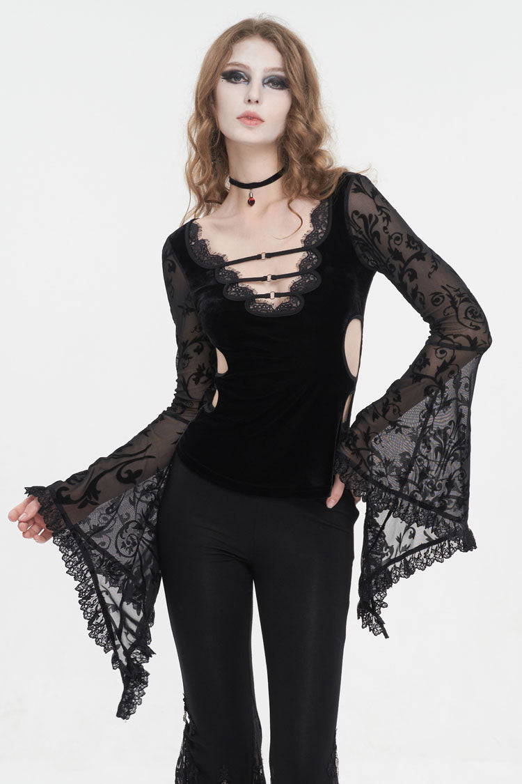 This gothic shirt is made of velvet and mesh fabric. The mesh fabric has floral flocking. It has flared sleeves and a plunging neckline. Lace patchwork on the hem. Slim fitted silhouette.