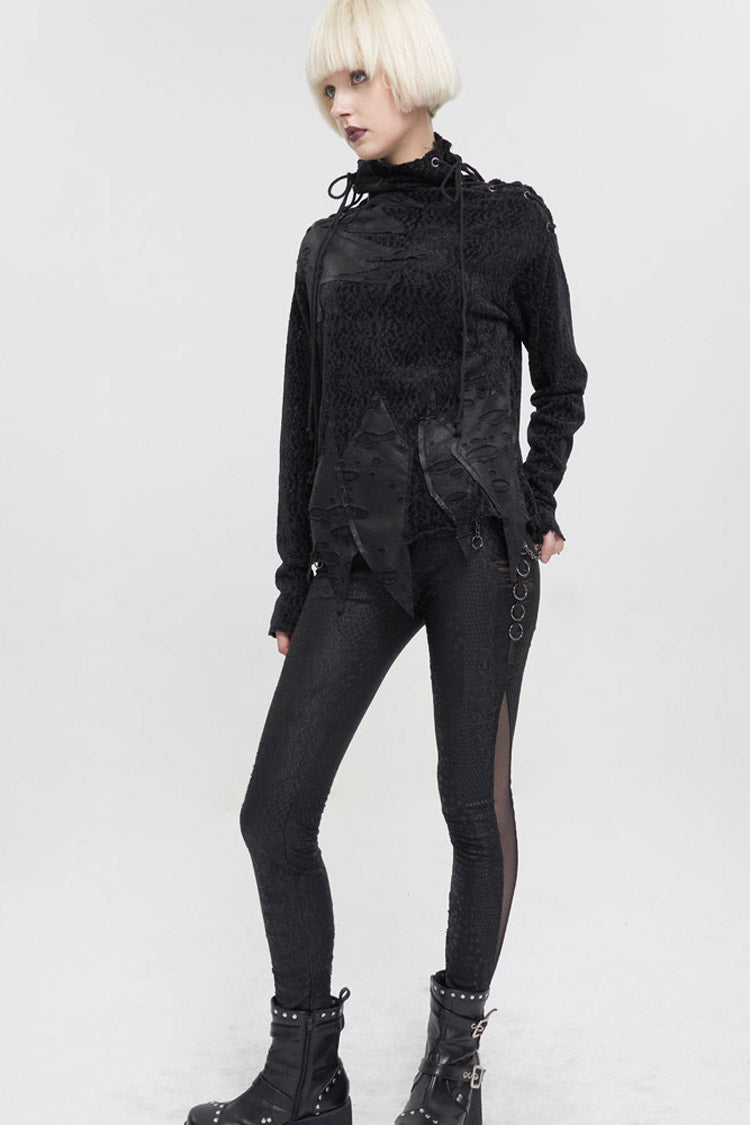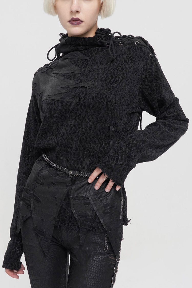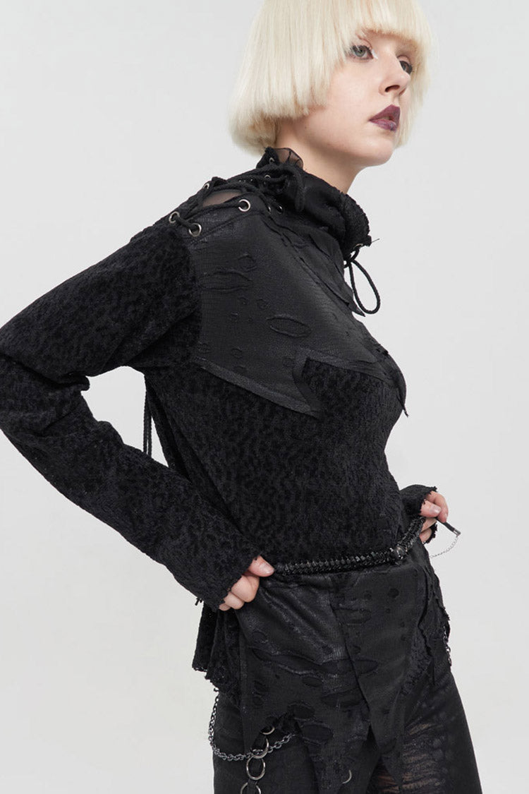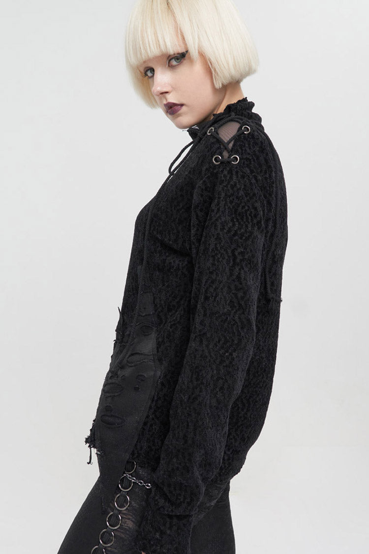 The main fabric is a fleece-like wool fabric spliced with distressed and ripped knits. The shoulders are divided on both sides, the fine mesh is connected, and the metal eyelets are threaded. The irregular sharp corners of the hem can be trimmed at will.