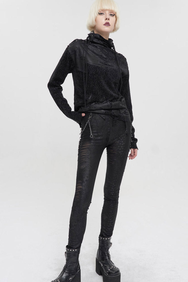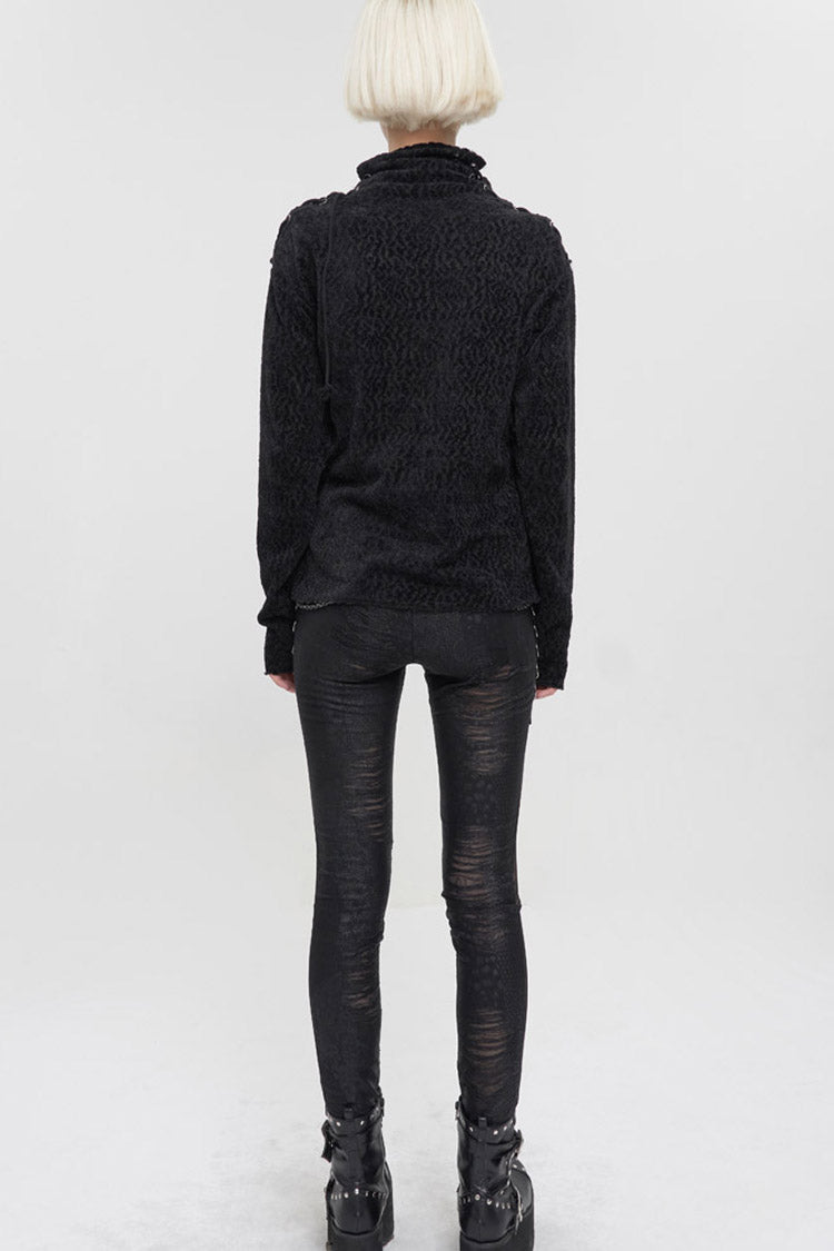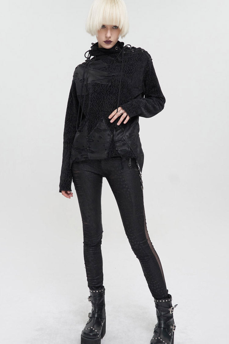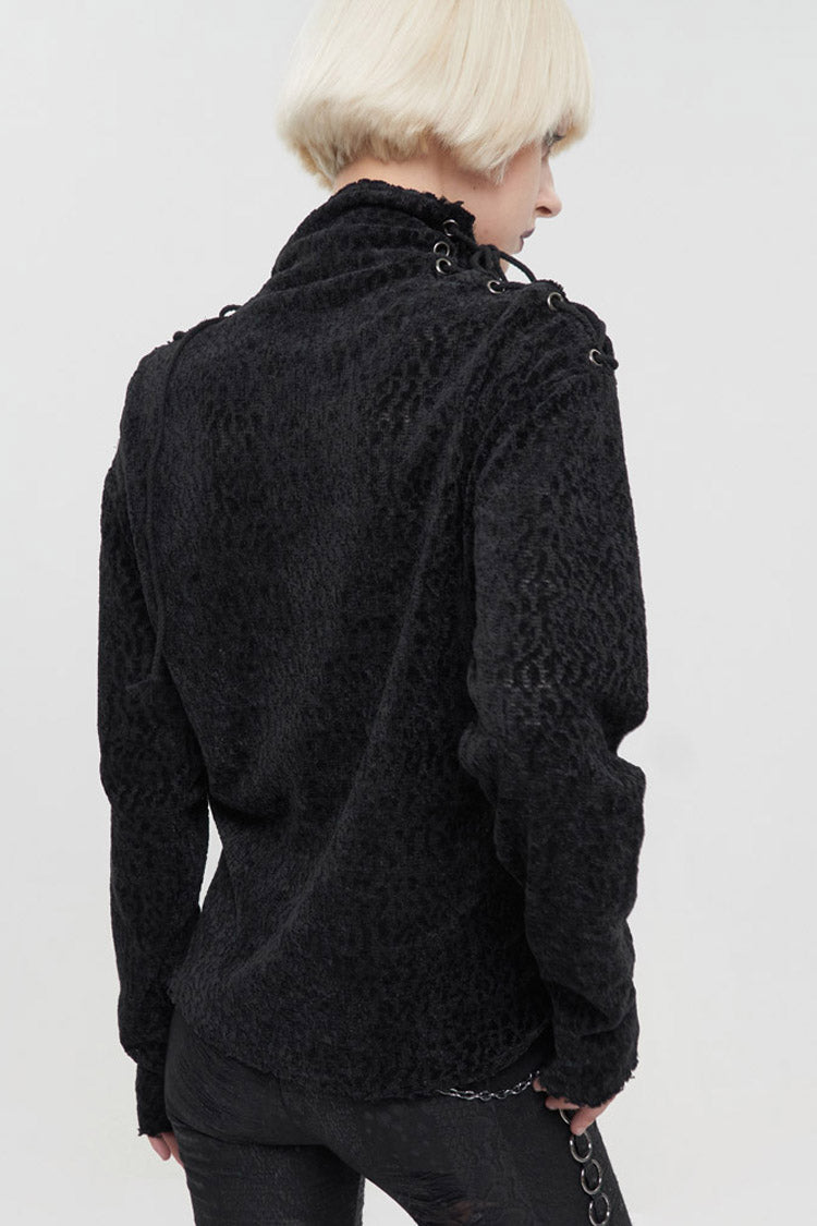 The main fabric is a fleece-like wool fabric spliced with distressed and ripped knits. The shoulders are divided on both sides, the fine mesh is connected, and the metal eyelets are threaded. The irregular sharp corners of the hem can be trimmed at will.