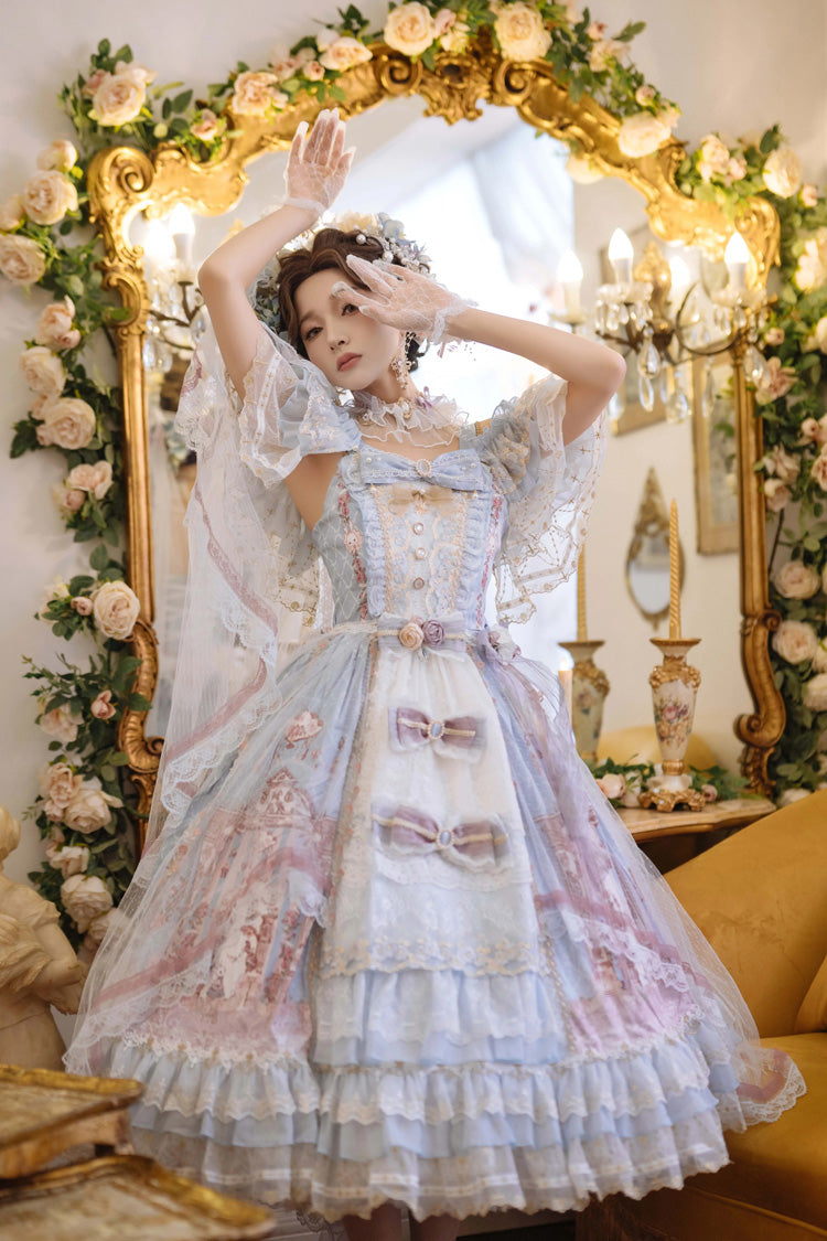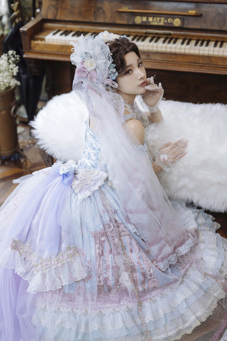 Include: Dress + Bow Decoration + Sheer Overlay + Train + Large Back Bow + Detachable Flutter Sleeves + Veil + Floral Headpiece