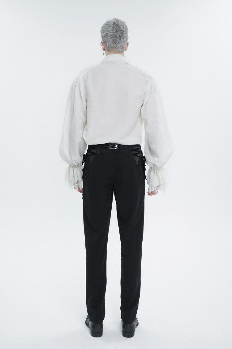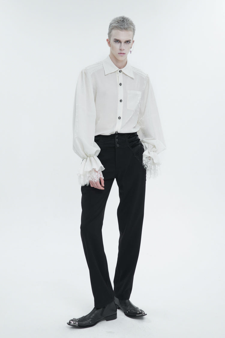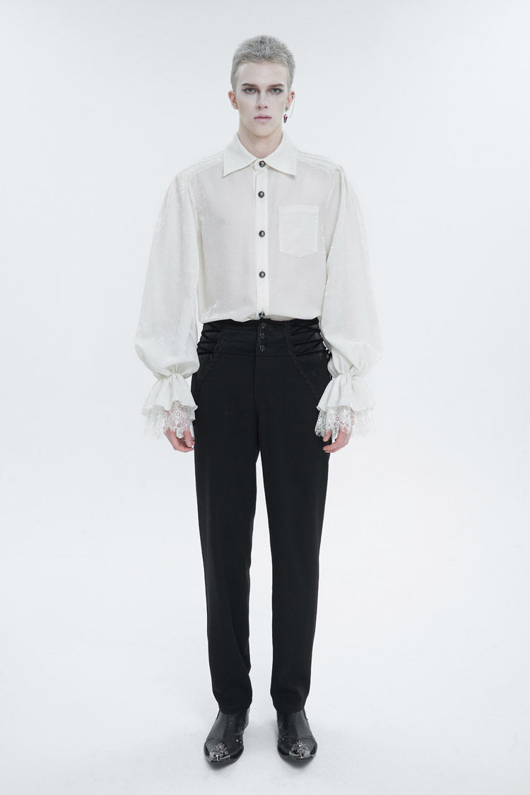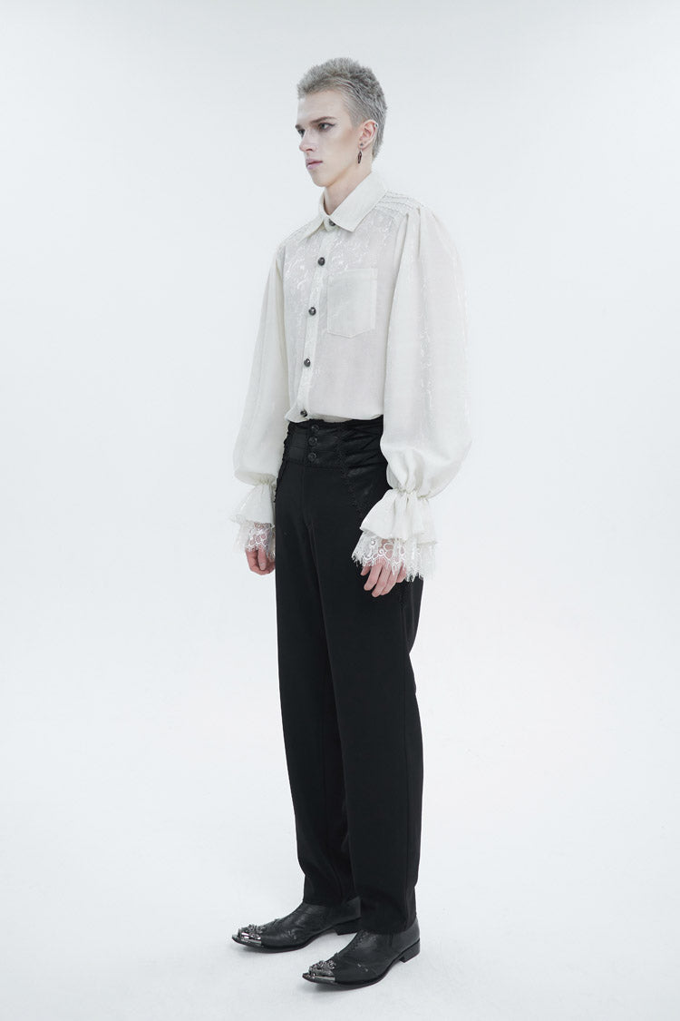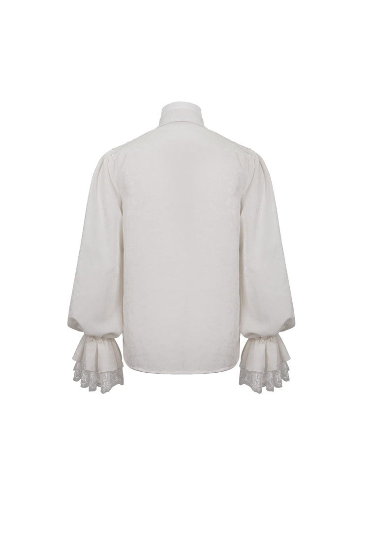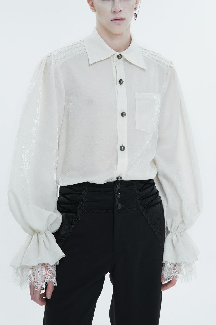 This gothic shirt is a turn-down collar and puff sleeves. Flared cuffs patchwork with lace. Weaves trim embellished shoulder. Detailed buttons for closure. Floral embossing on the fabric.