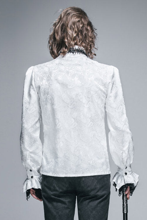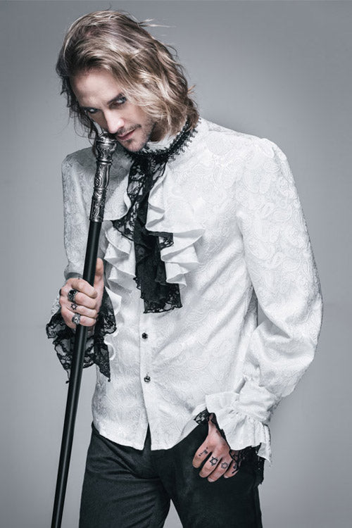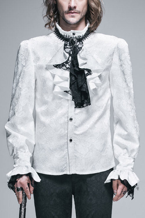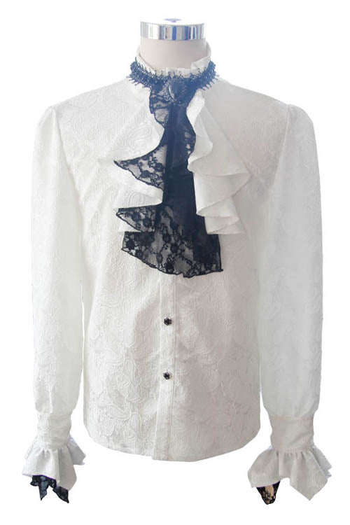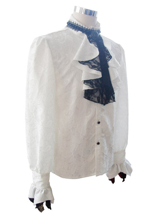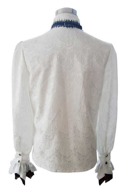 The main fabric is made of white Paisley jacquard shining material, matching with lace fabric of black rose mesh. The bow tie is made of black three-dimensional lace with beads, and the bow tie can be removed.The jewel pin on the bow tie can also be removed.