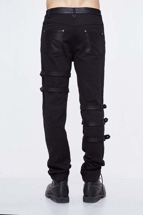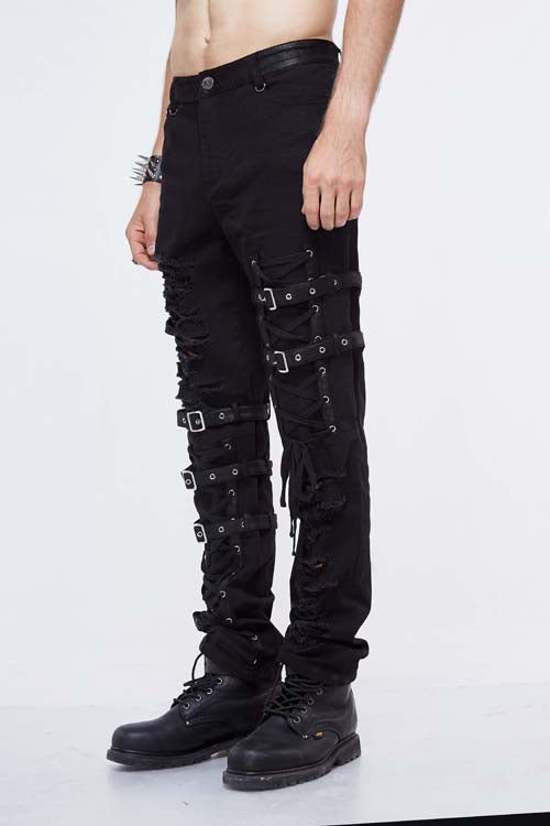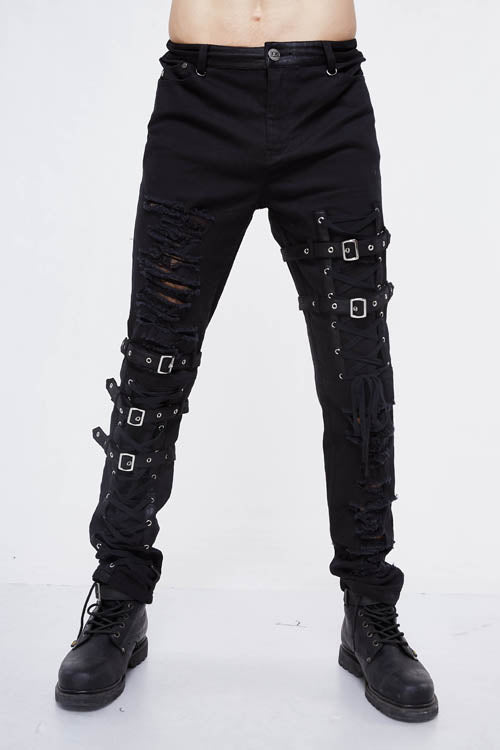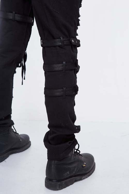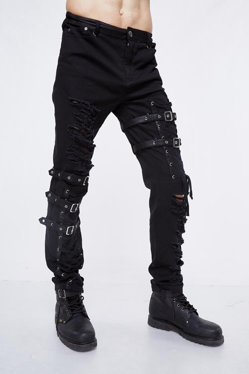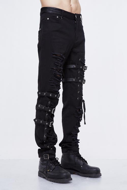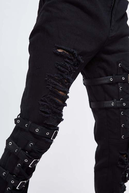 The whole piece trouser is made of black twill fabric, with asymmetrical lacerated holes on both sides of pant legs and staggered high and low tying ropes for loop.After washing water, it adds a sense of decadence and level.