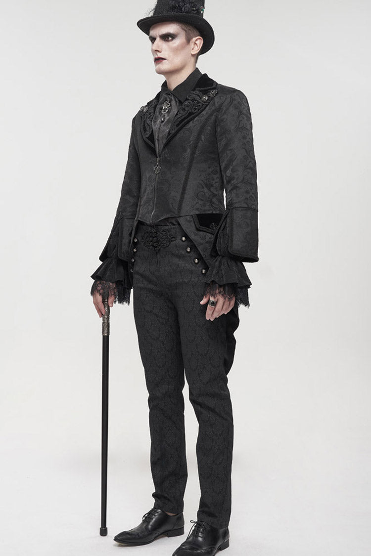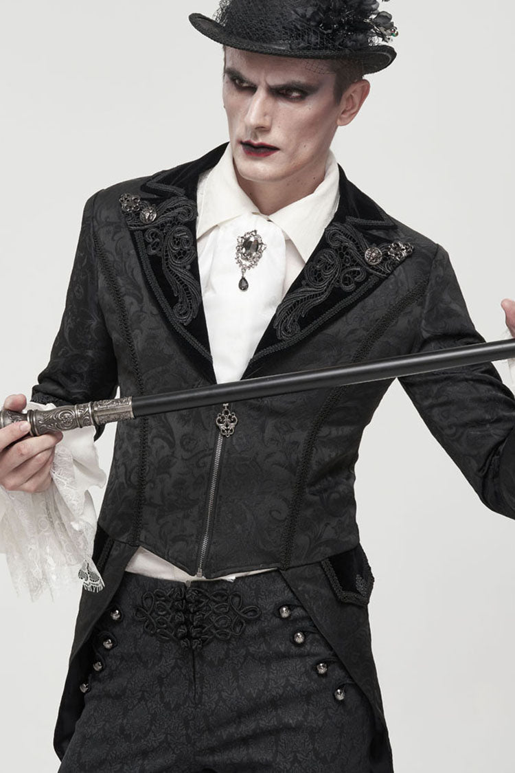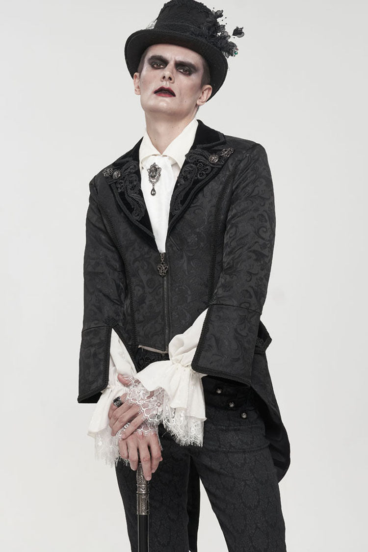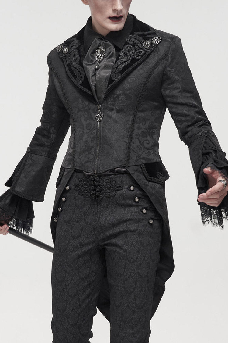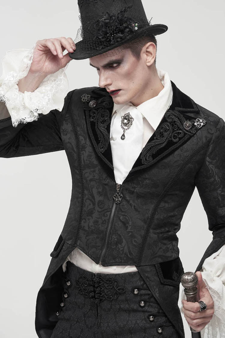 The main fabric is made of patterned texture is a woven fabric, stitched with velvet, and the tuxedo is short in the front and long in the back. The collar is decorated with appliques, embellished with metal pattern buttons, and nine-quarter sleeves, suitable for wearing flared sleeves or lantern sleeves shirts inside. The center back rope can be used to adjust the circumference slightly. Pockets on both sides design.