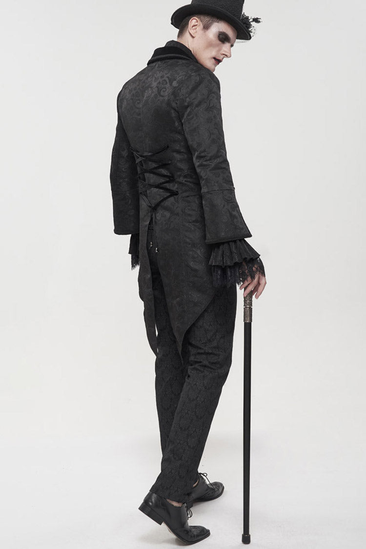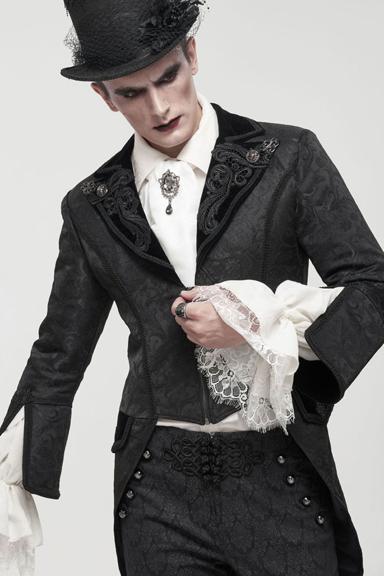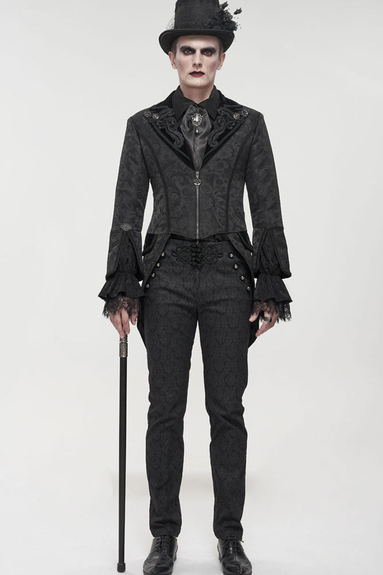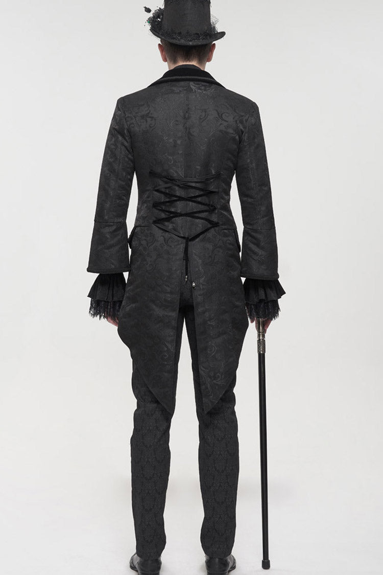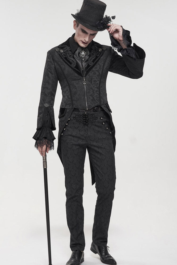 The main fabric is made of patterned texture is a woven fabric, stitched with velvet, and the tuxedo is short in the front and long in the back. The collar is decorated with appliques, embellished with metal pattern buttons, and nine-quarter sleeves, suitable for wearing flared sleeves or lantern sleeves shirts inside. The center back rope can be used to adjust the circumference slightly. Pockets on both sides design.