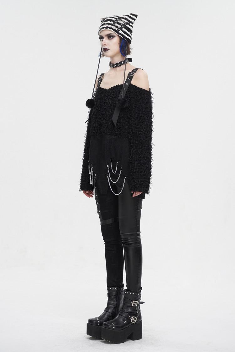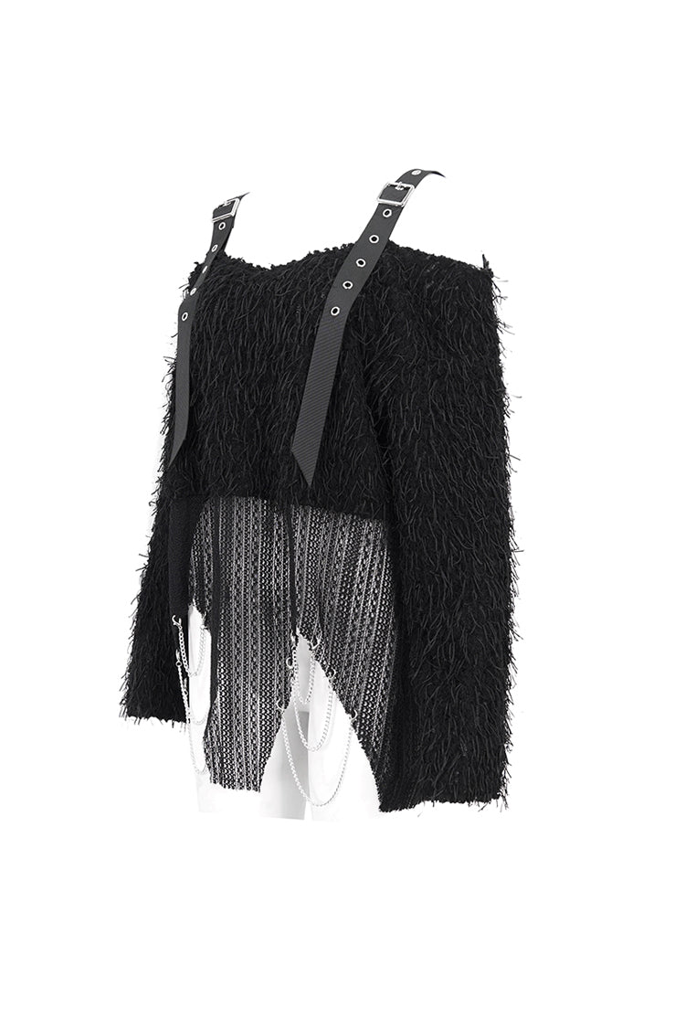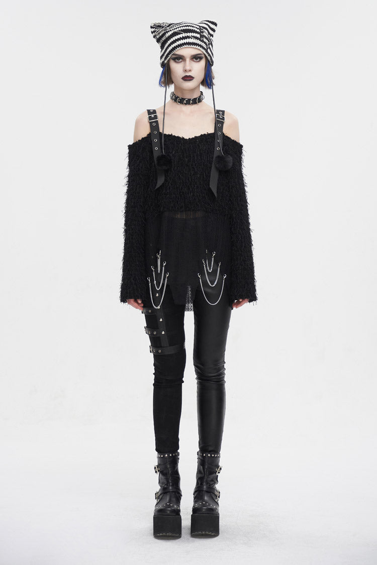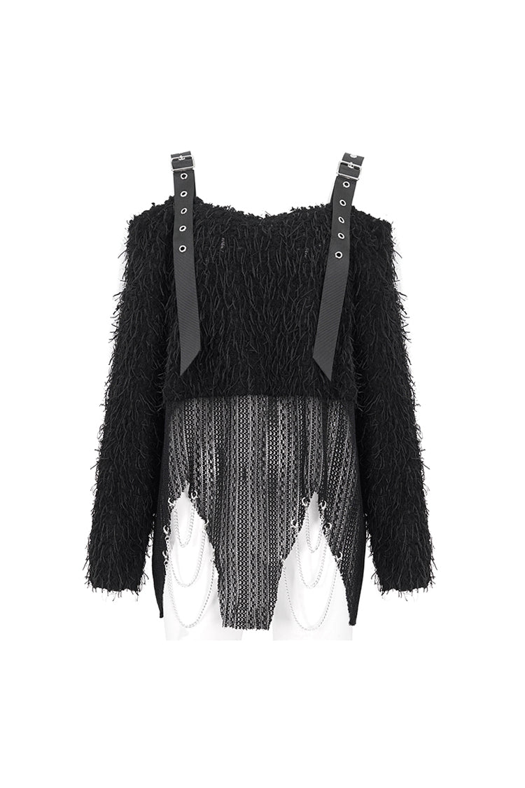 This punk sweater is off-shoulder and has two buckle straps on the shoulders. The surface of the fabric is covered with many ribbons. It has an irregular hem and multi-chains.