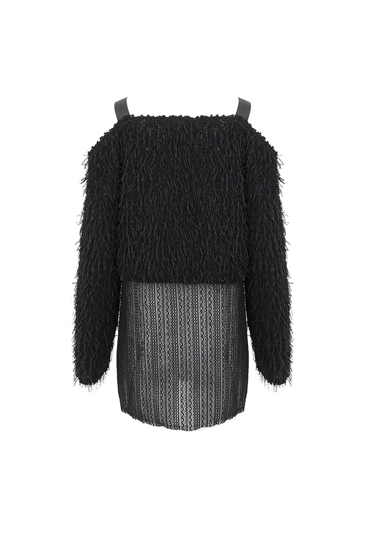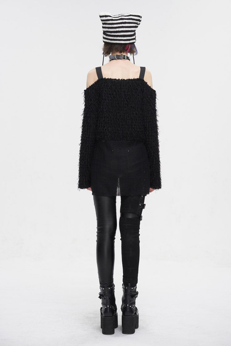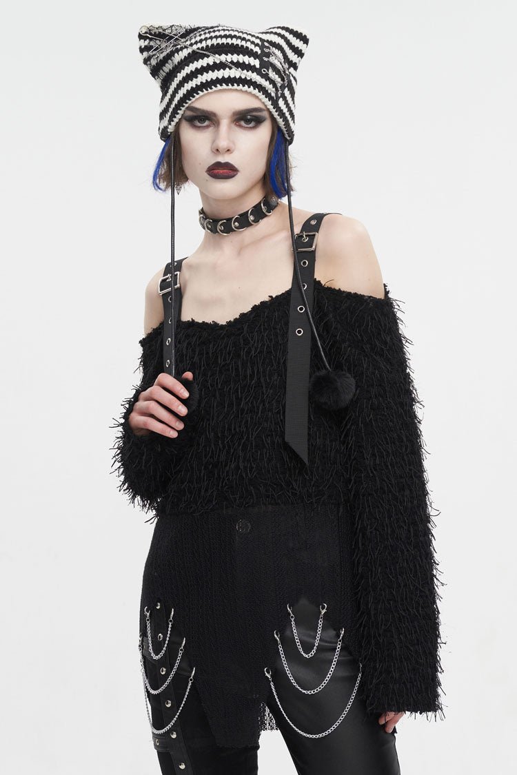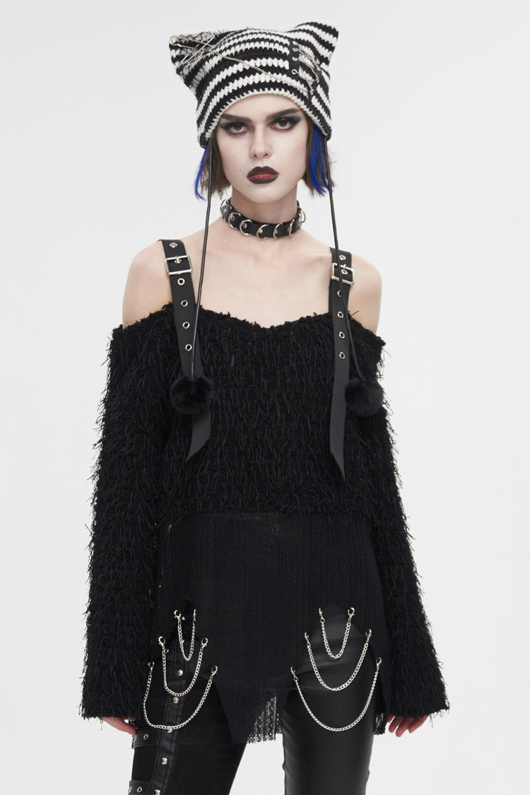 This punk sweater is off-shoulder and has two buckle straps on the shoulders. The surface of the fabric is covered with many ribbons. It has an irregular hem and multi-chains.
