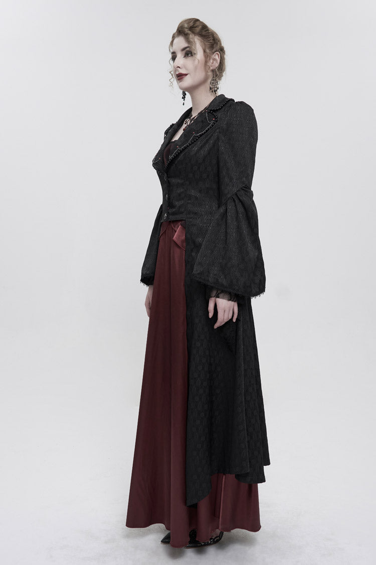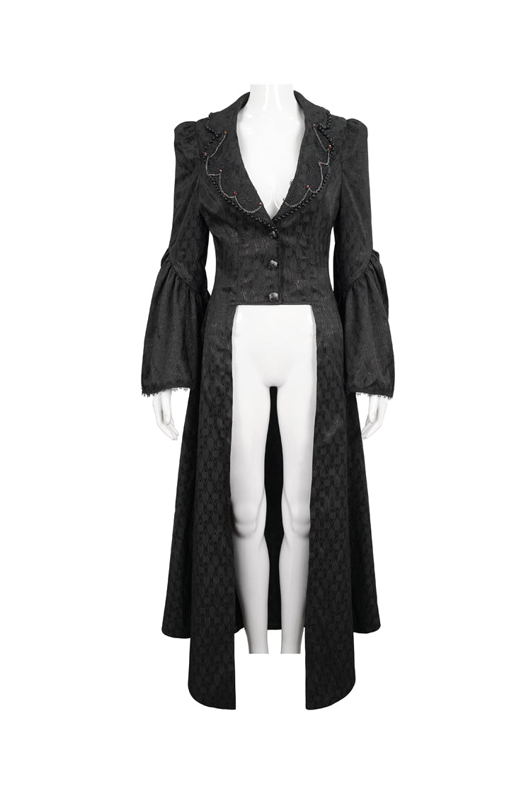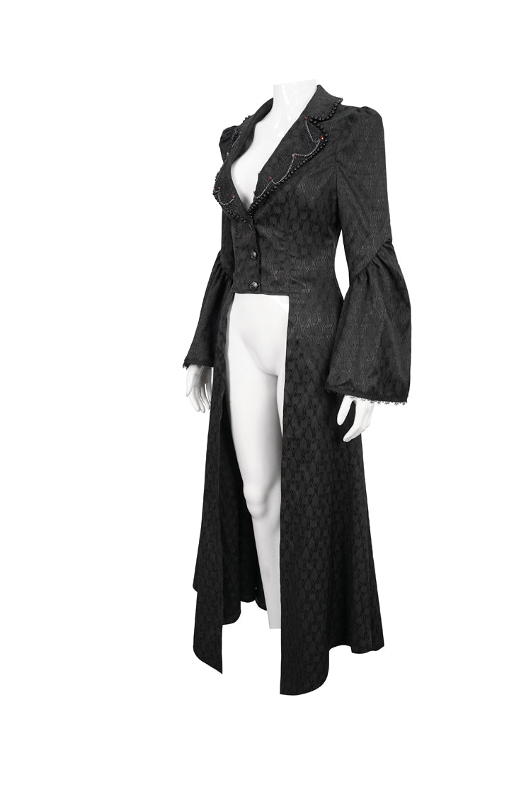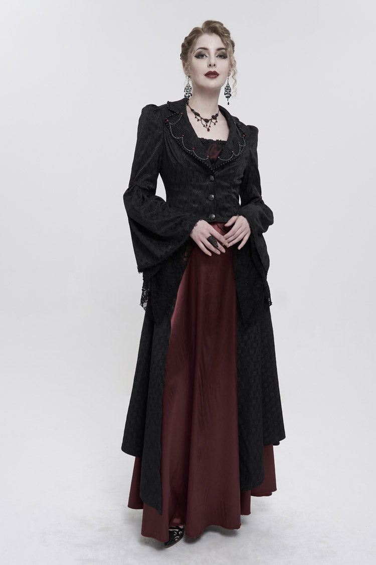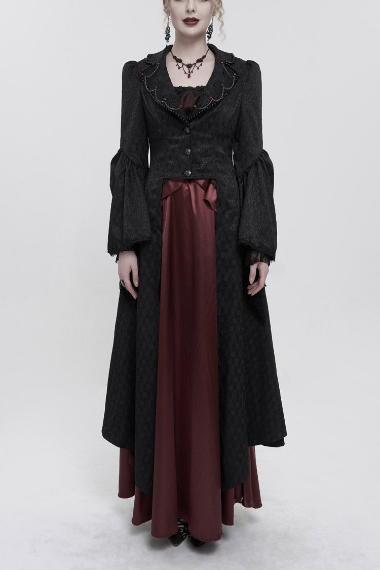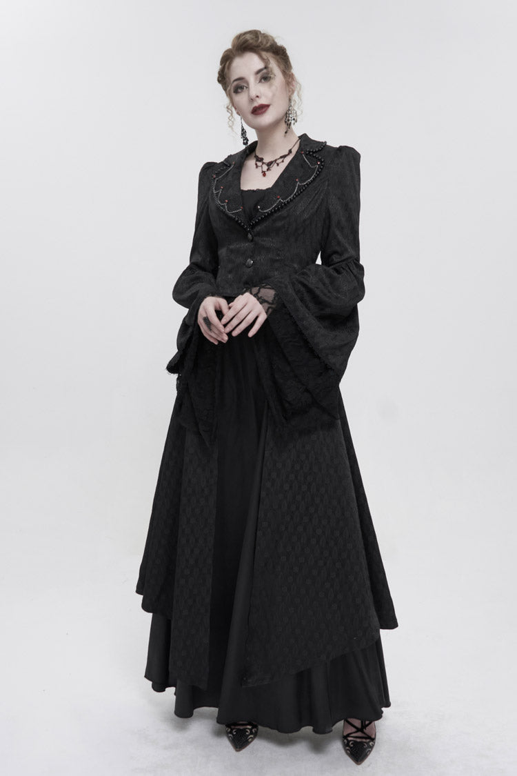 The main fabric is made of dark-grained jacquard fabric, which feels good in hand and looks exquisite. Short at the front and long at the back, it can be worn over a full-length dress. The collar appliqués are embellished with chains and red diamonds, with rich layers and attractive details. It can be worn everyday or with a dress for all seasons.