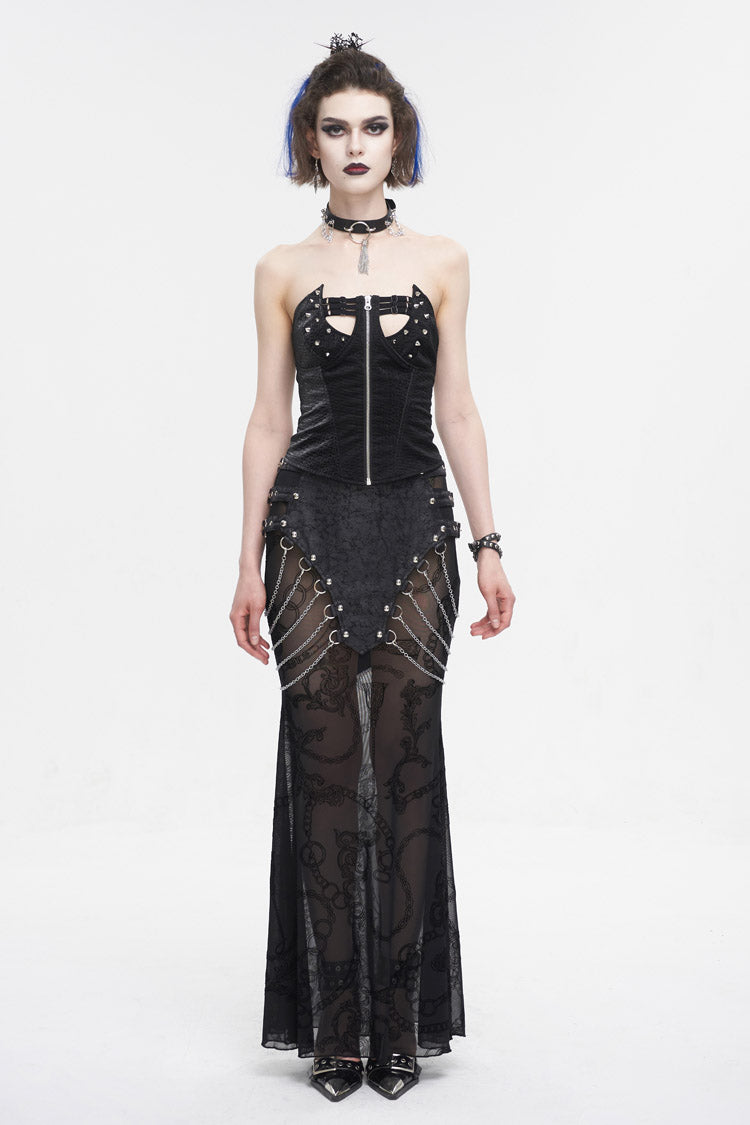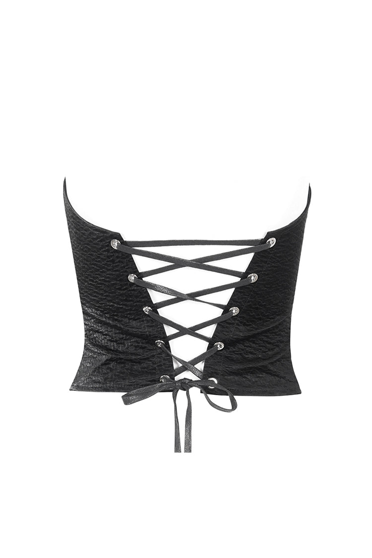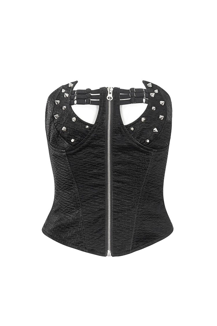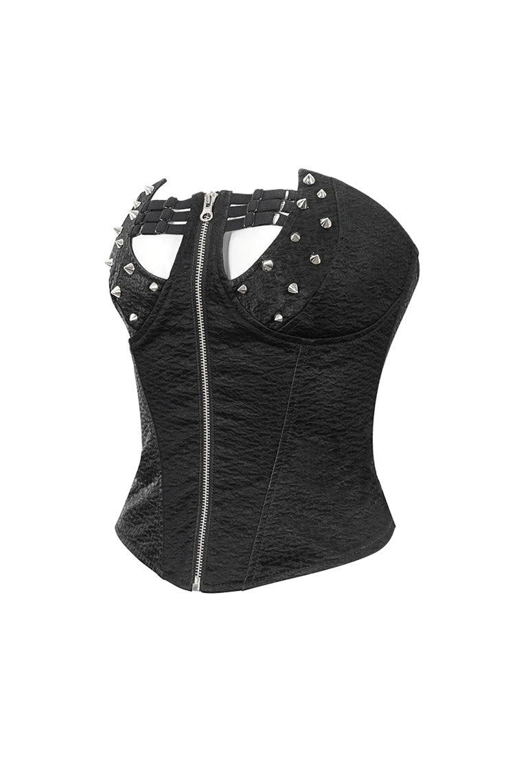 This punk overbust corset has an irregular neckline. Detailed design with studs and elastic bands on the chest. Zipper on the front for closure and lace-up on the back for adjustment.