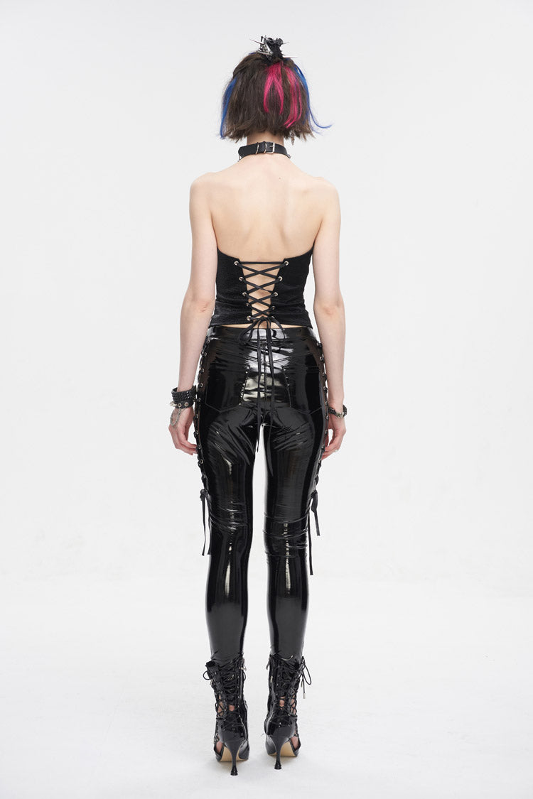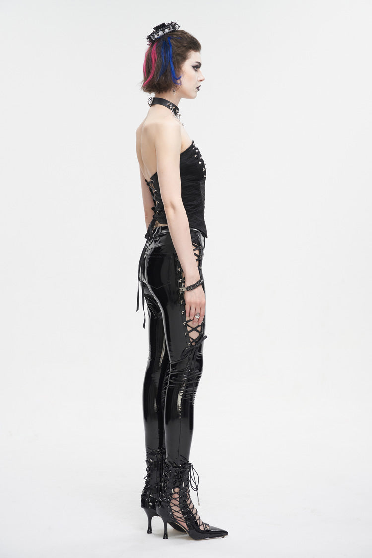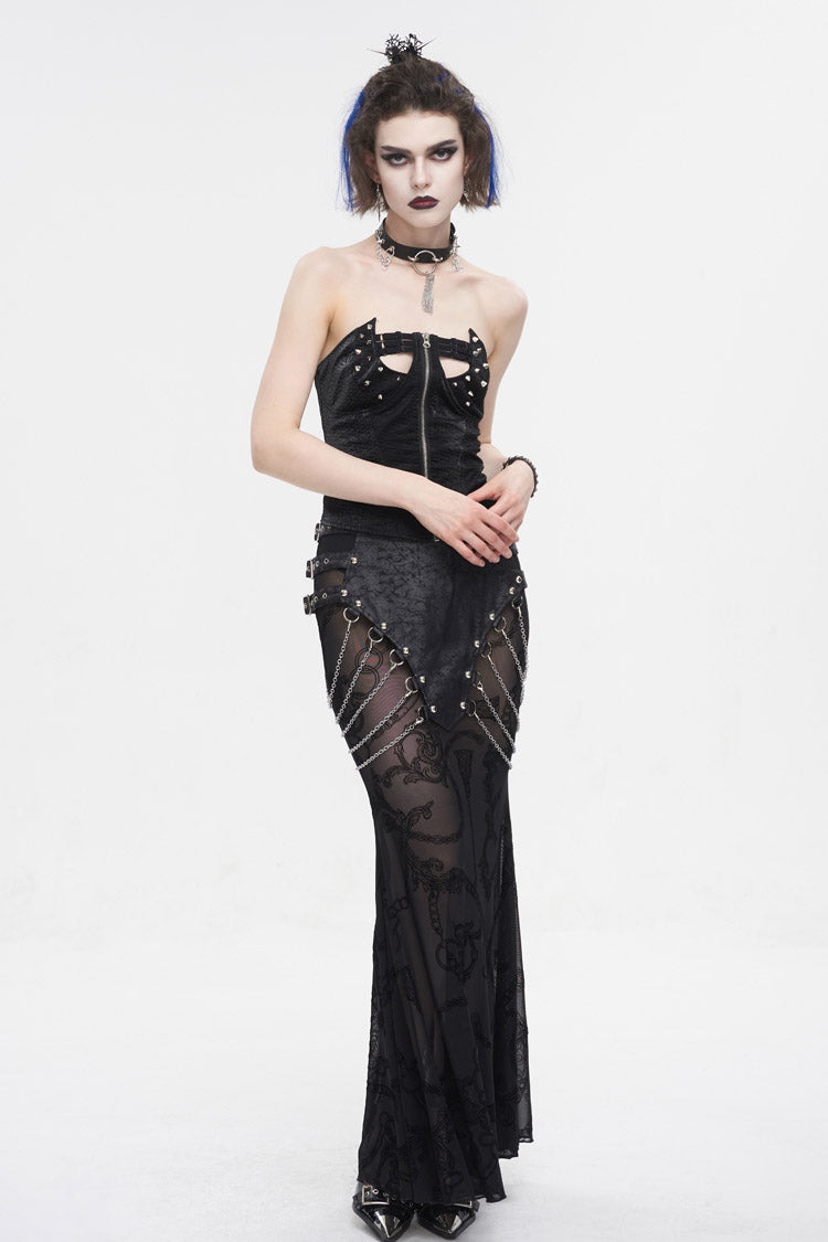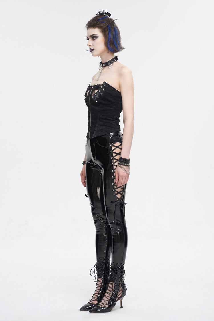 This punk overbust corset has an irregular neckline. Detailed design with studs and elastic bands on the chest. Zipper on the front for closure and lace-up on the back for adjustment.