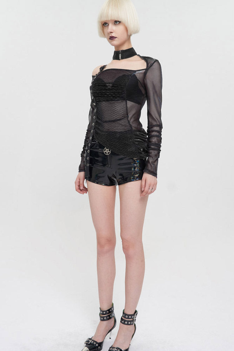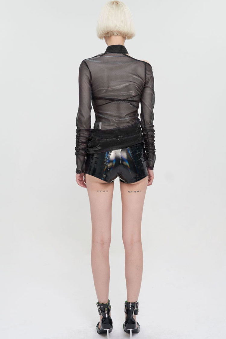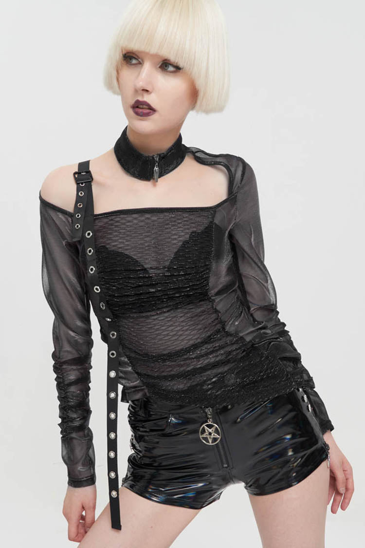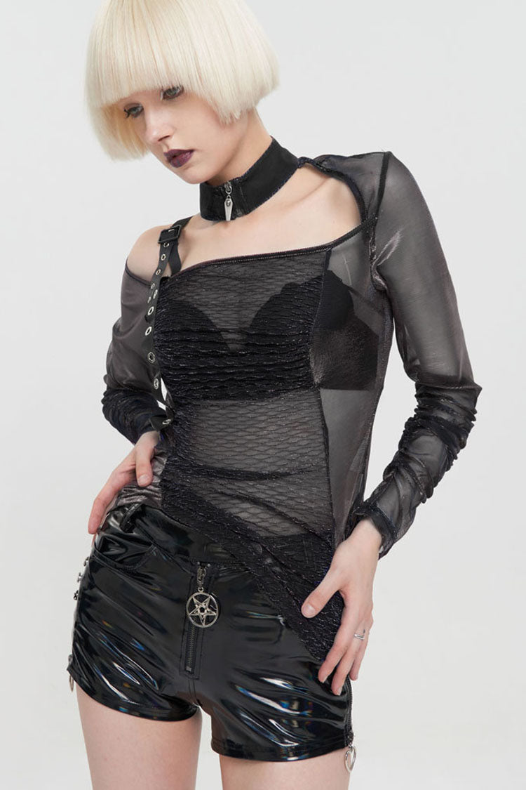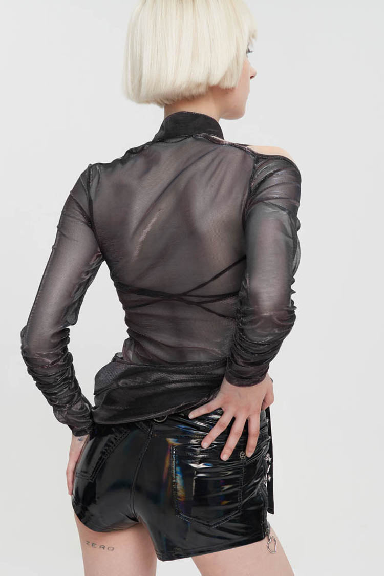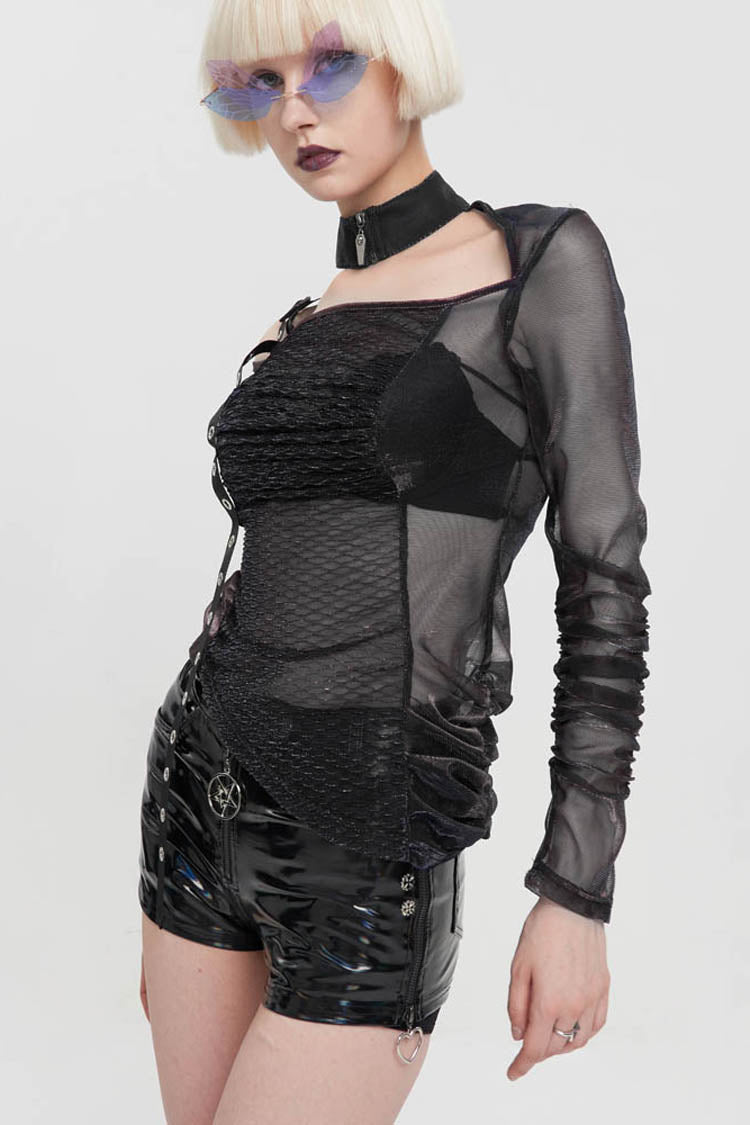 Plain black mesh with wavy pattern color-changing mesh, neck zipper can be opened, and shoulder straps can be adjusted in length. Pleated cuffs.
