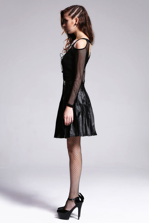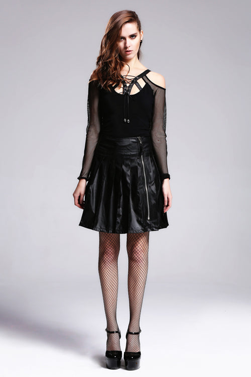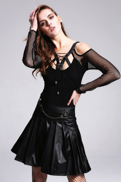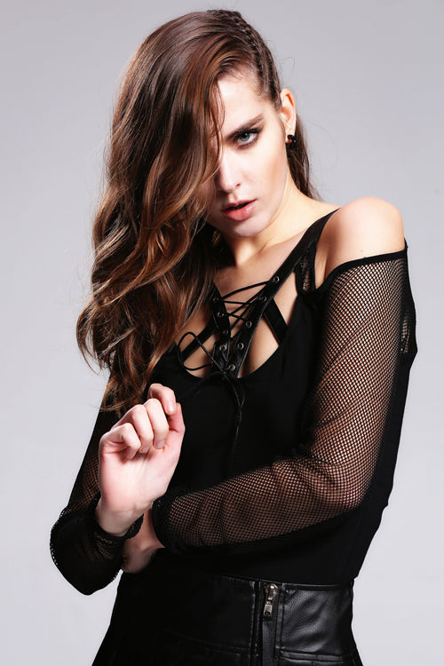 The main fabric is made of 40 pieces of Modal with good elasticity, matched with elastic mesh.Off the Shoulder design,the chest and the back are cross connected by leather fabric spliced,the corns are tied with rope.Suitable for spring and summer.