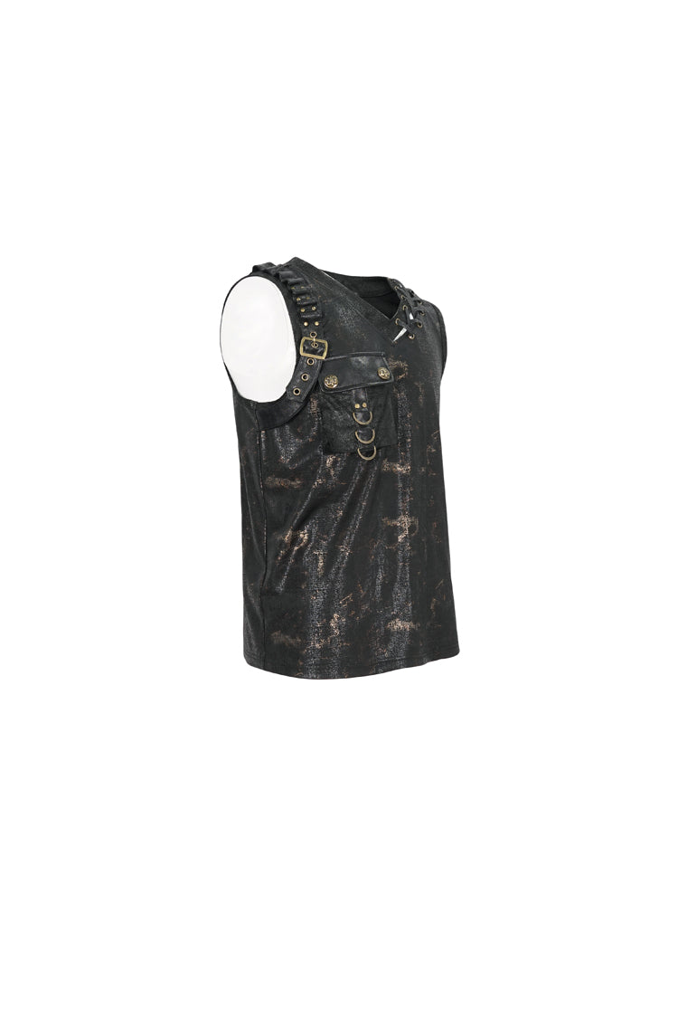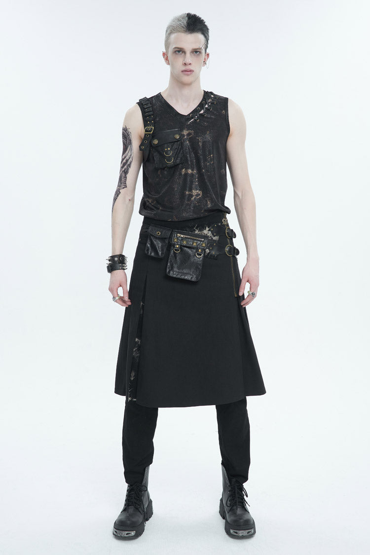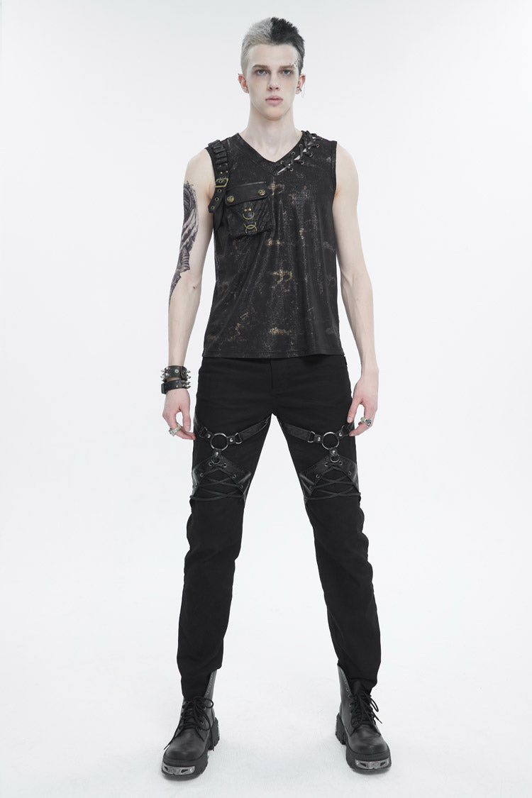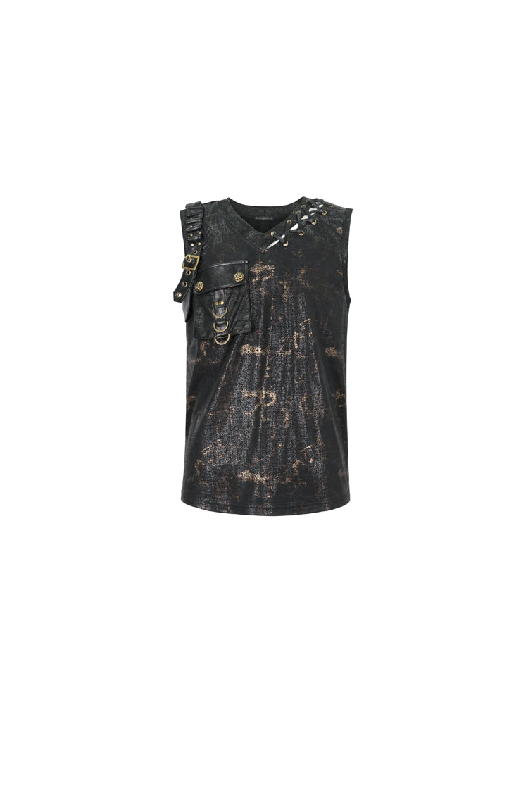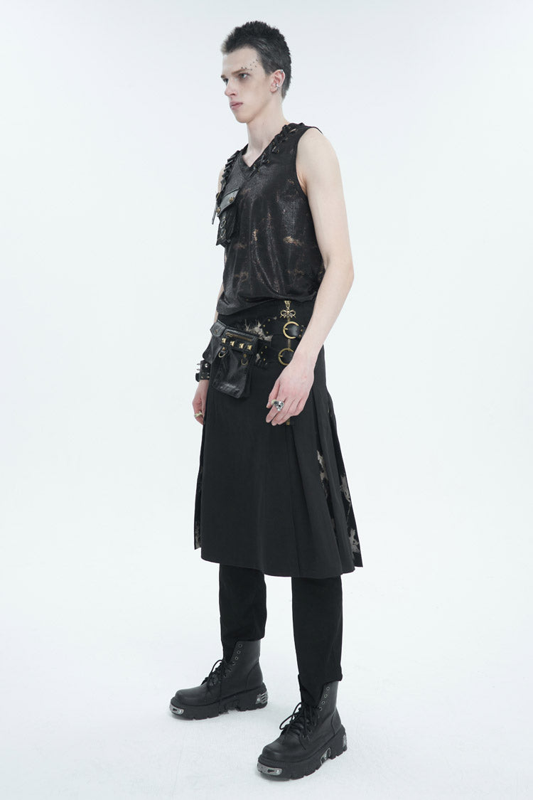 This punk T-shirt is short sleeves and patchwork with ripped fabric. Hollow-out on the left shoulder. A detachable strap connects from the front to the left shoulder.