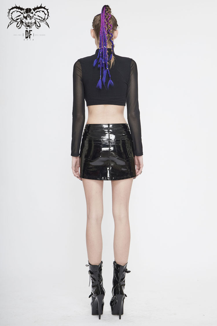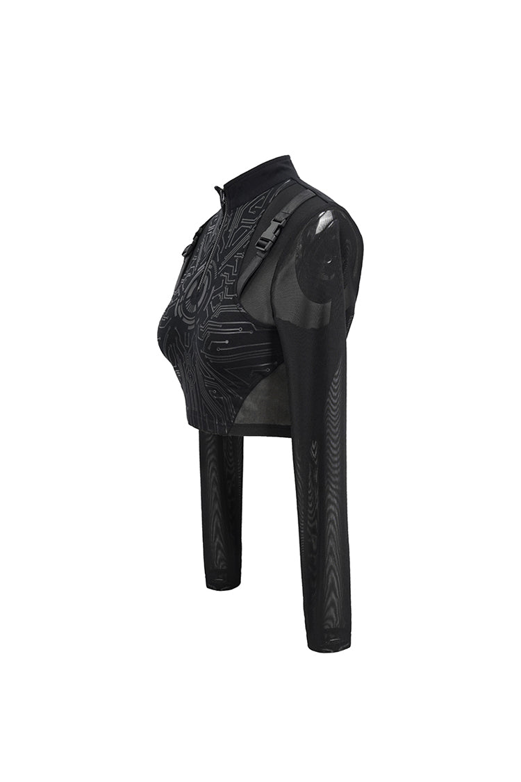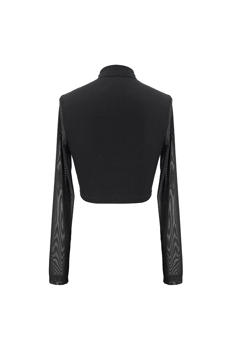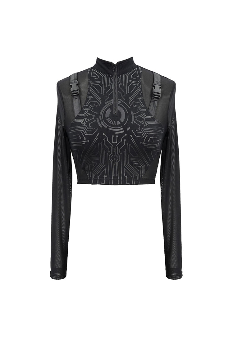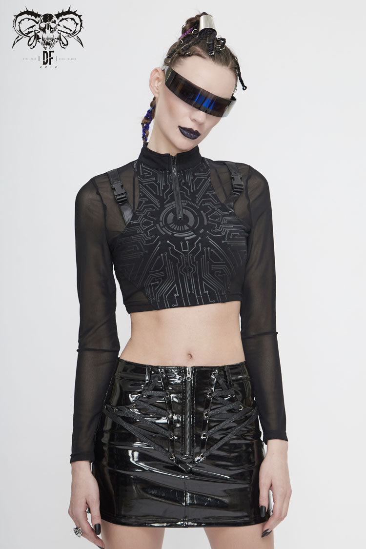 This gothic crop top, that will leave an impression is this long-sleeved one. It comes with a thin sheer mesh, and interesting Lace over the front and central part. With some of the unique details, it combines the Gothic with the futuristic style.