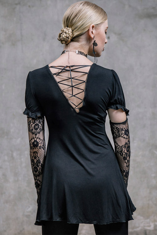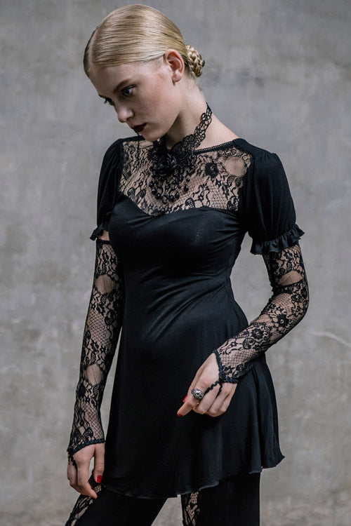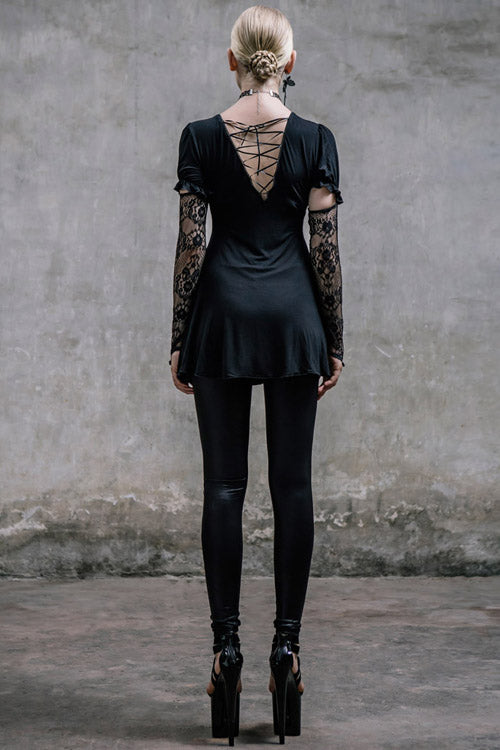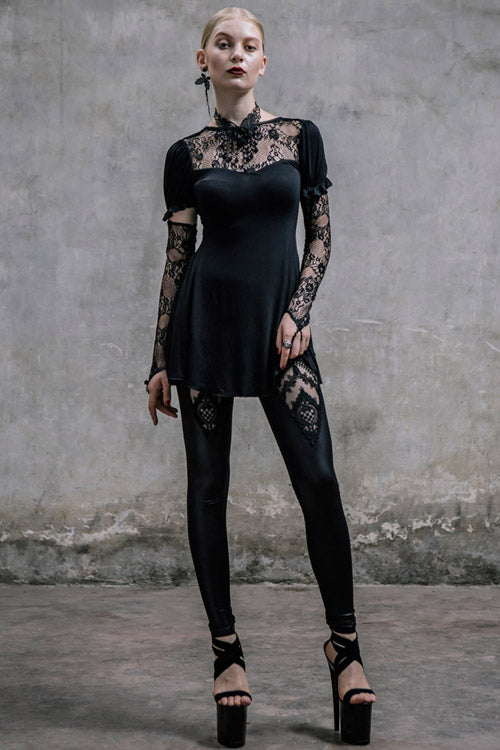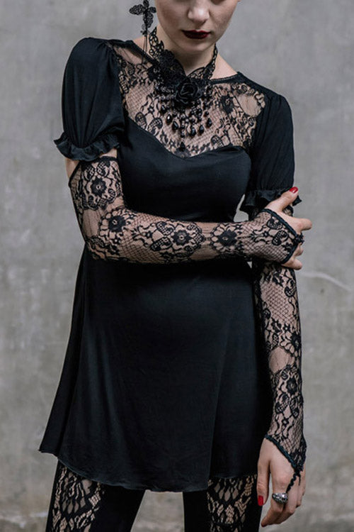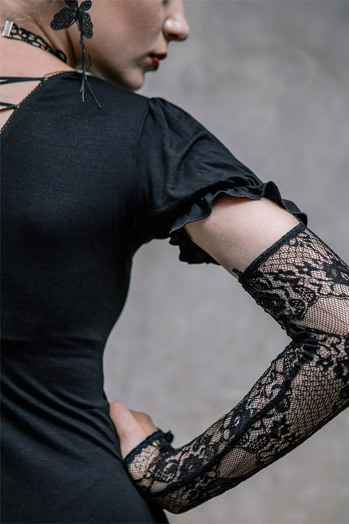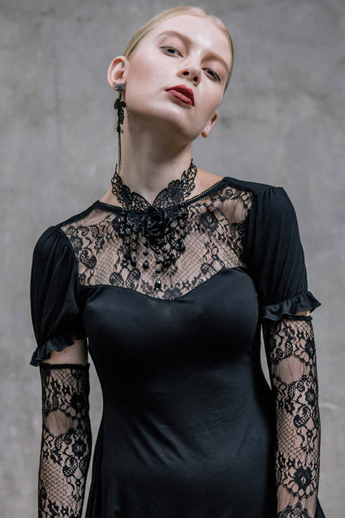 The main fabric is made of big elastic 40 pieces Modal fabric, stitched with gothic patterned lace fabric. The lace sleeves covering the fingers are fixed with buttons and bubble sleeves, which can be removed.V-shaped back cross-strap with hollow out back, rose bead necklace can be removed.