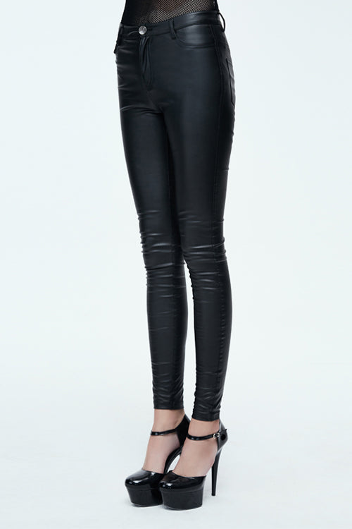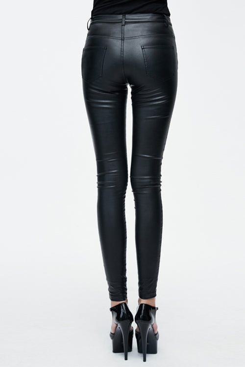 This simple style small feet tight-fitting trousers is made of elastic coarse grained imitated leather, suitable for daily wear.