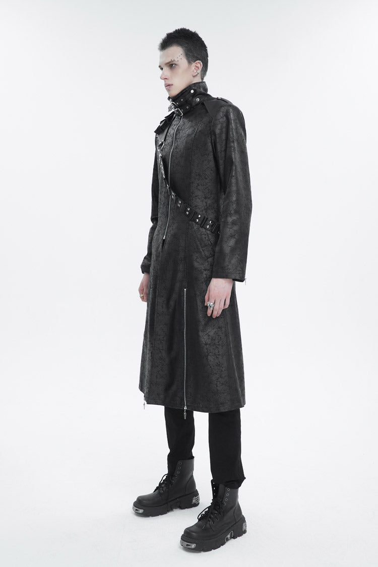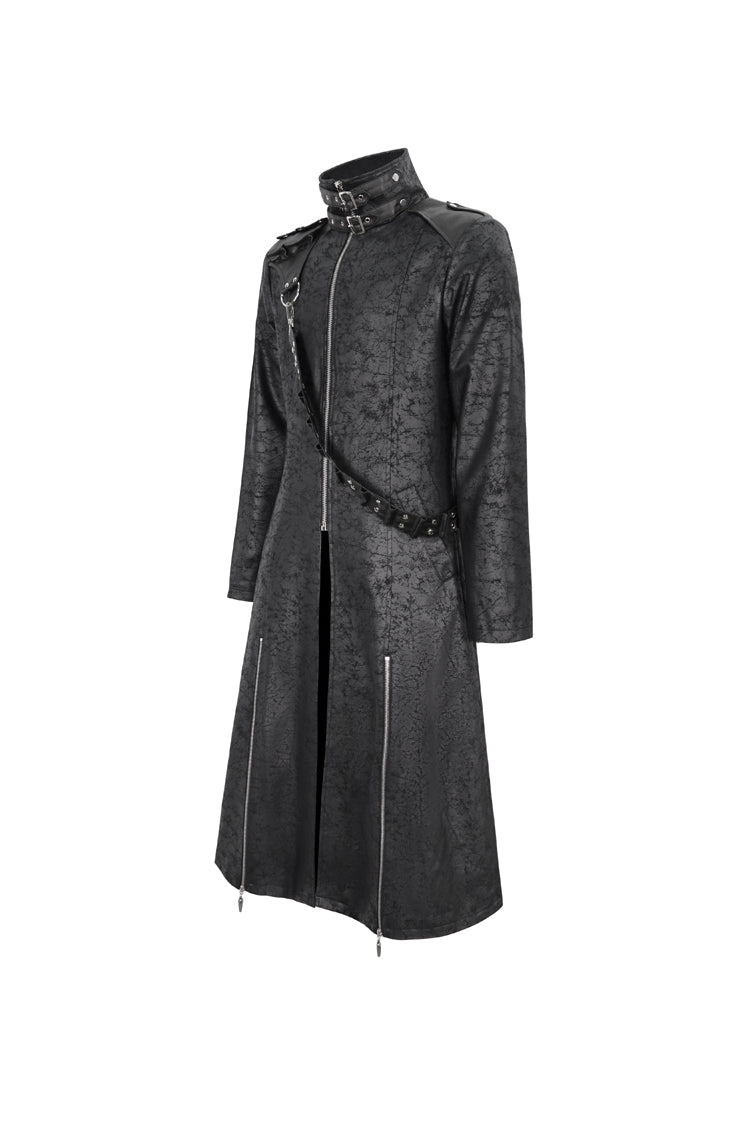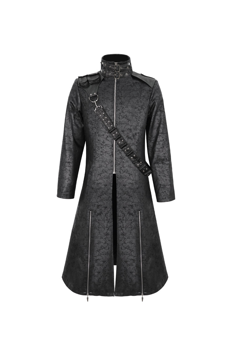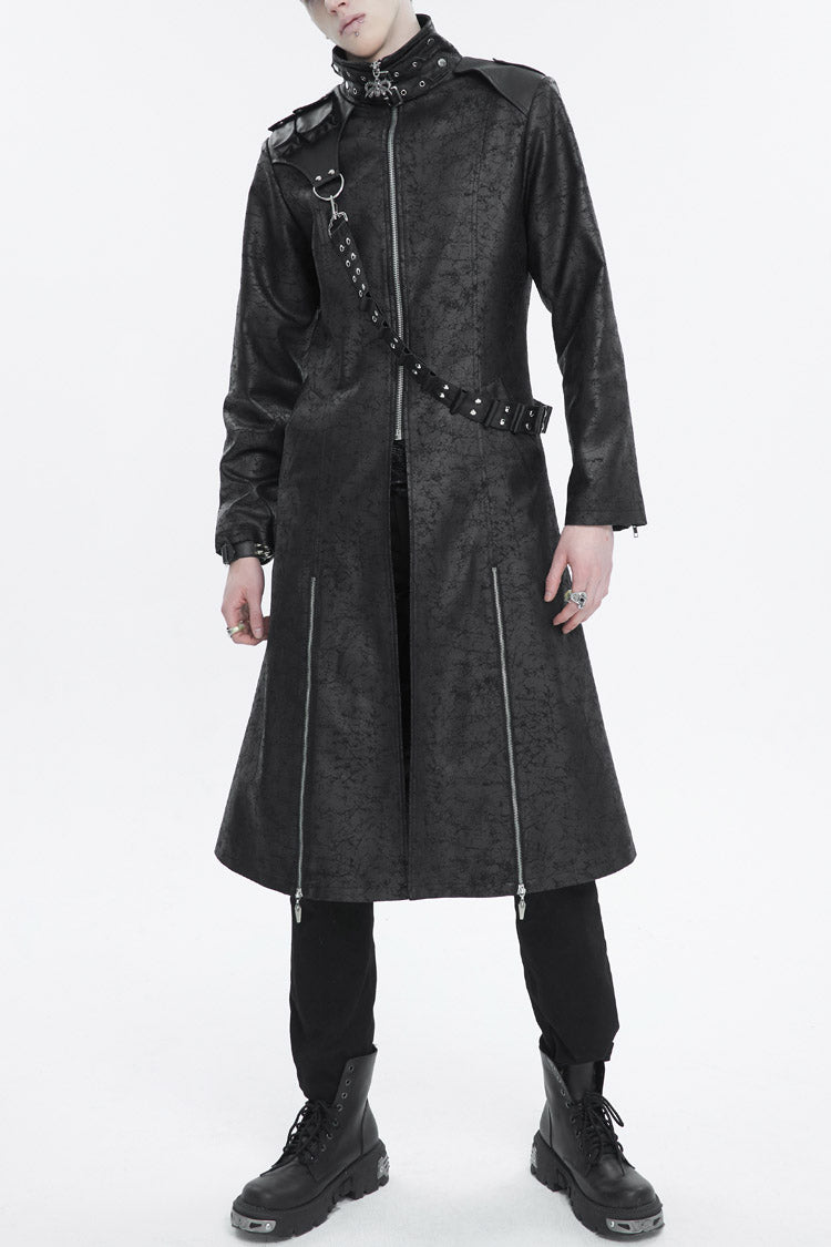 The gothic coat has a stand collar and a long strap. The collar has double-layered buckles. Zipper on the cuffs, two zippers split on the front, and a zipper for closure. A-line silhouette.