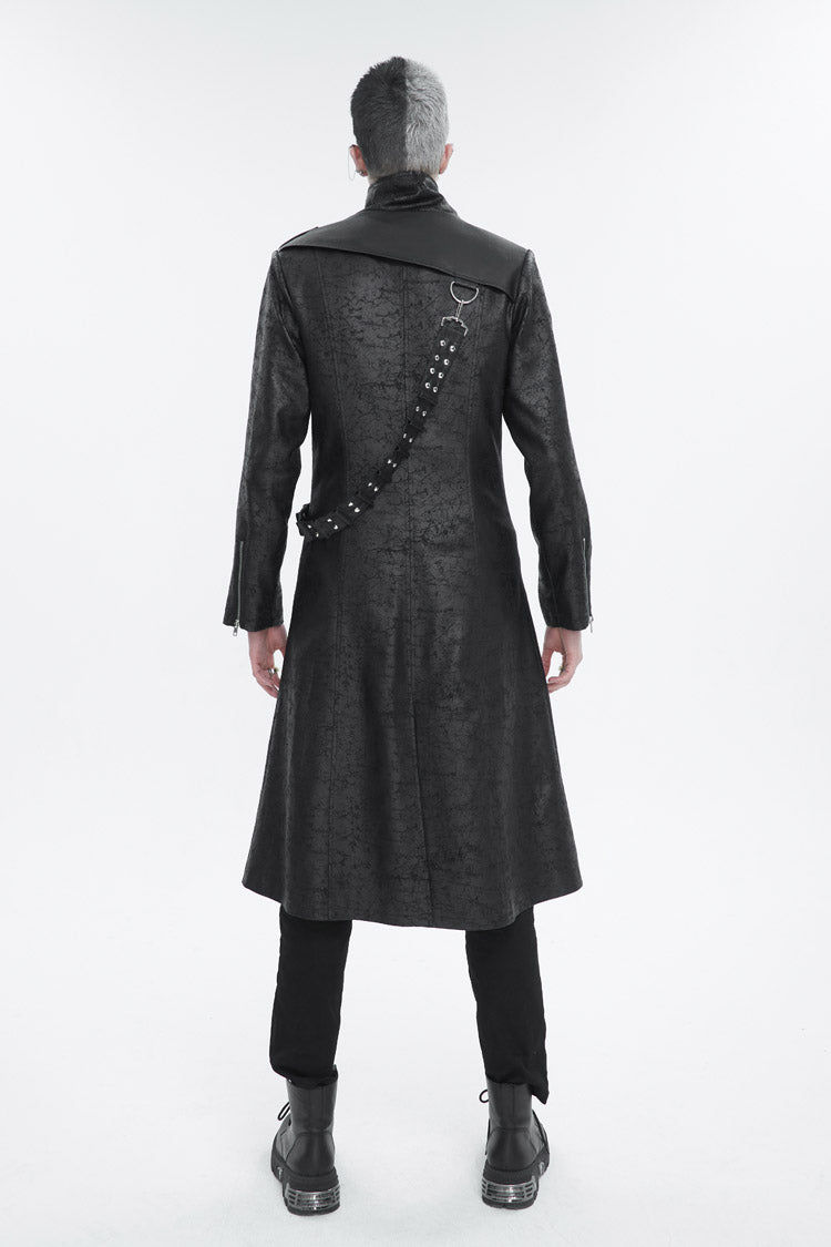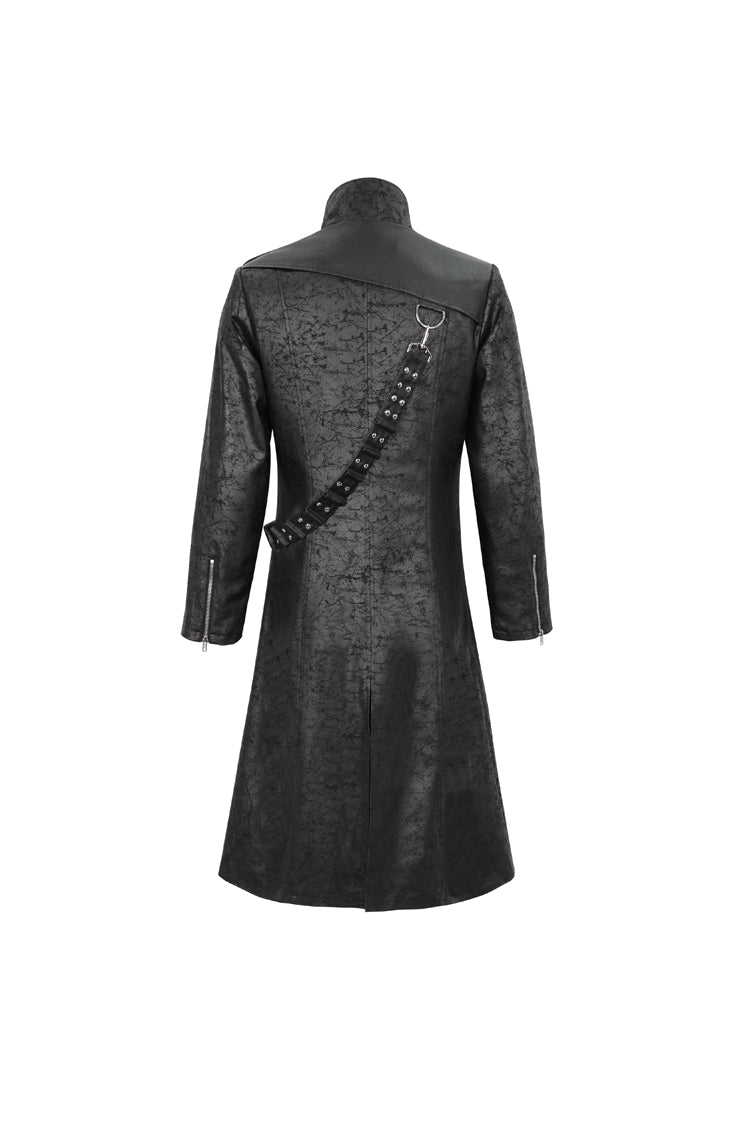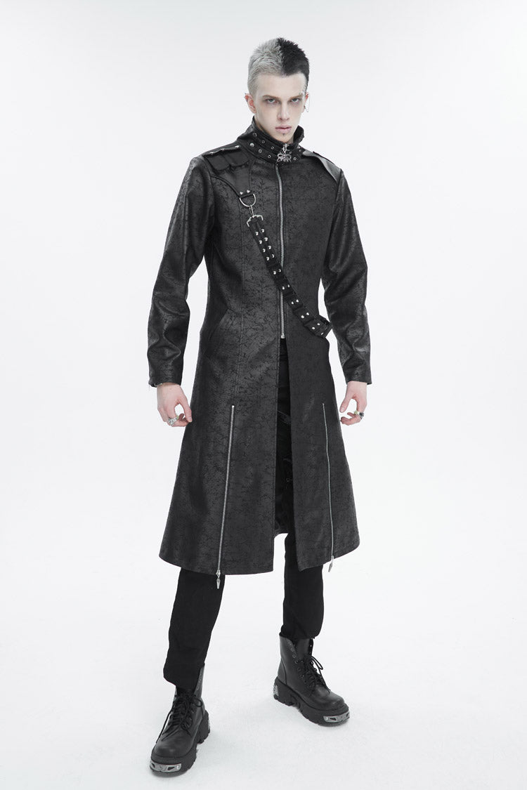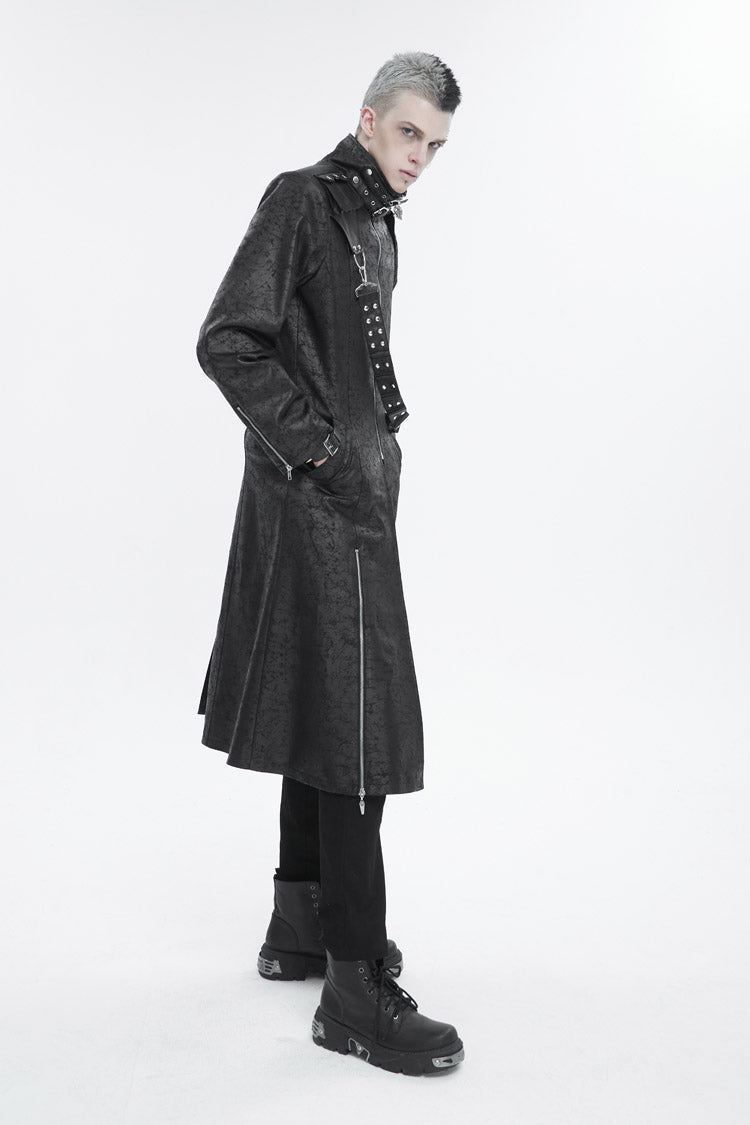 The gothic coat has a stand collar and a long strap. The collar has double-layered buckles. Zipper on the cuffs, two zippers split on the front, and a zipper for closure. A-line silhouette.