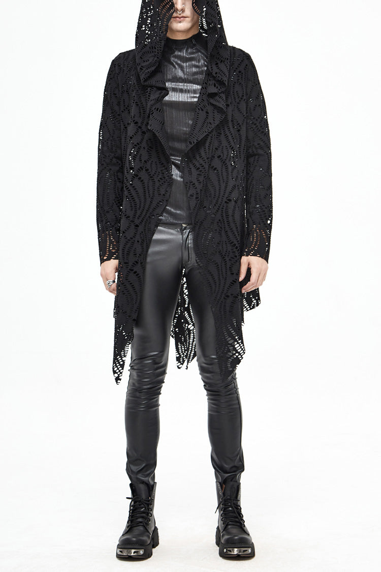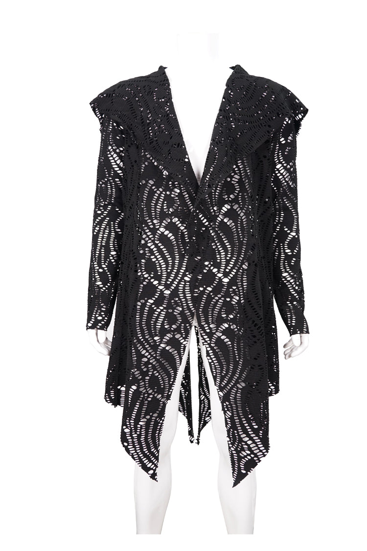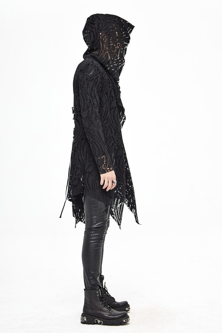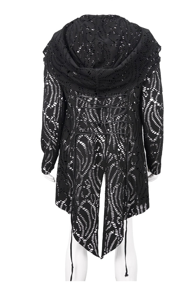 The main fabric is made of thin cloth with all holes, with a hooded version and a sharp hem. There are pockets on the side.