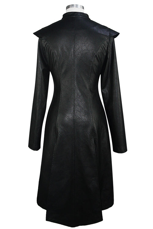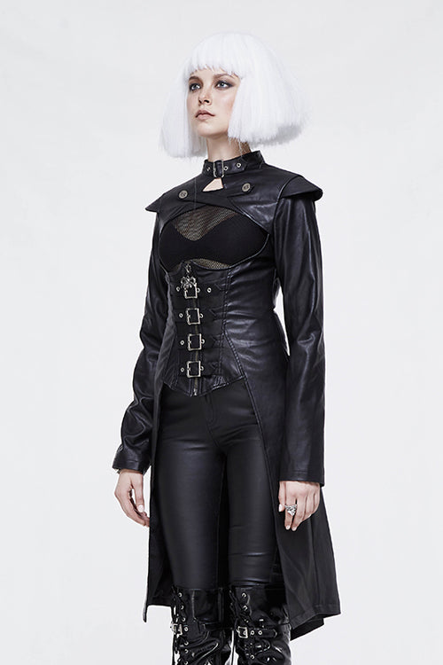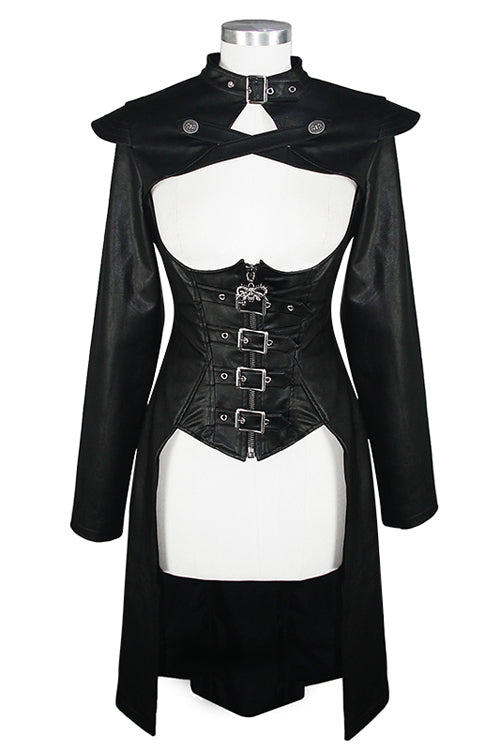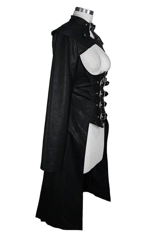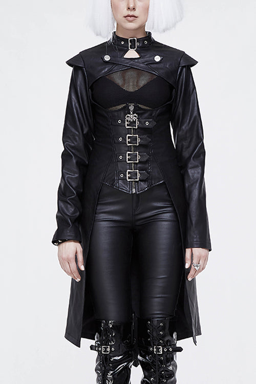 The whole piece is made of rough-textured leather. The cross leather loop on the chest can be opened, and the center front waist belt can be opened.