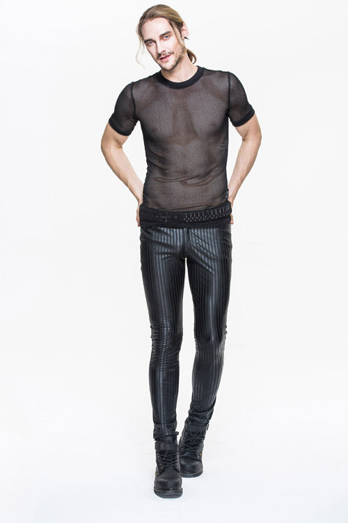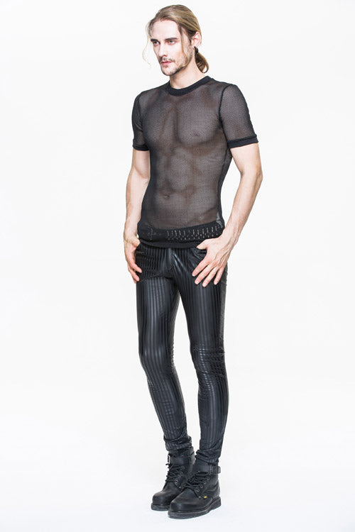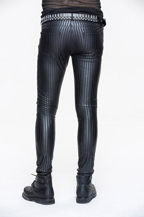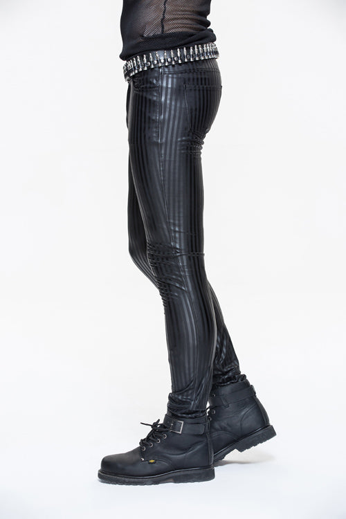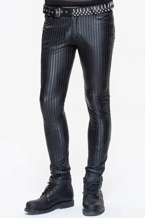 The whole piece is made of vertical stripe patterned super elastic leather design into tight basic style men trousers, suitable for daily wear in autumn and winter.