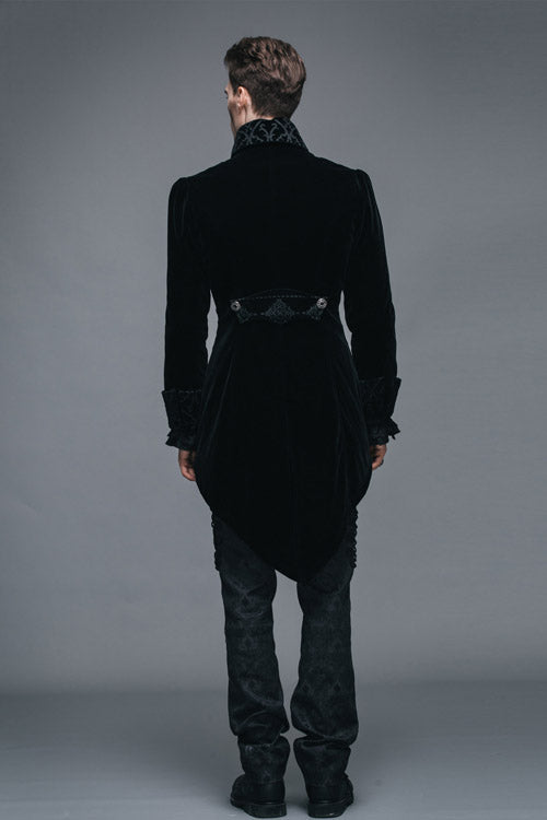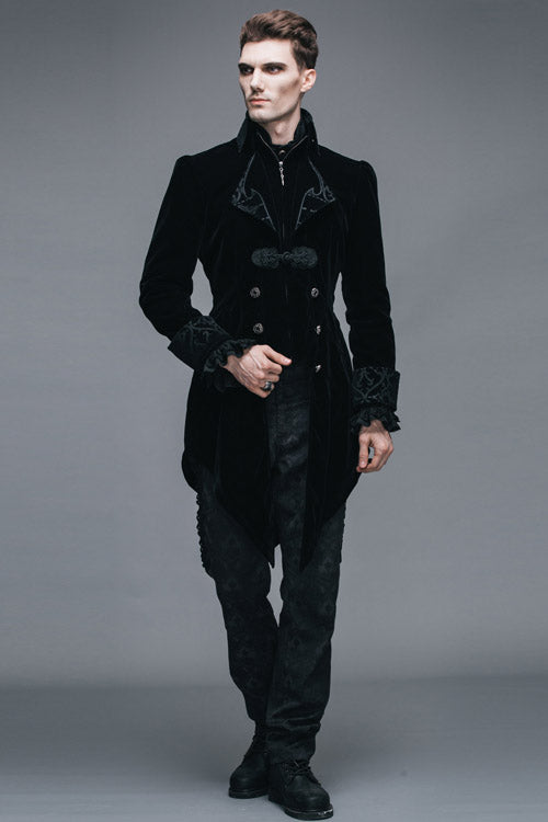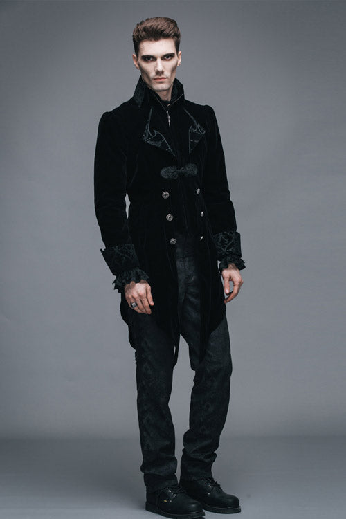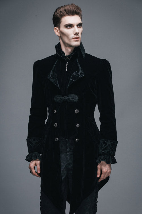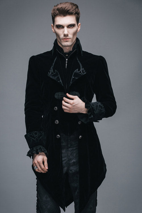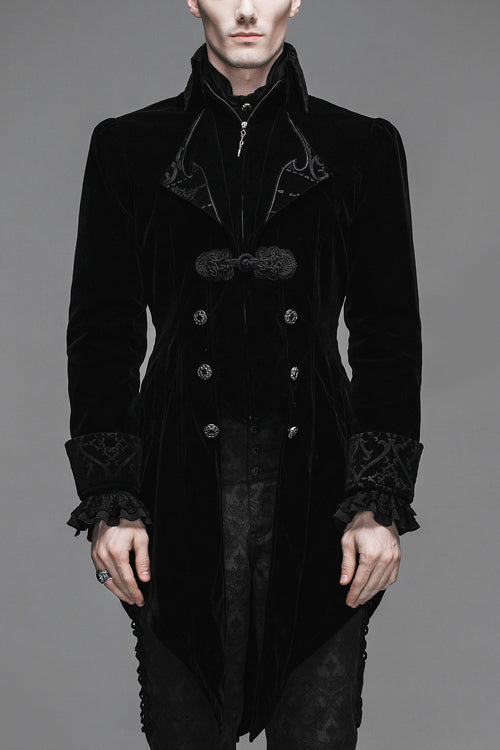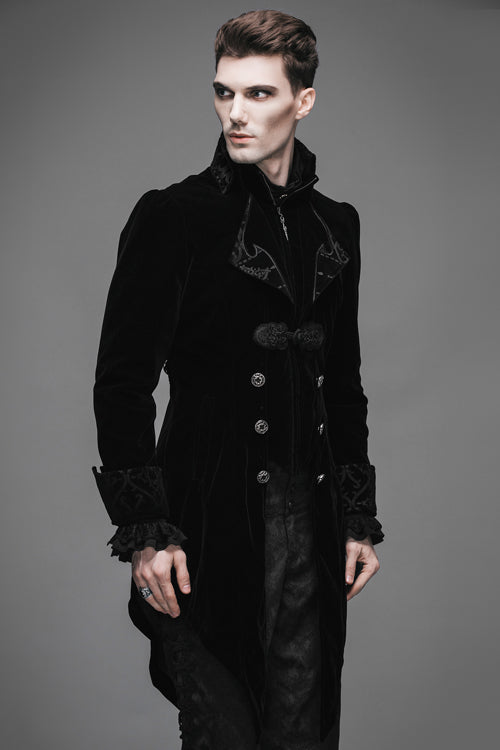 Black velveteen fabric with black palace pattern burned-out fabric, collar with collar embroidery, fake two pieces of design, waist frog can be opened, using Gothic carved button.