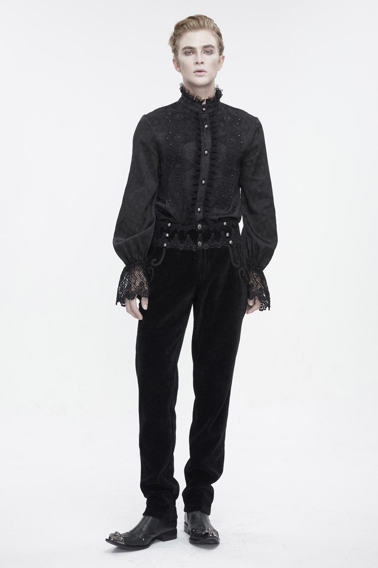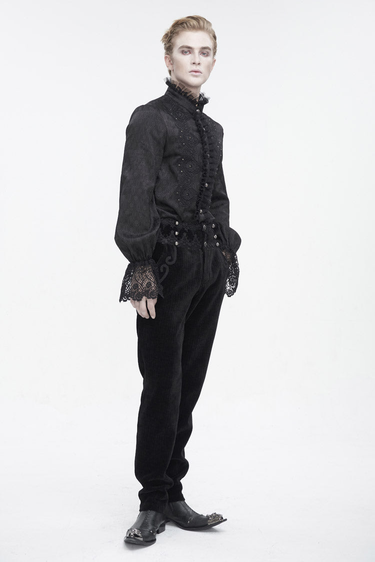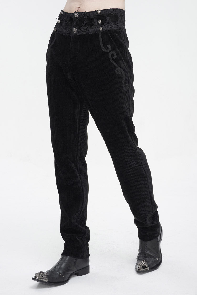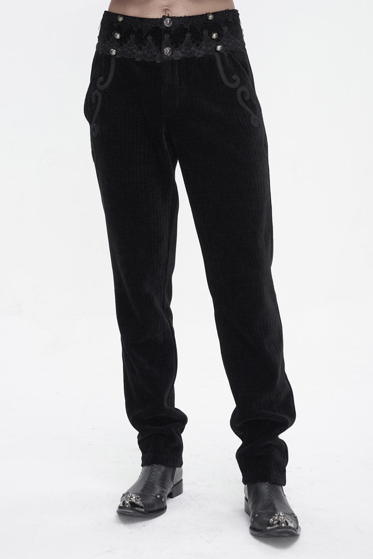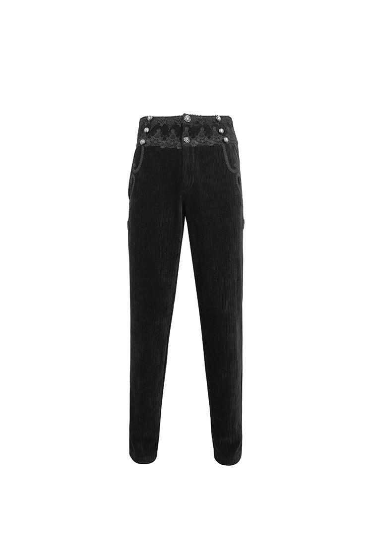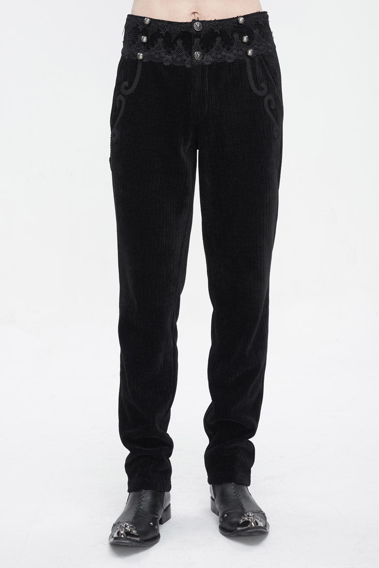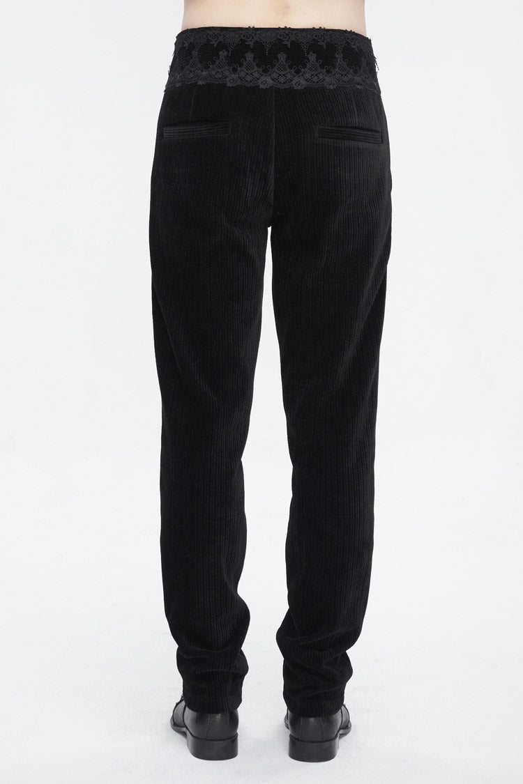 This pair of gothic pants is made of corduroy fabric. High-waisted design. The waist is patchwork with lace. Braided lace is decorated near the pockets. Slim-fit silhouette and no elastic fabric. Available in two colors.
