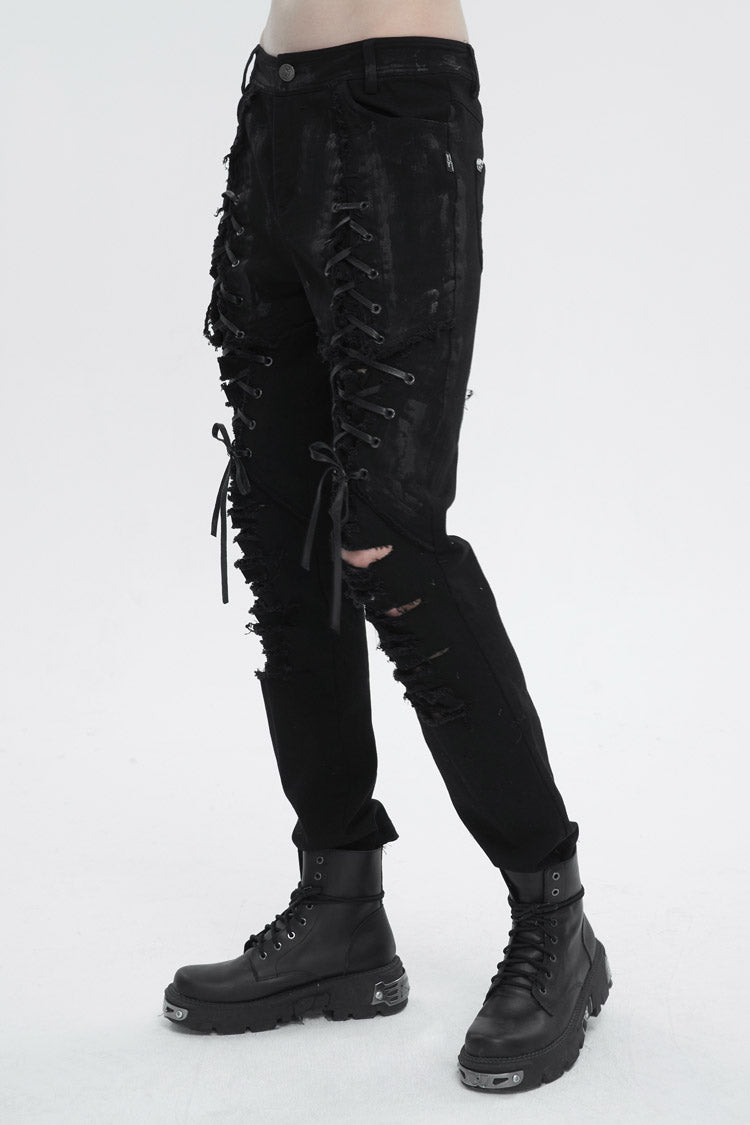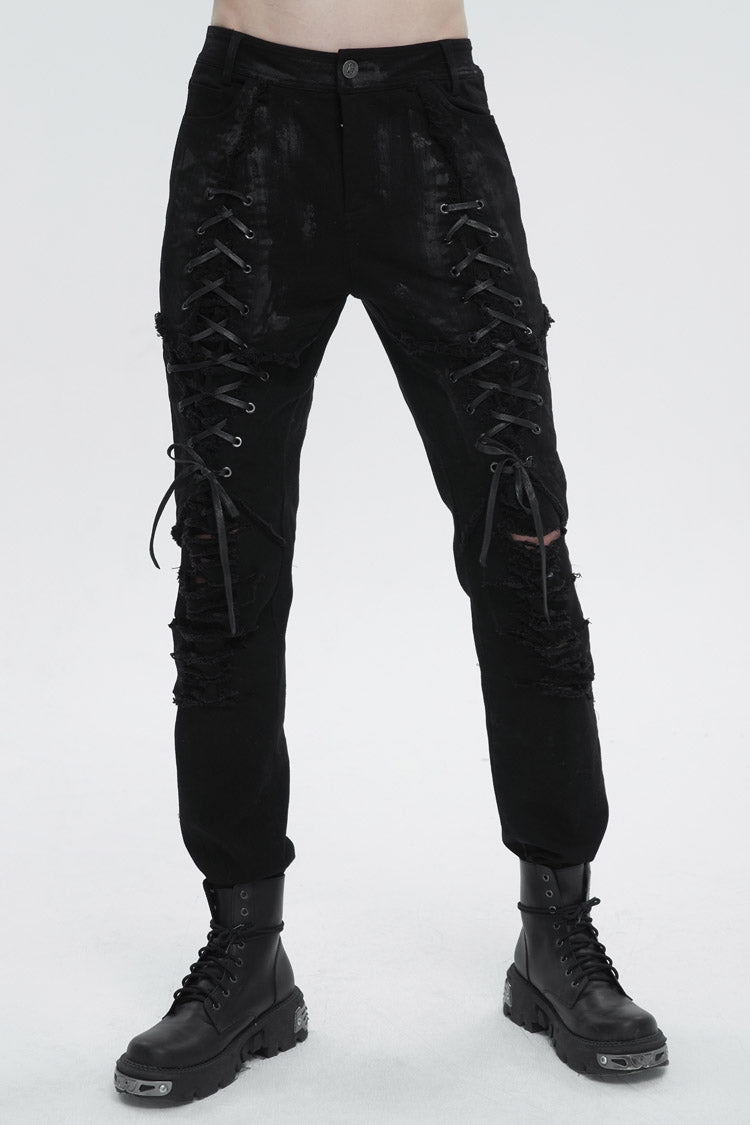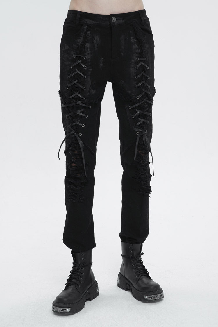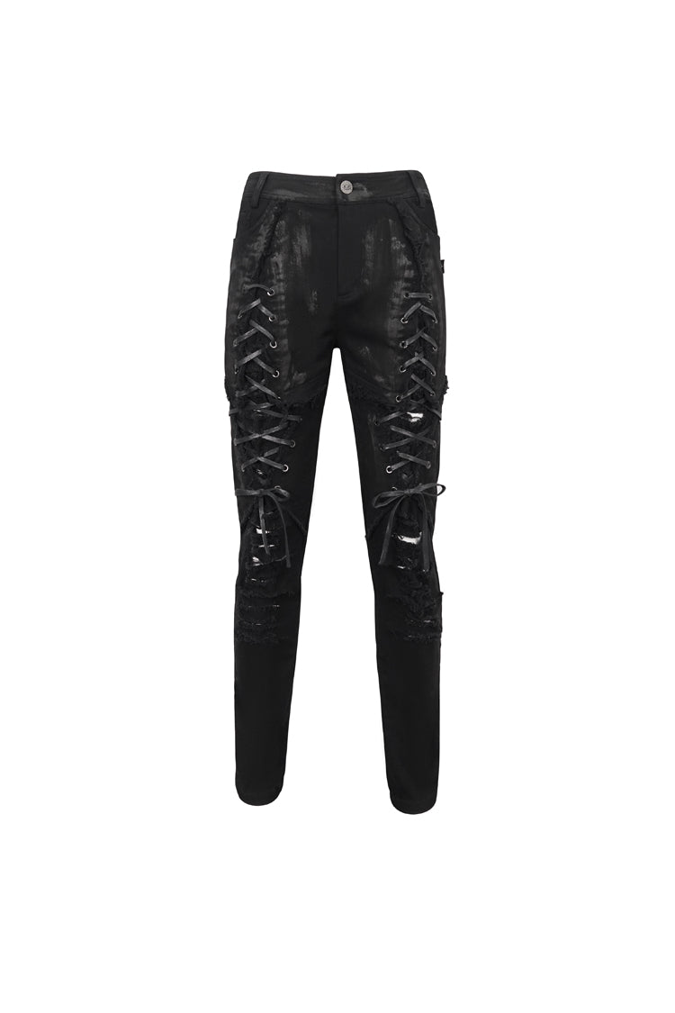This pair of punk pants is made of distressed fabric. Lace-up on the thigh and ripped on the knees. Slim fitted silhouette.