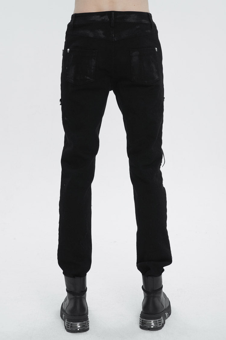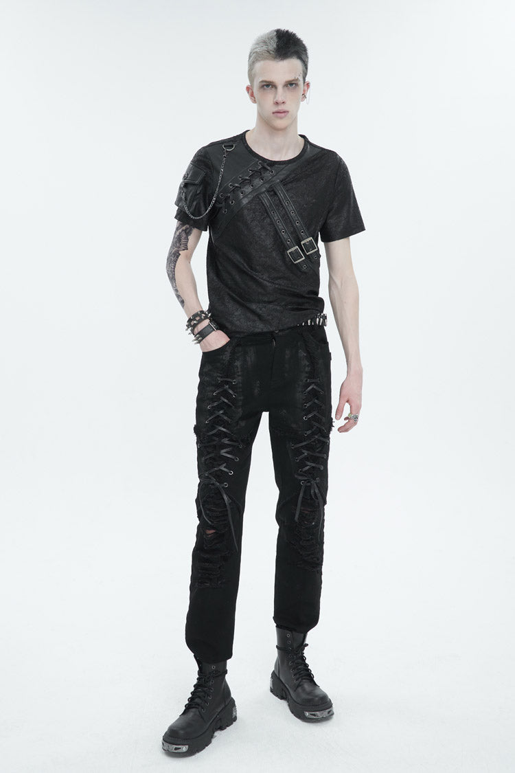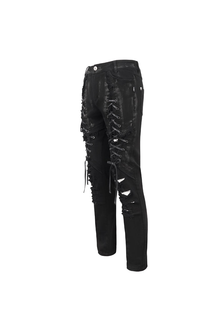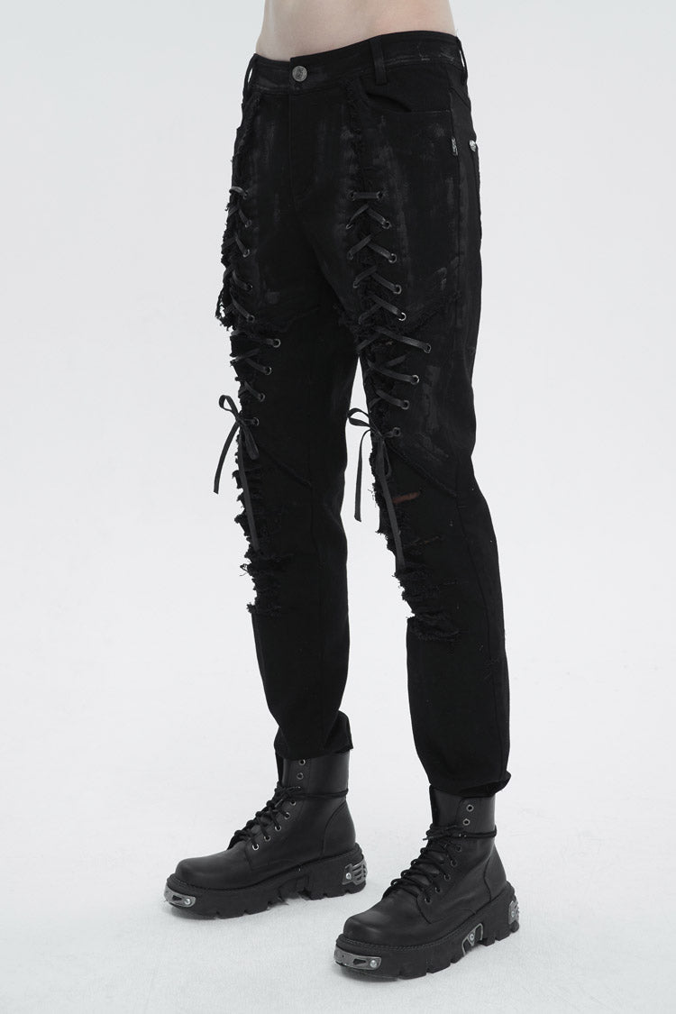 This pair of punk pants is made of distressed fabric. Lace-up on the thigh and ripped on the knees. Slim fitted silhouette.