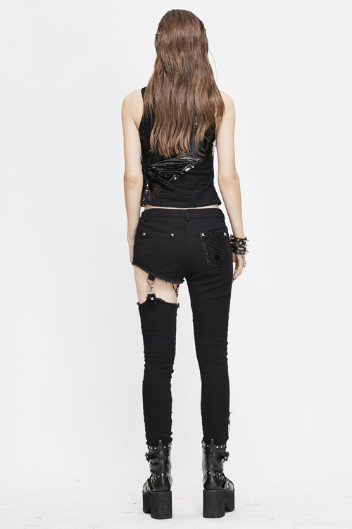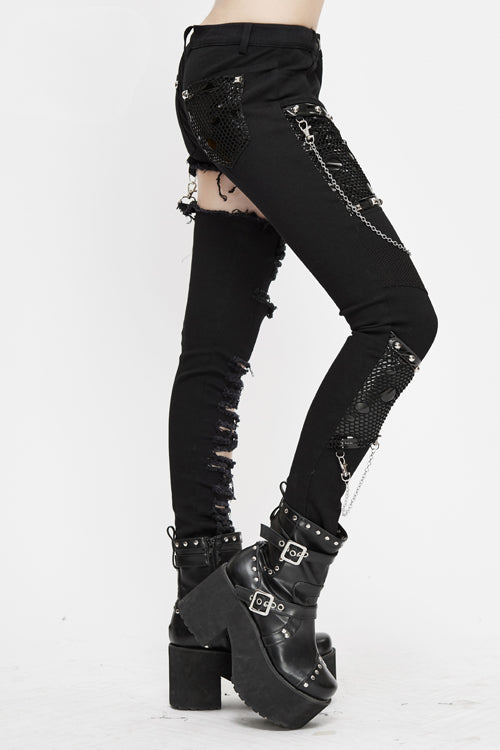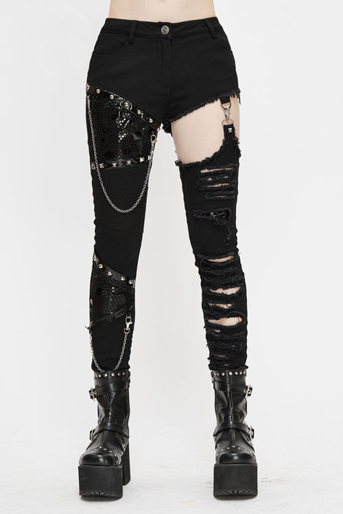 1. Asymmetric pants with a variety of fabrics stitching.