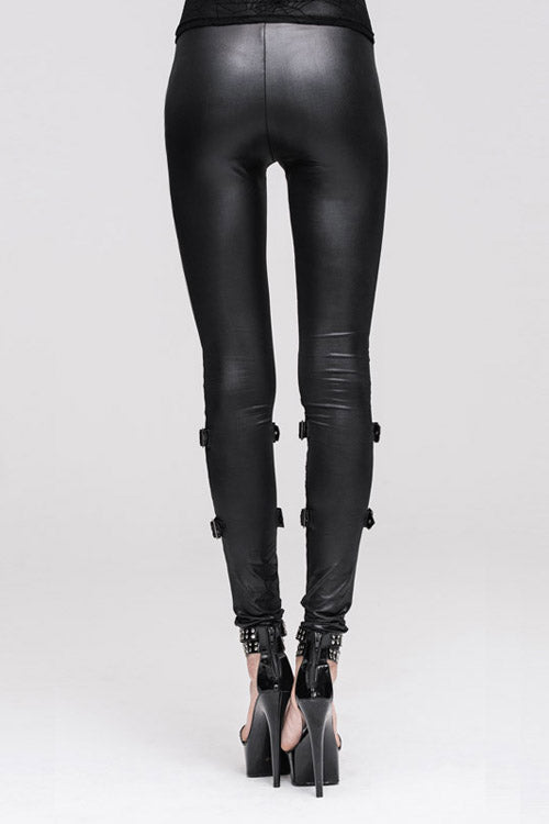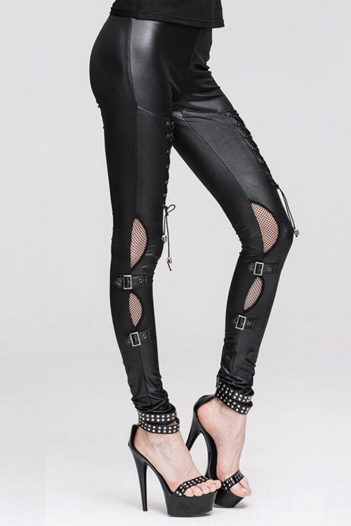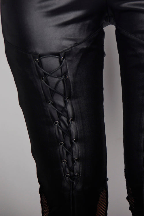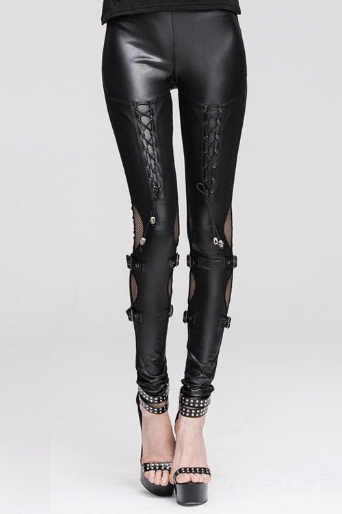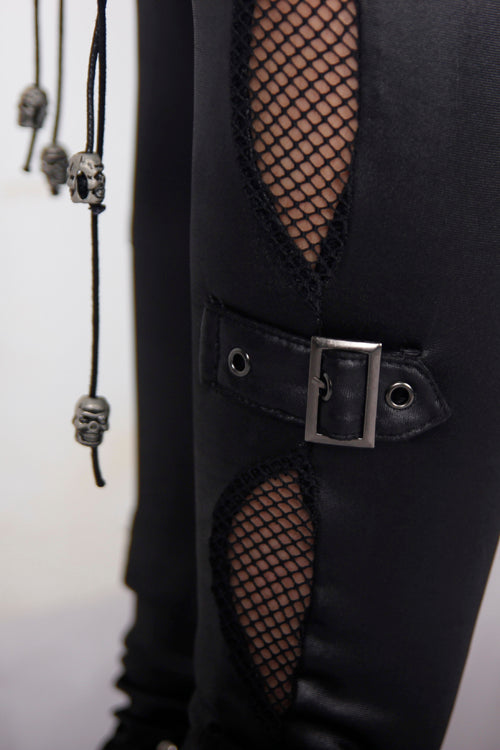The whole piece was made of elastic imitation leather knitted fabric,the middle thigh was tied with rope to hang the skeleton pendant, The side of the calf splices semicircle mesh material, decorated with loops.Suitable for everyday wear.