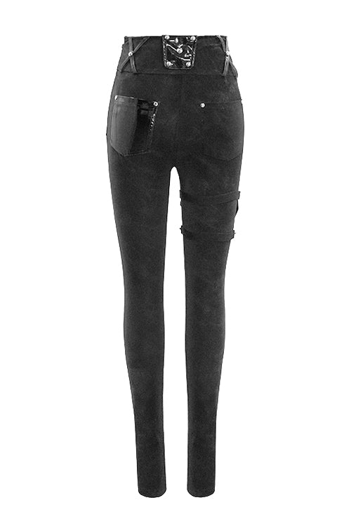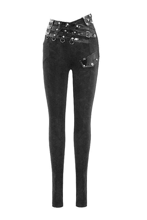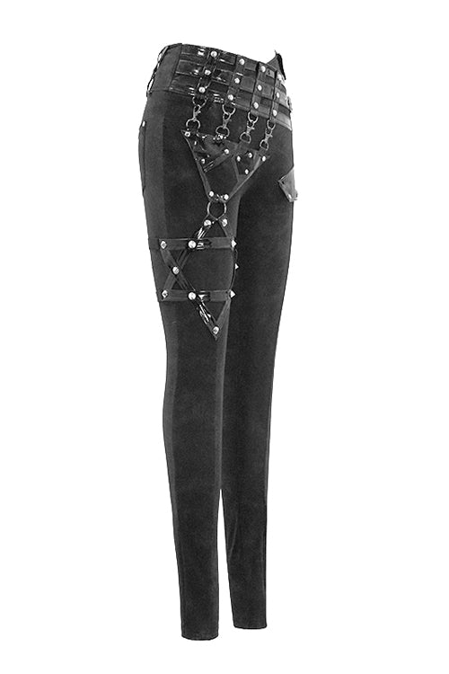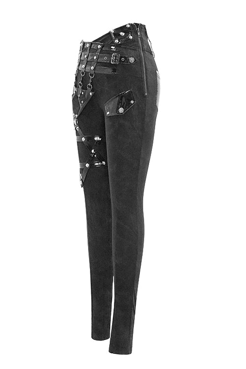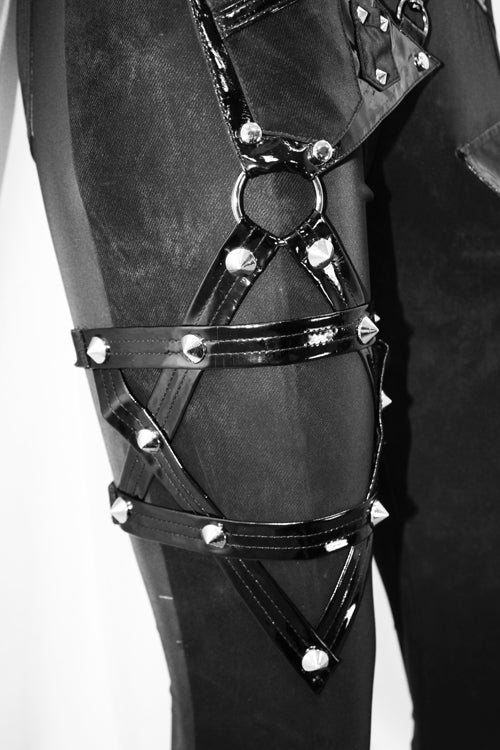 Knitted glued material match with putent leather, oblique wide waistband, waistband string loop and nail studded as decoration, left foot Hexagram decoration can be removed.the Hexagram with nail studded echos.