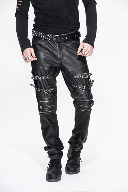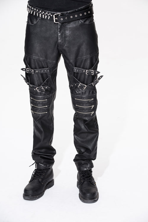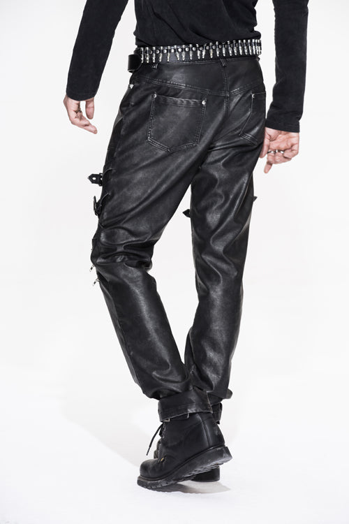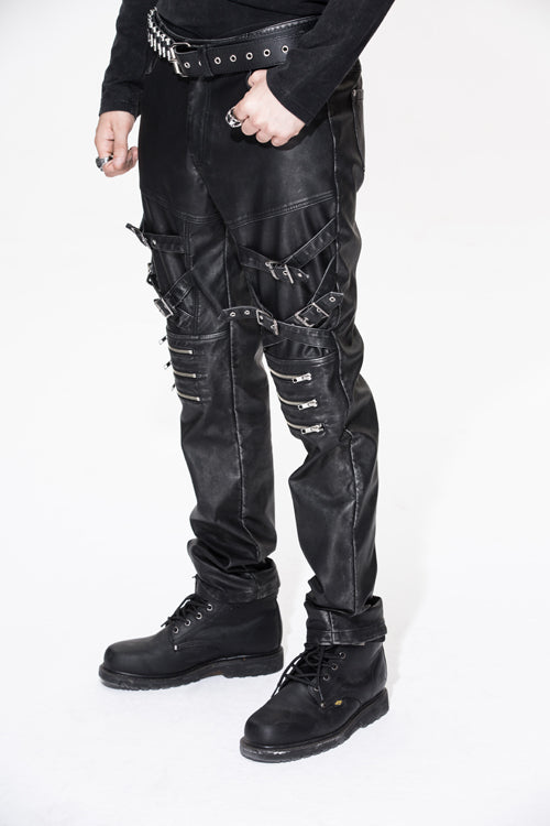 The whole piece pant is made of black and silver hand-rubbed leather. Through washing water and hand-rubbed process, the silver background color is rubbed on the bone position of the sewing thread.Cross leather loops and zippers are designed on the trouser legs as decoration.Suitable for autumn and winter day and party wear.