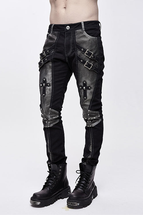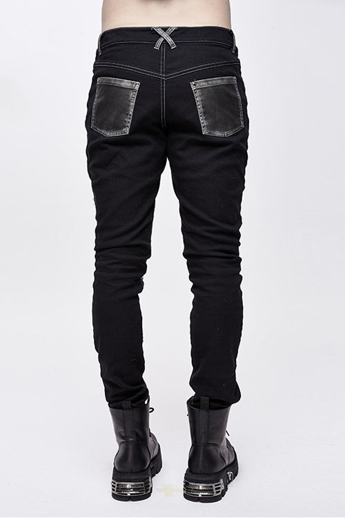 the main material is elastic twill with hand rubbing leather, the center front was rubbed color by hand,with loop, cross, nail as decorations, the back bag with contrast color fabric echos.