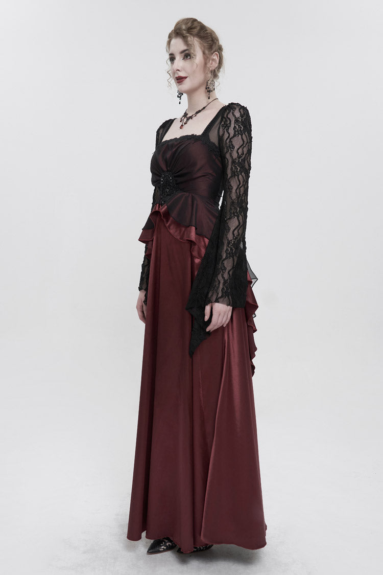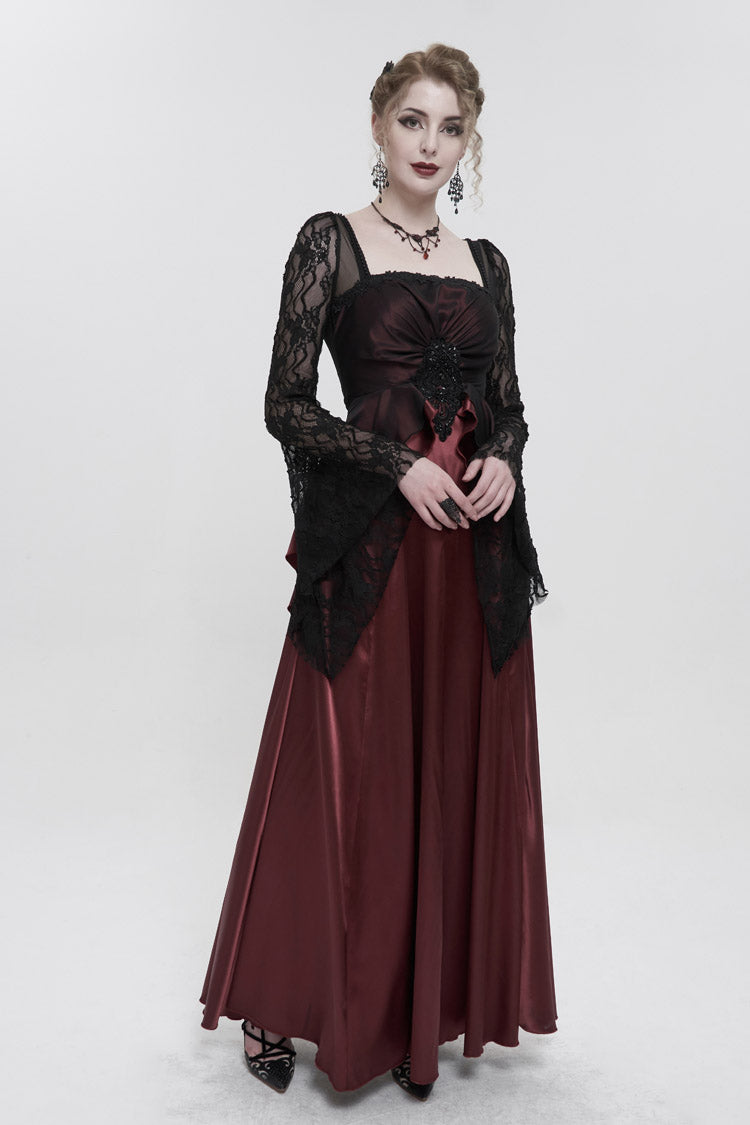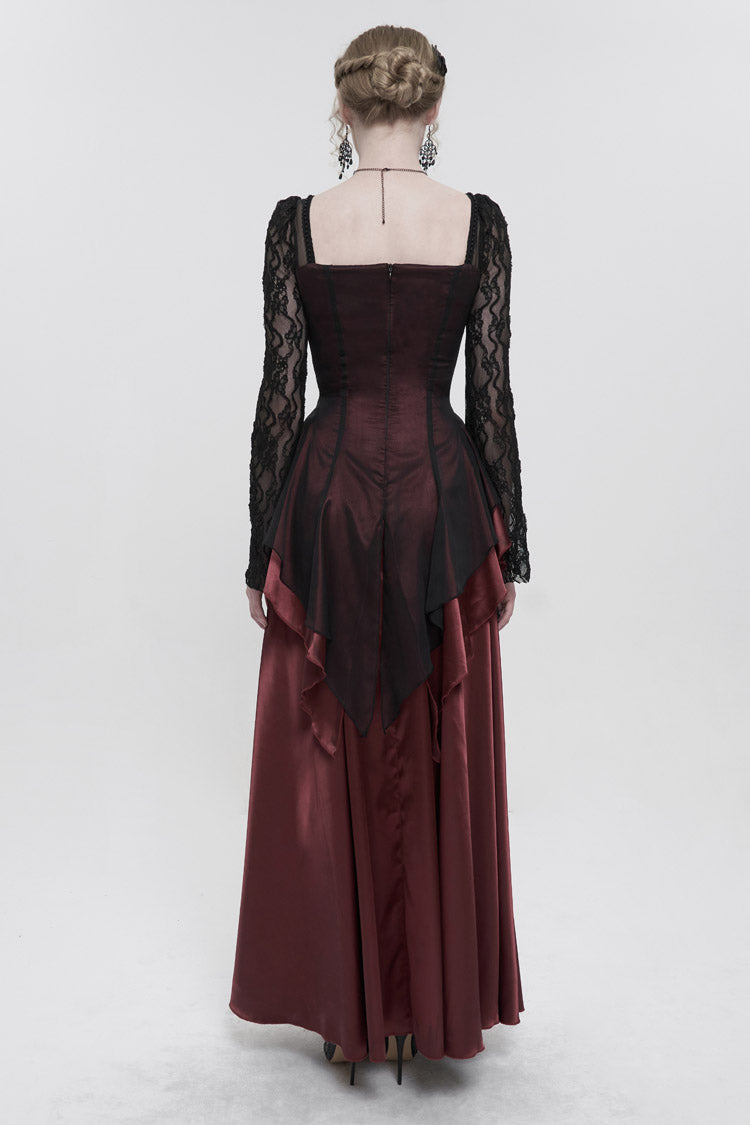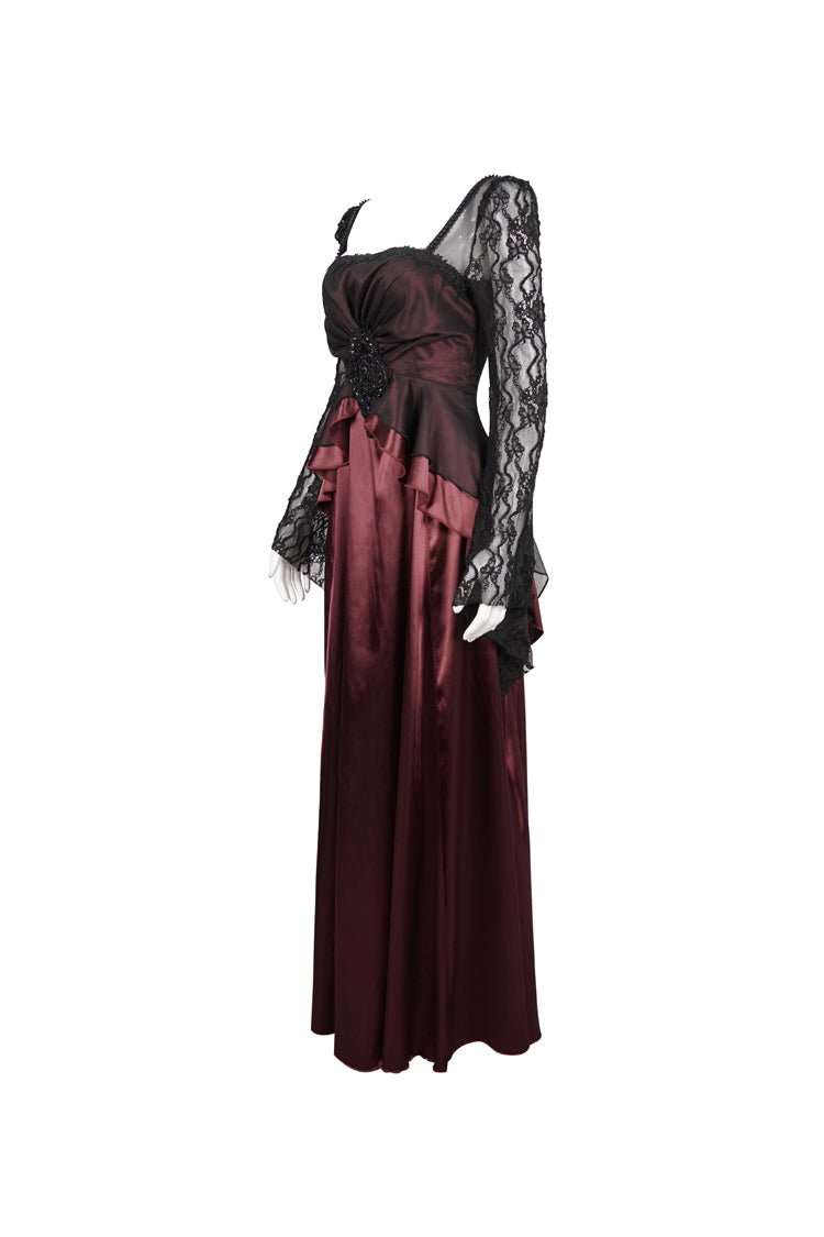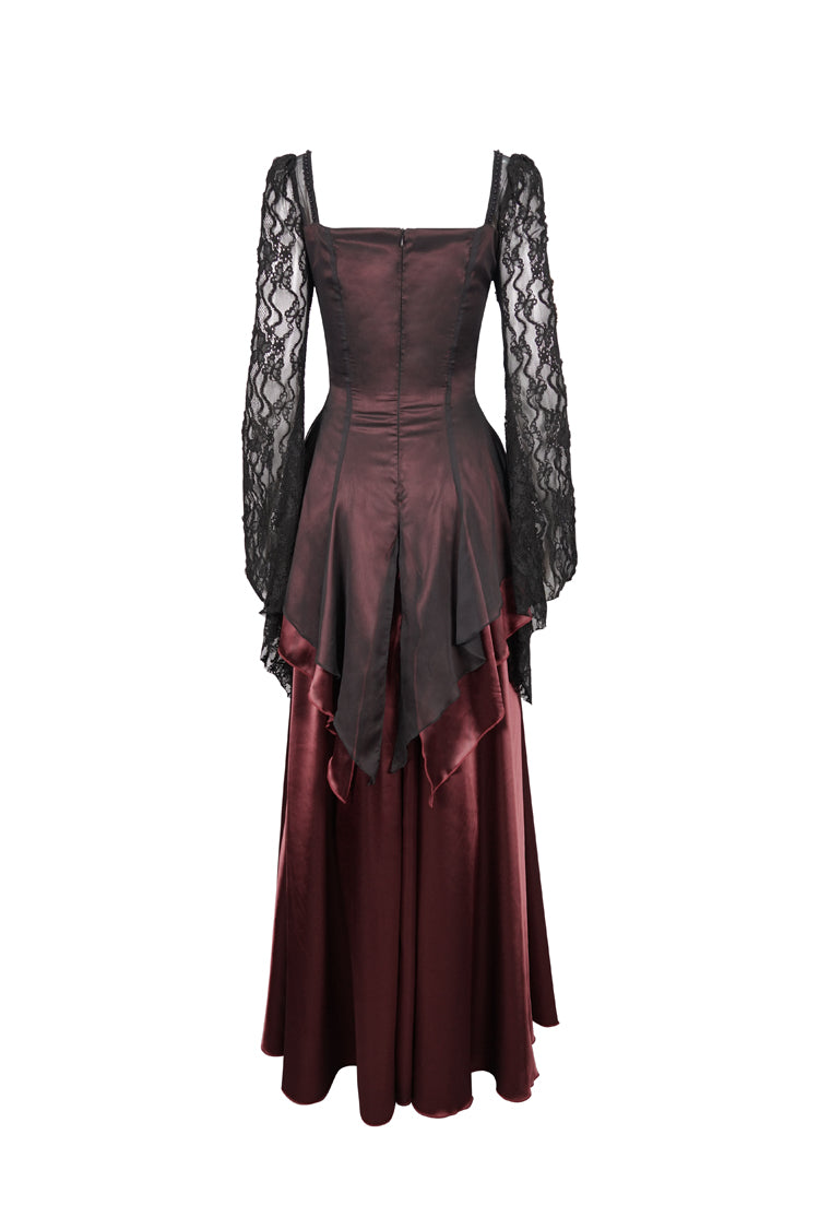 The main fabric is made of a red soft satin woven fabric with lace mesh and crepe chiffon fabric in a slim fit version and a long floor length. Pointed, oversized sleeves. Center back zipper. Perfect for party festivities and goth weddings. Can be worn in all seasons.