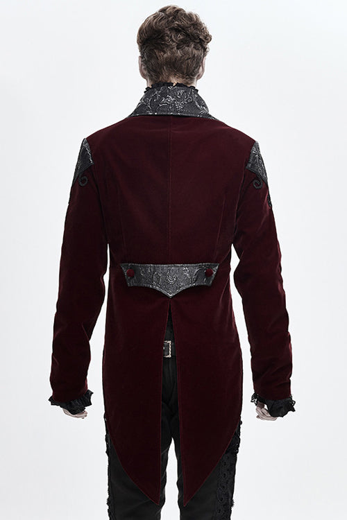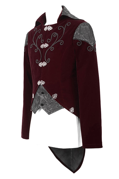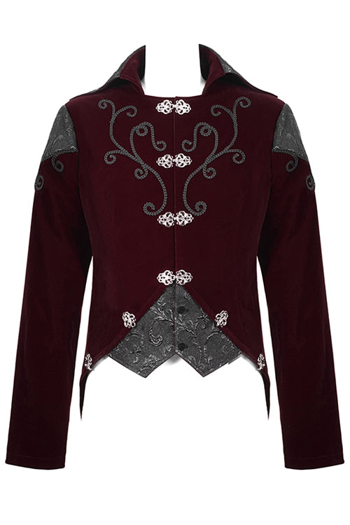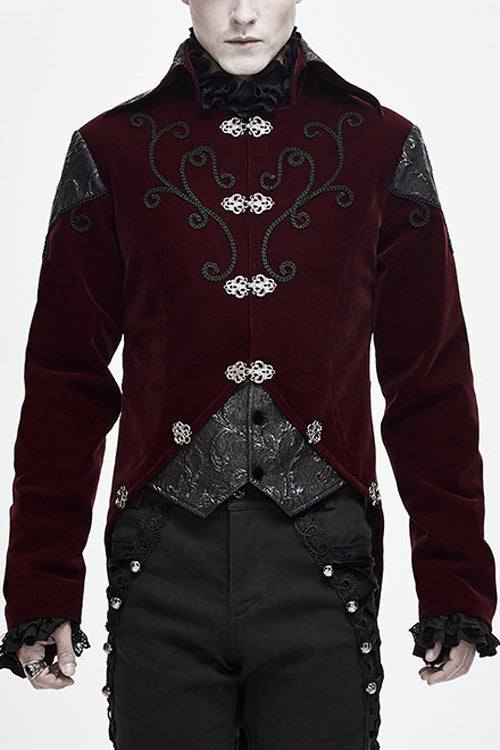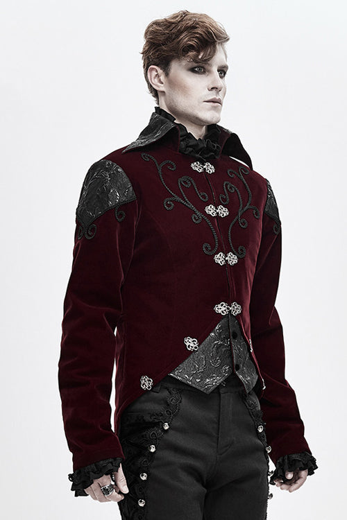 Black weft velvety fabric splicing three-dimensional jacquard fabric, made of fake two pieces design.Hand-embroidered chest, decorated with vintage hook clasp.