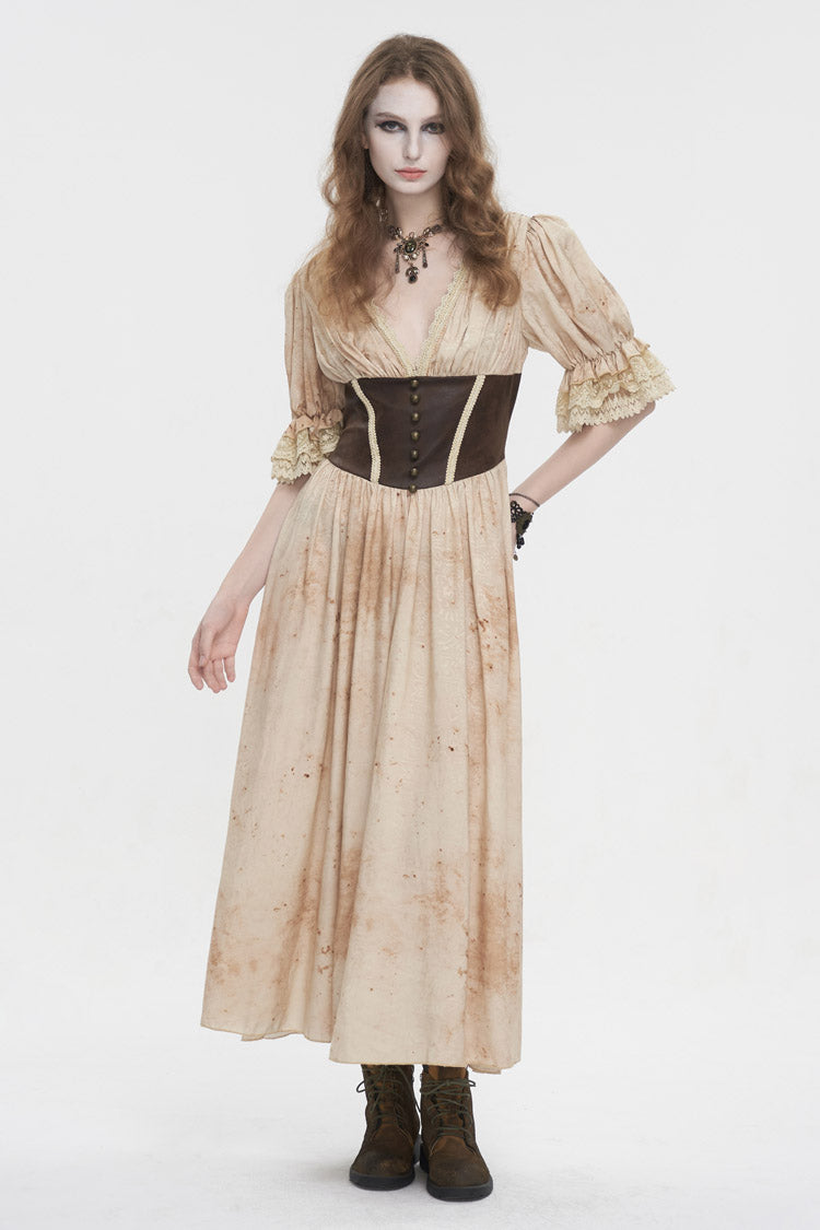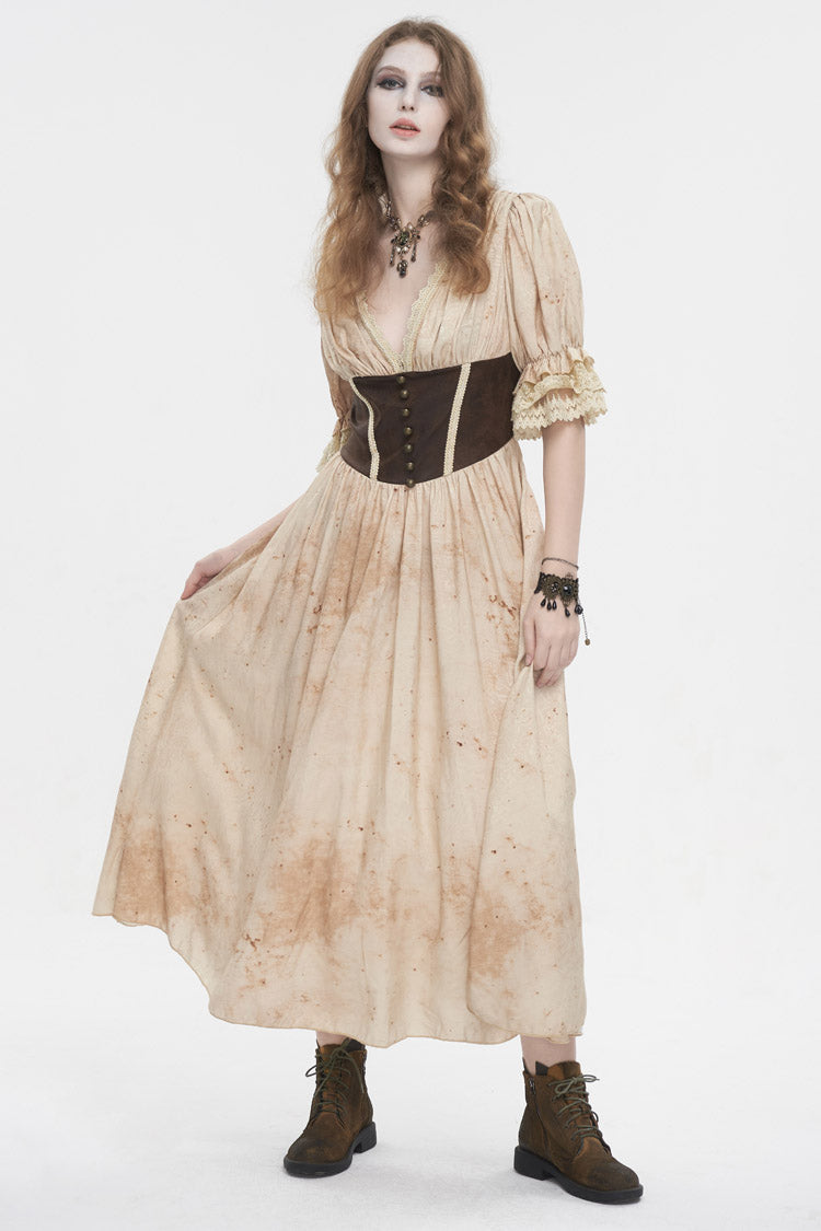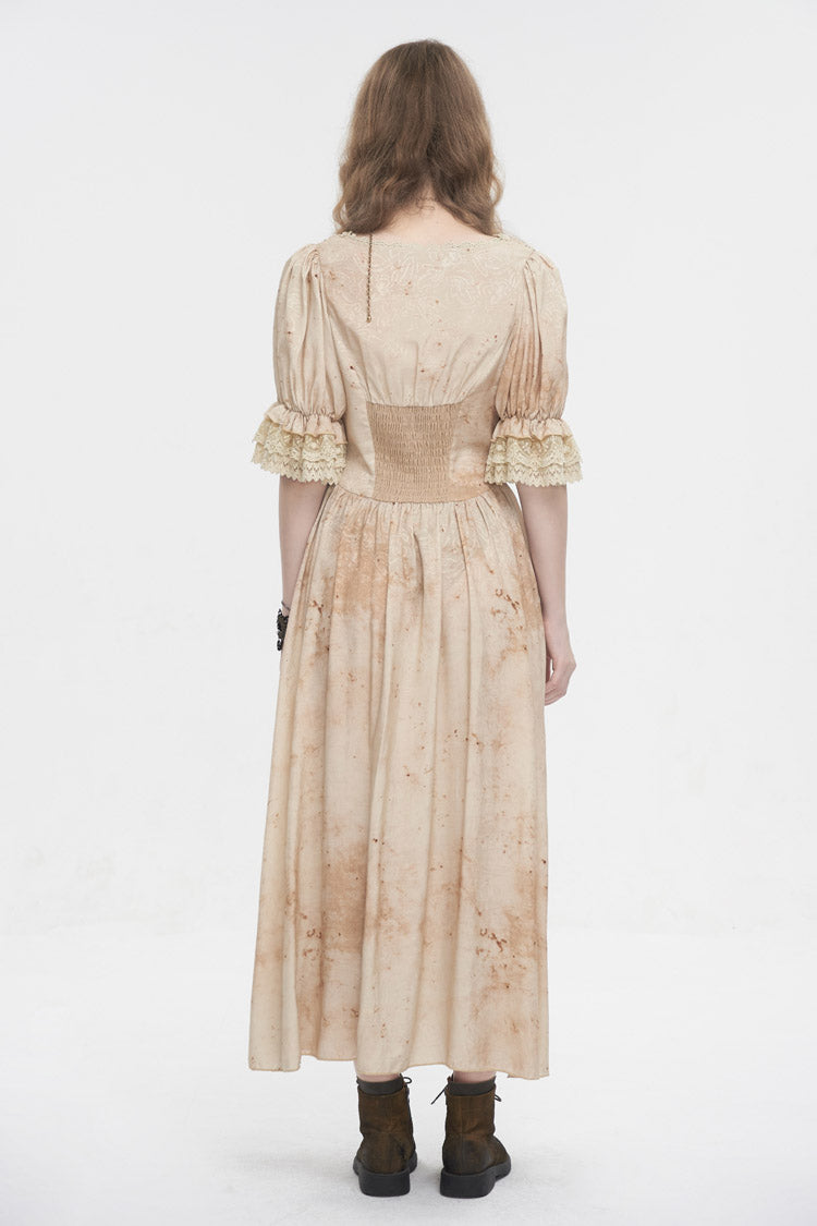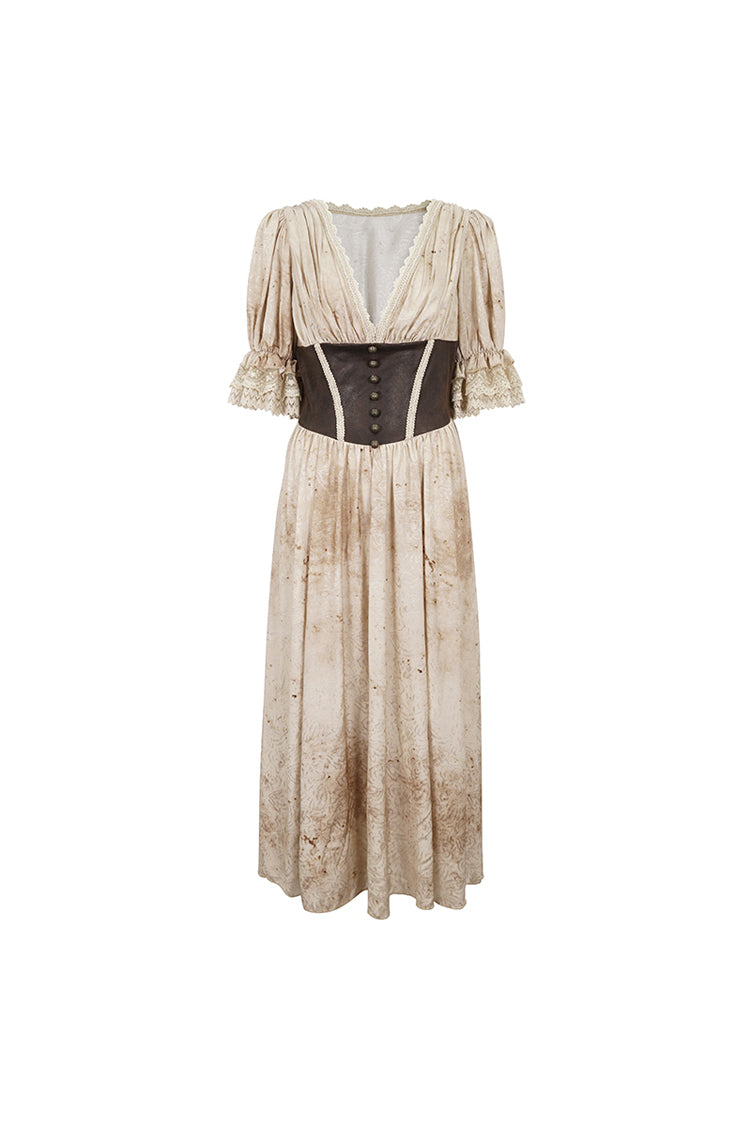 This gothic dress has a plunging neck and lace patchwork on the hem. It has puff sleeves and an elastic band on the back for adjustment. Patchwork on the front waist.