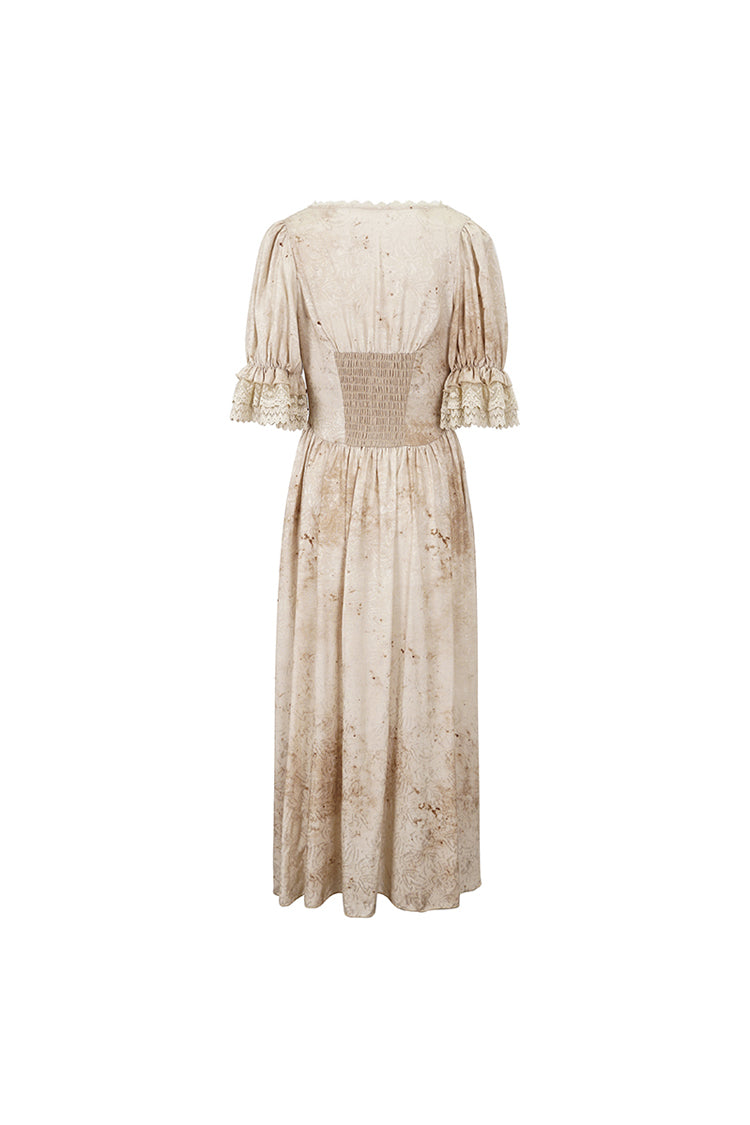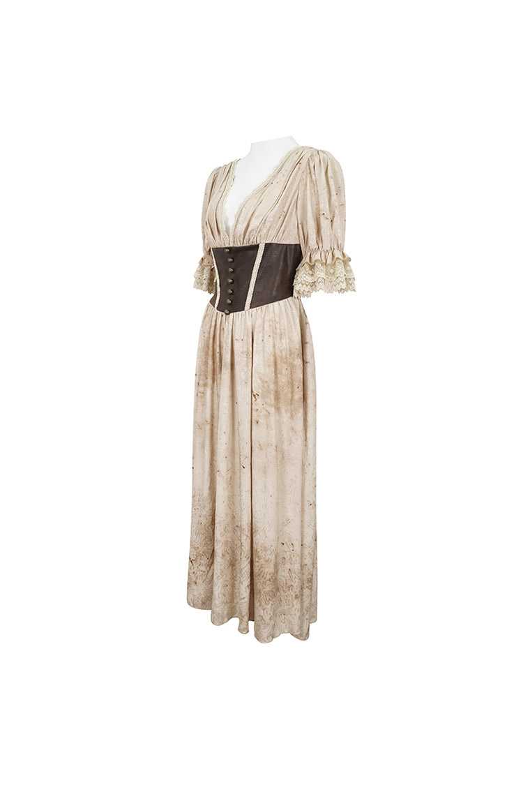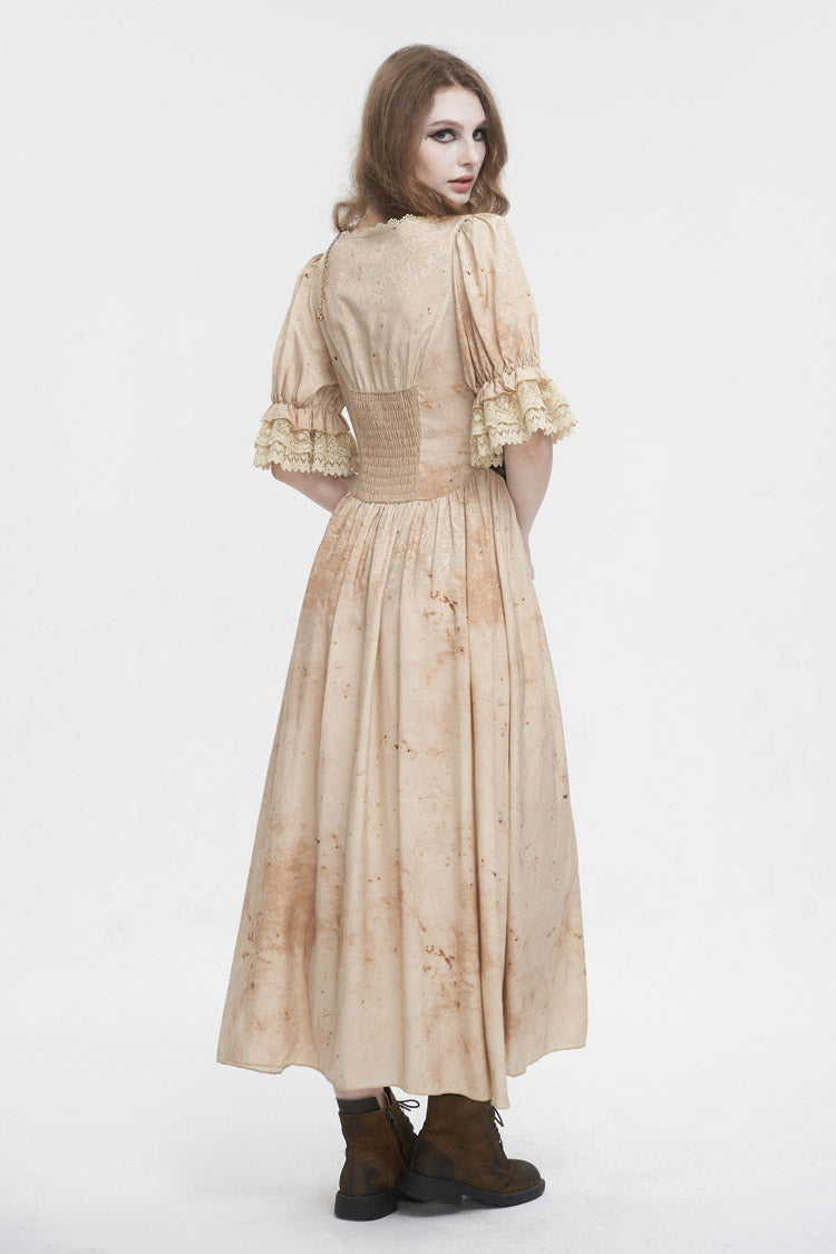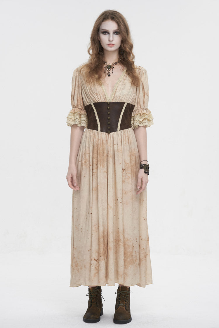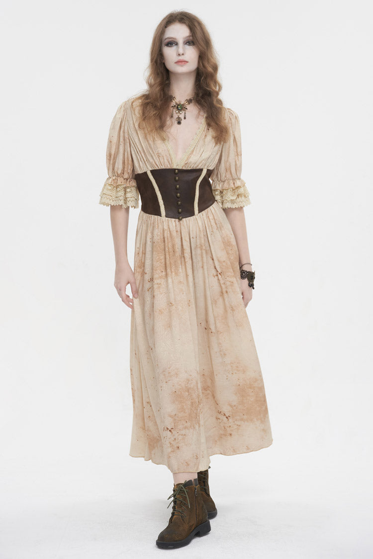 This gothic dress has a plunging neck and lace patchwork on the hem. It has puff sleeves and an elastic band on the back for adjustment. Patchwork on the front waist.