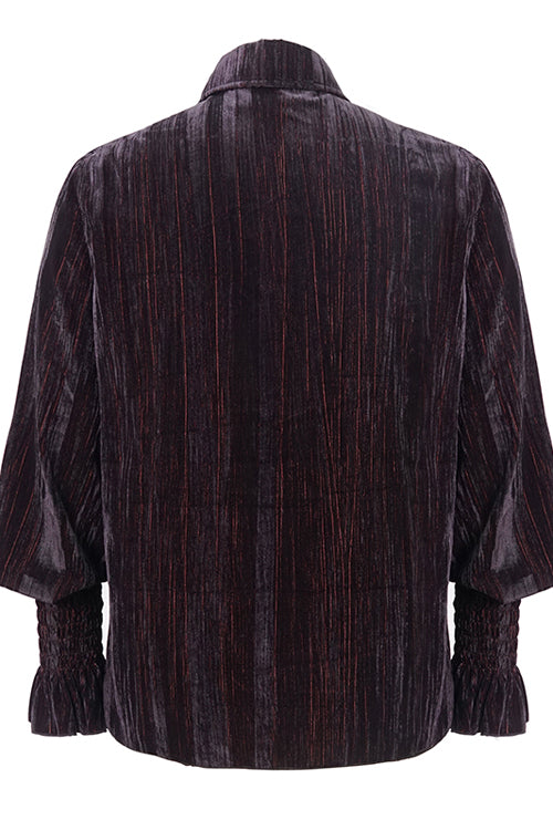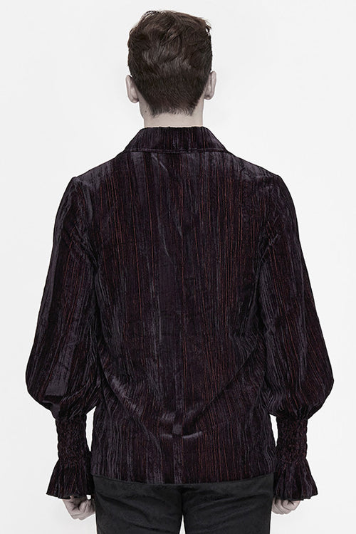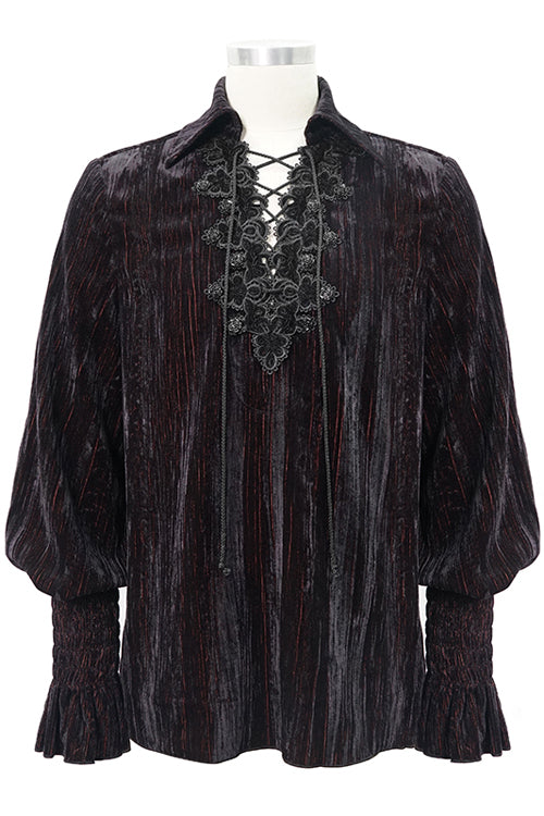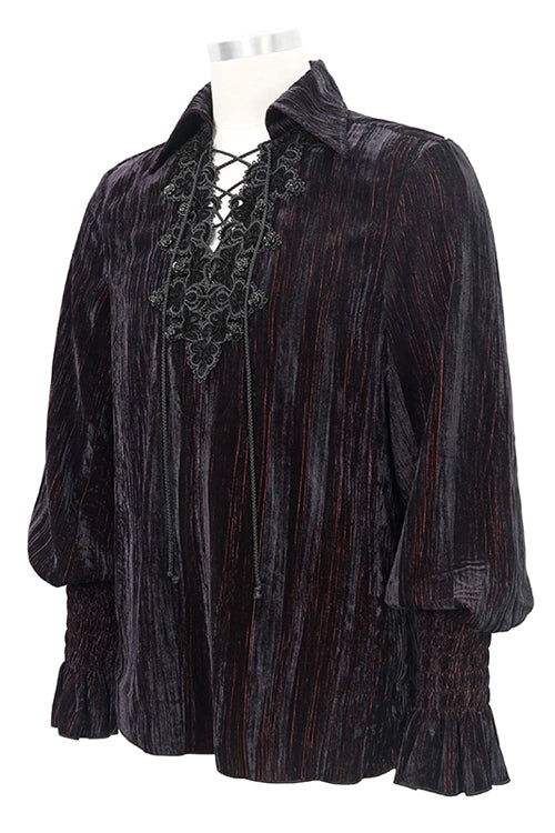 The main fabric is made of non-elastic black and red flocking woven material. Version loose and partial fit, lantern sleeve. Velvet lace with stringing on the chest and black spikes to do a ornament.