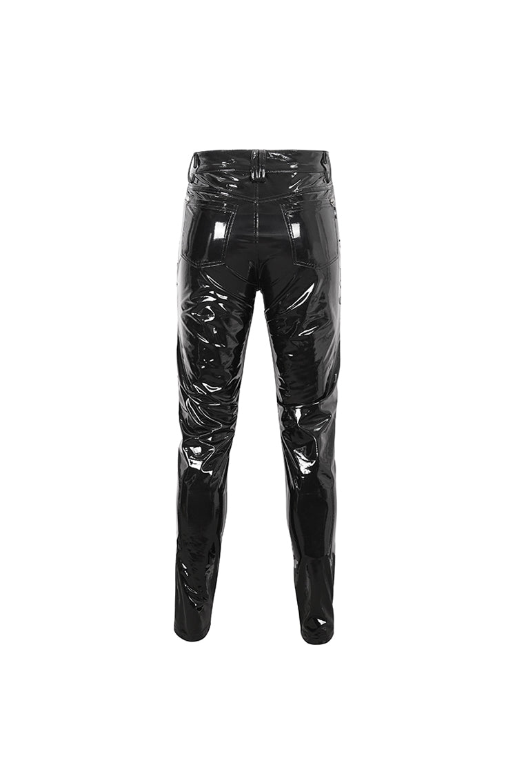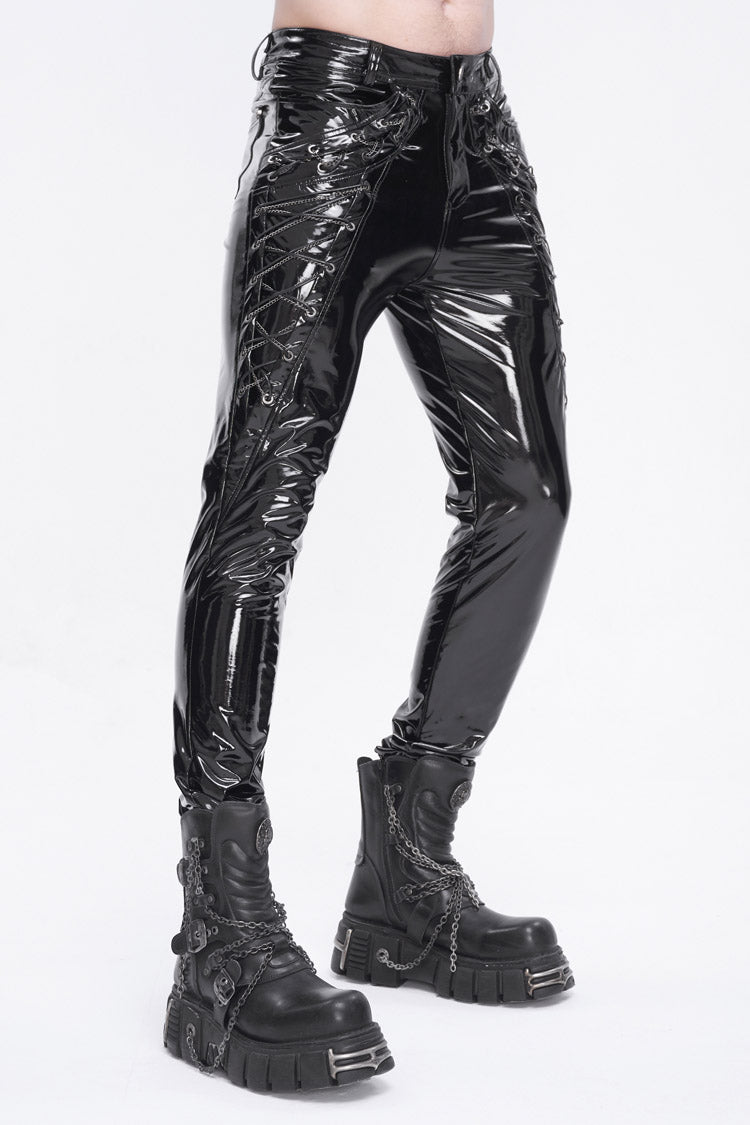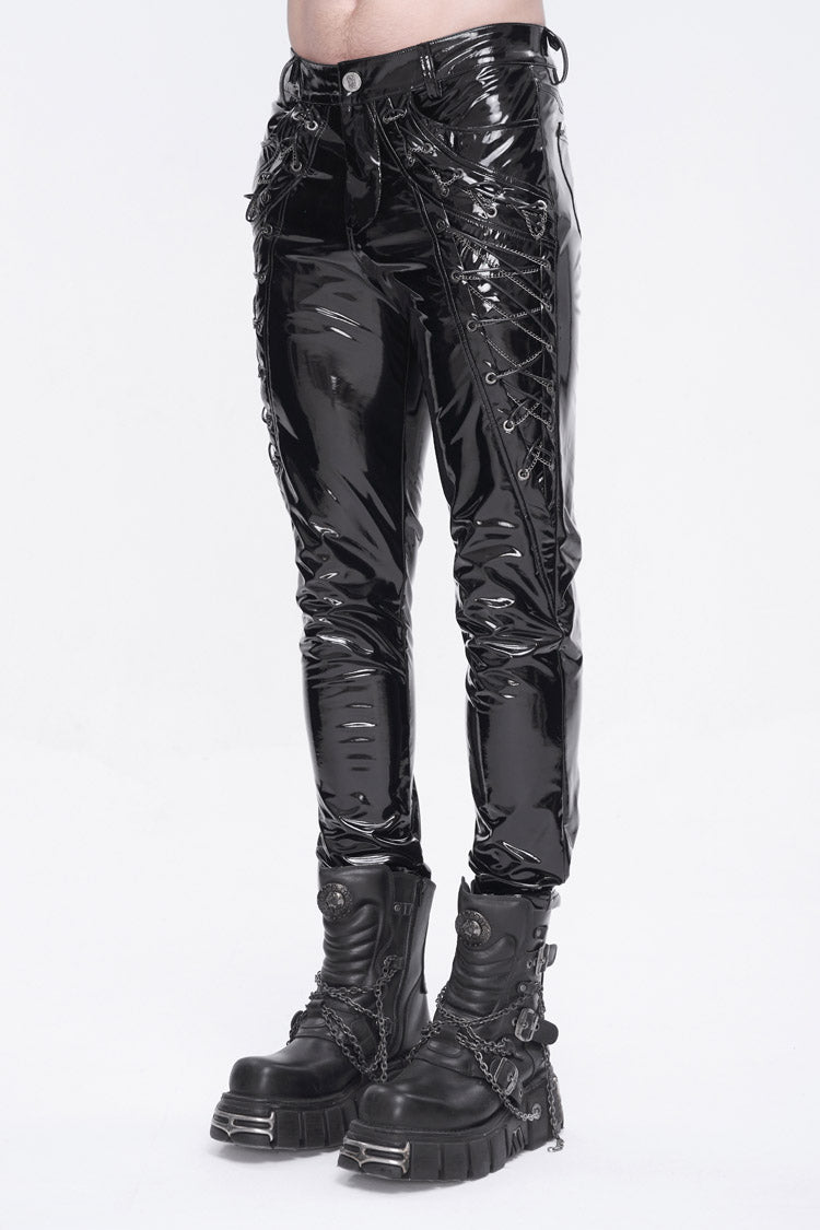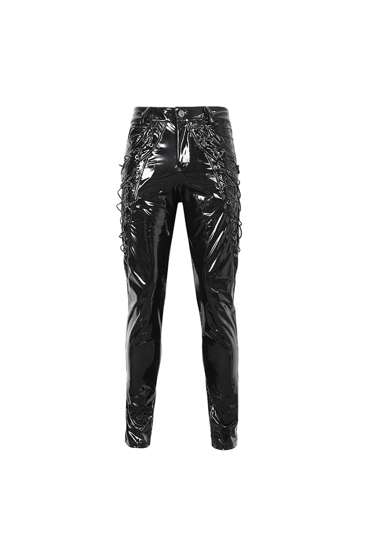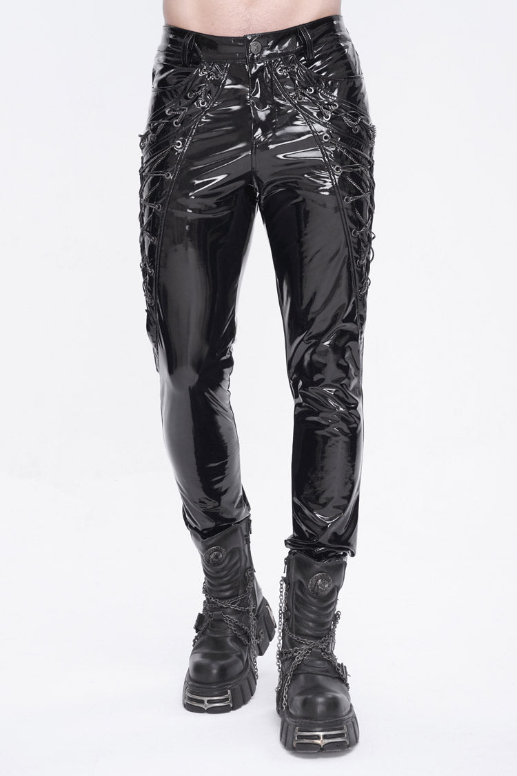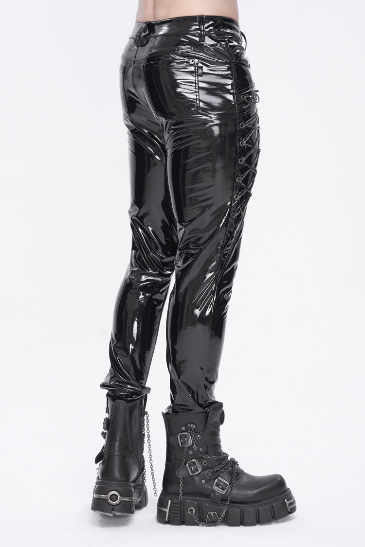 This pair of punk pants is made of patent leather. Lace-up and chain on the side. Small skulls are decorated on the back pockets. Slim-fit silhouette and good elastic fabric.