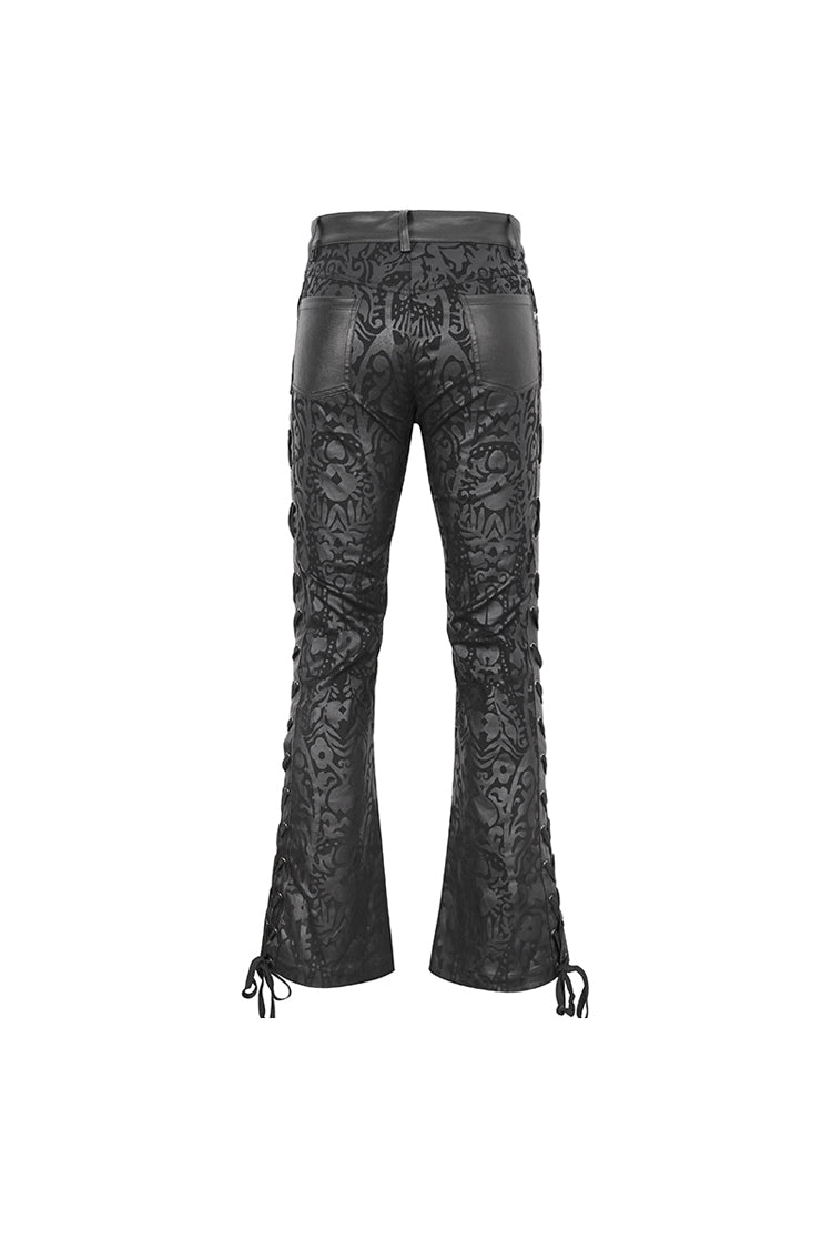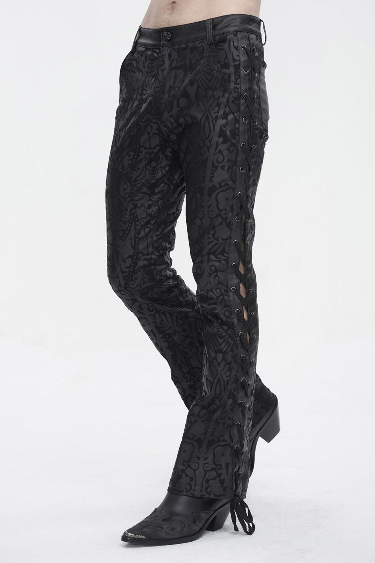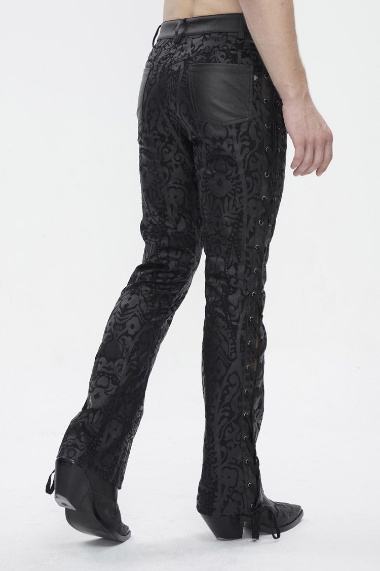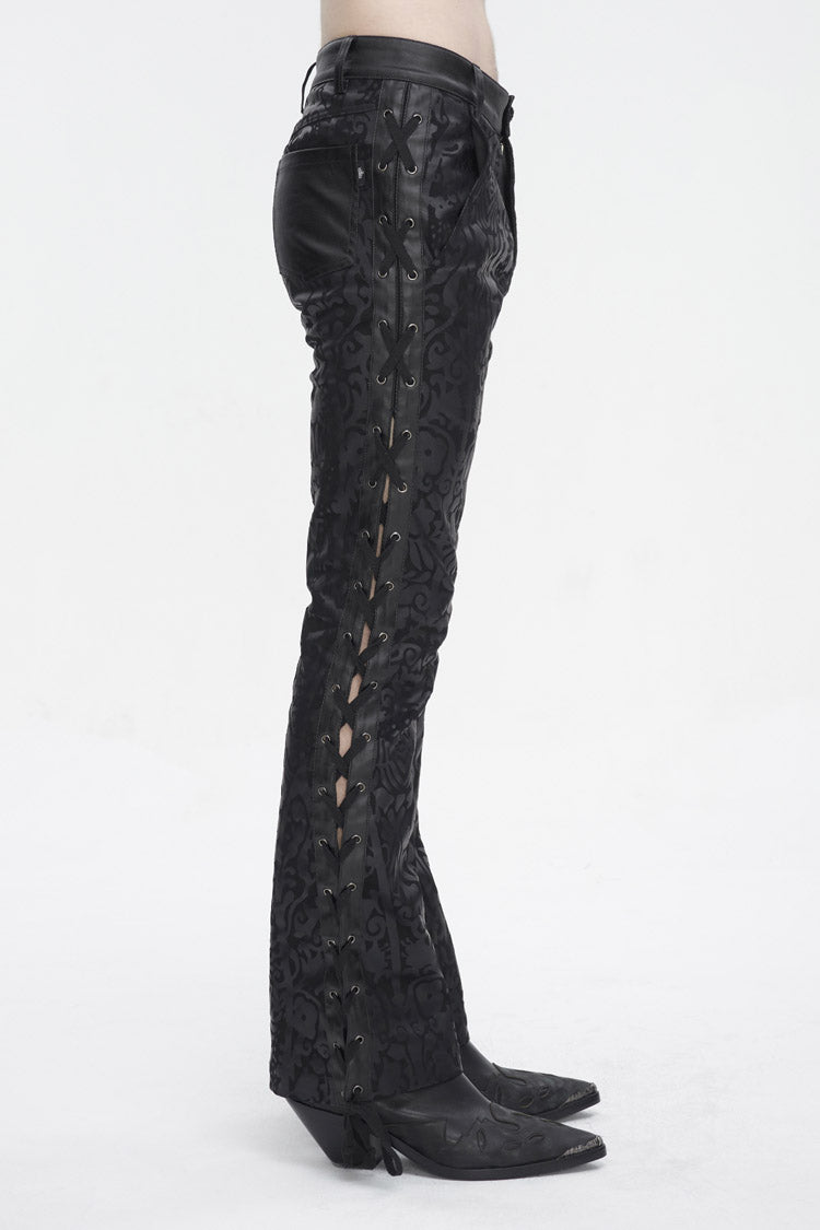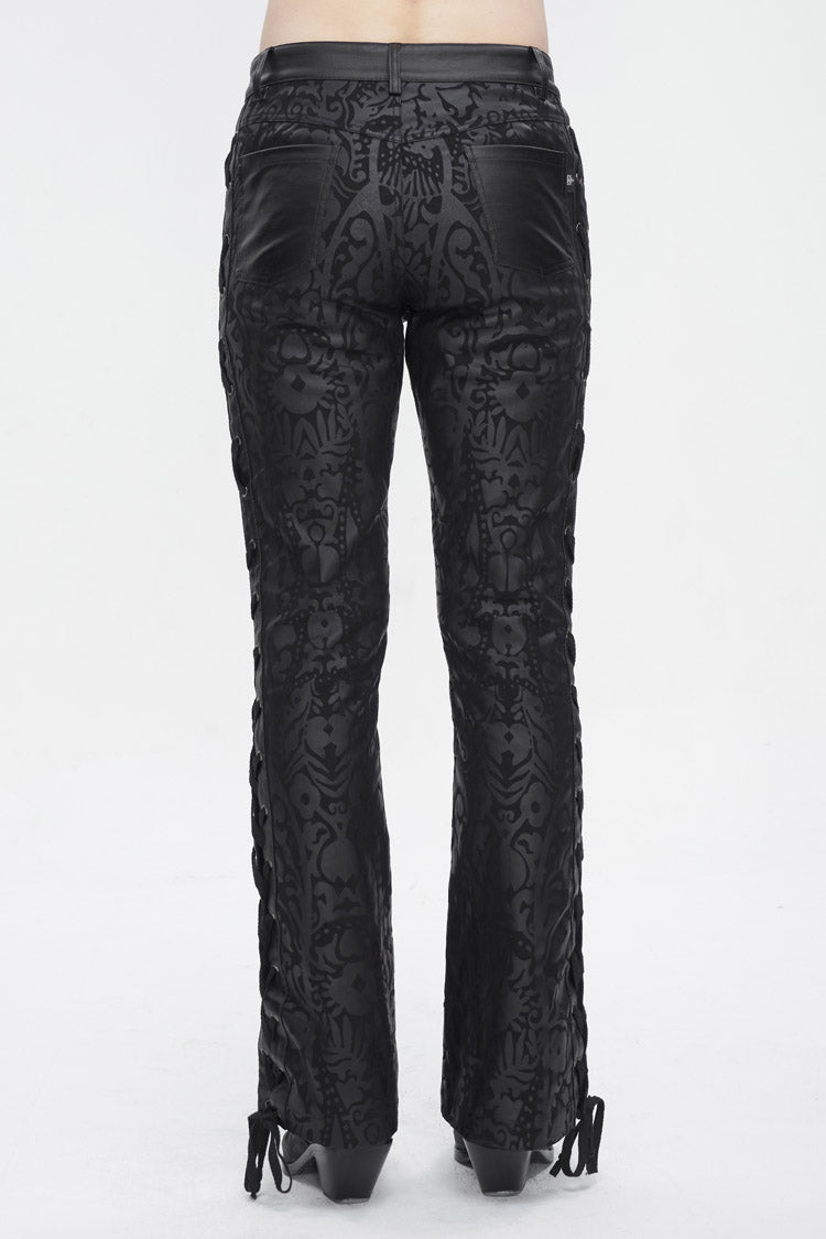 This pair of punk pants has a totem print. Lace-up on the sides. Flared hem design. Slim-fit silhouette and slightly elastic fabric.