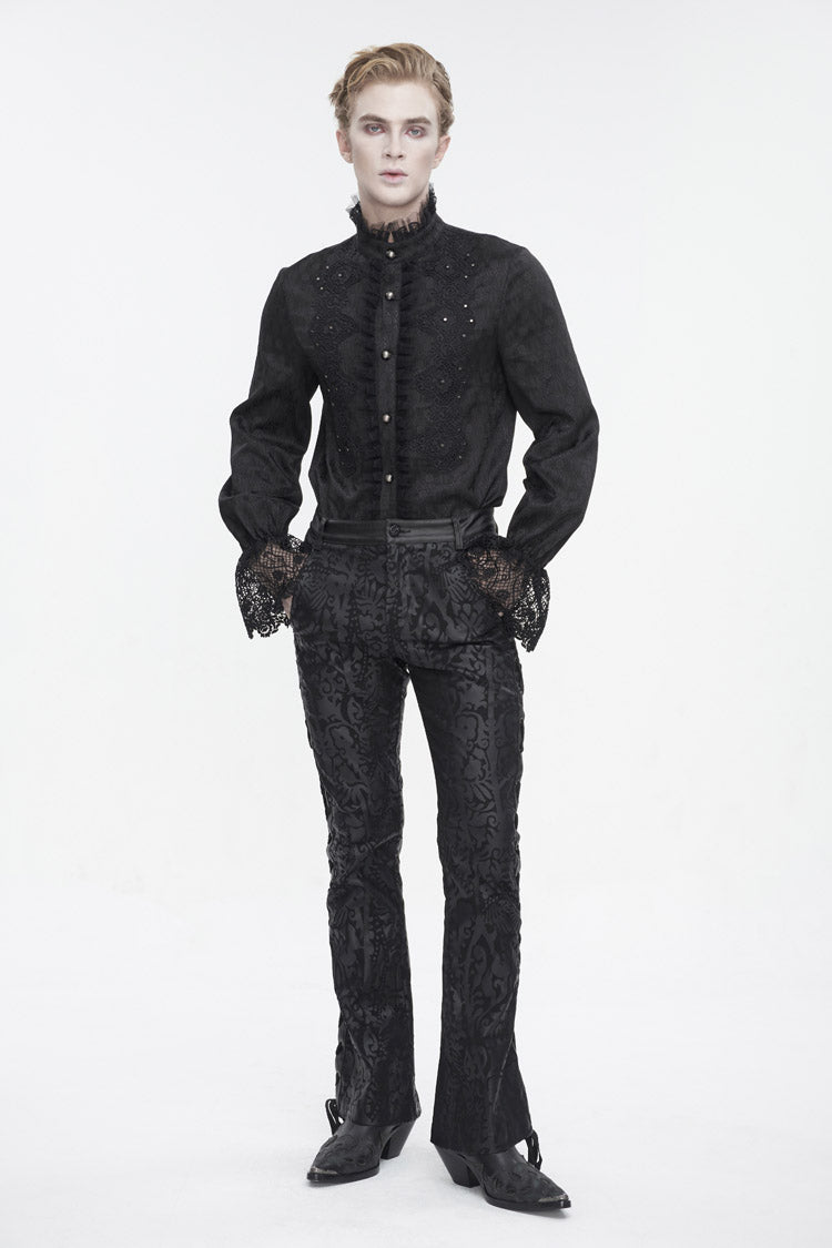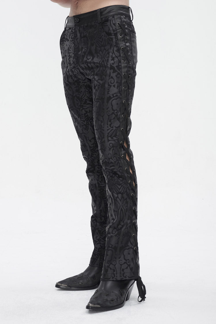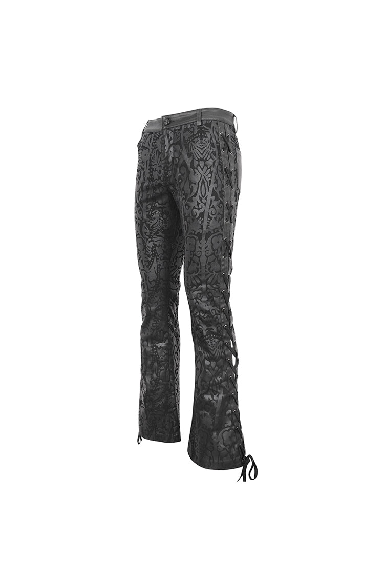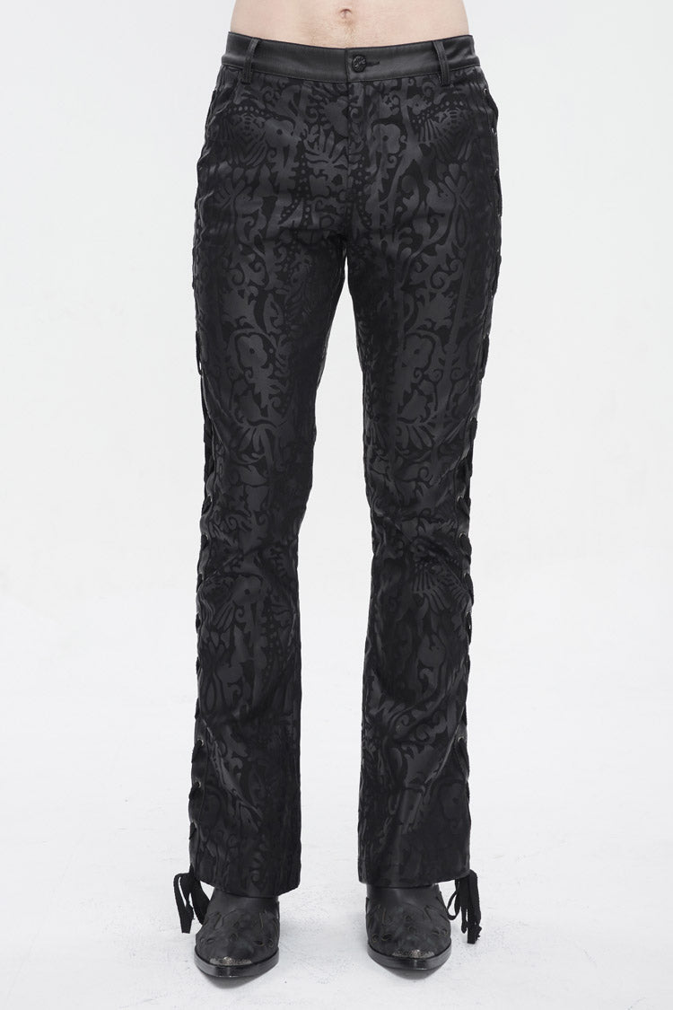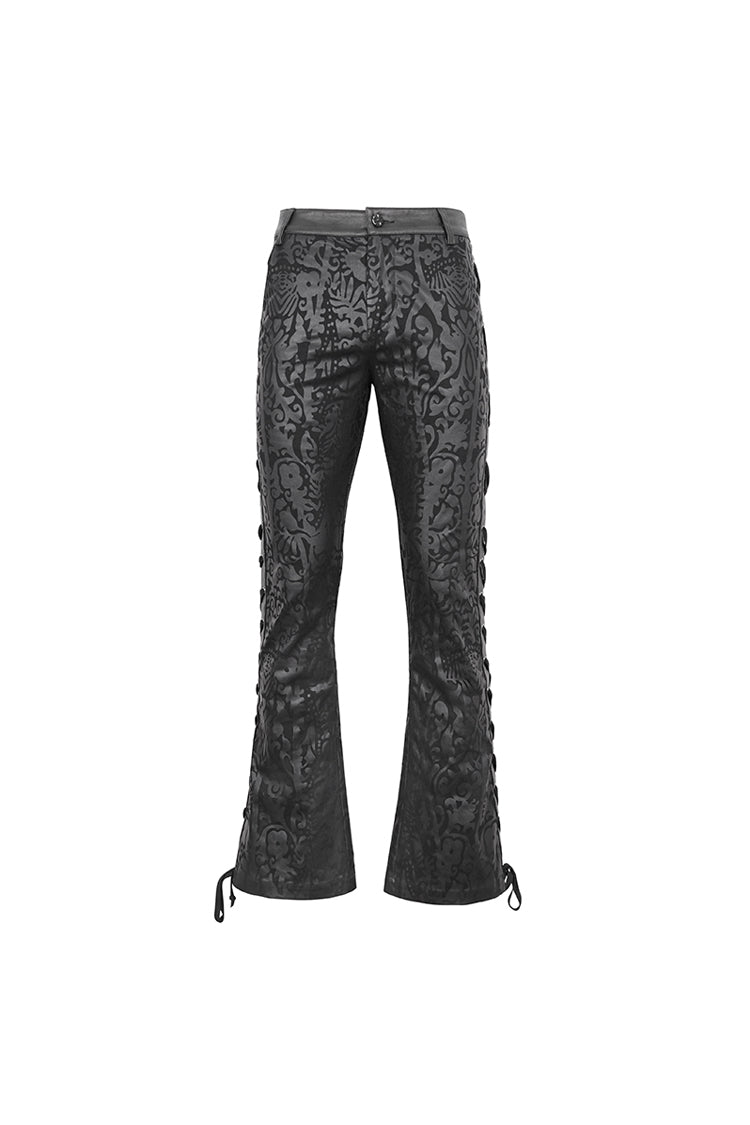 This pair of punk pants has a totem print. Lace-up on the sides. Flared hem design. Slim-fit silhouette and slightly elastic fabric.