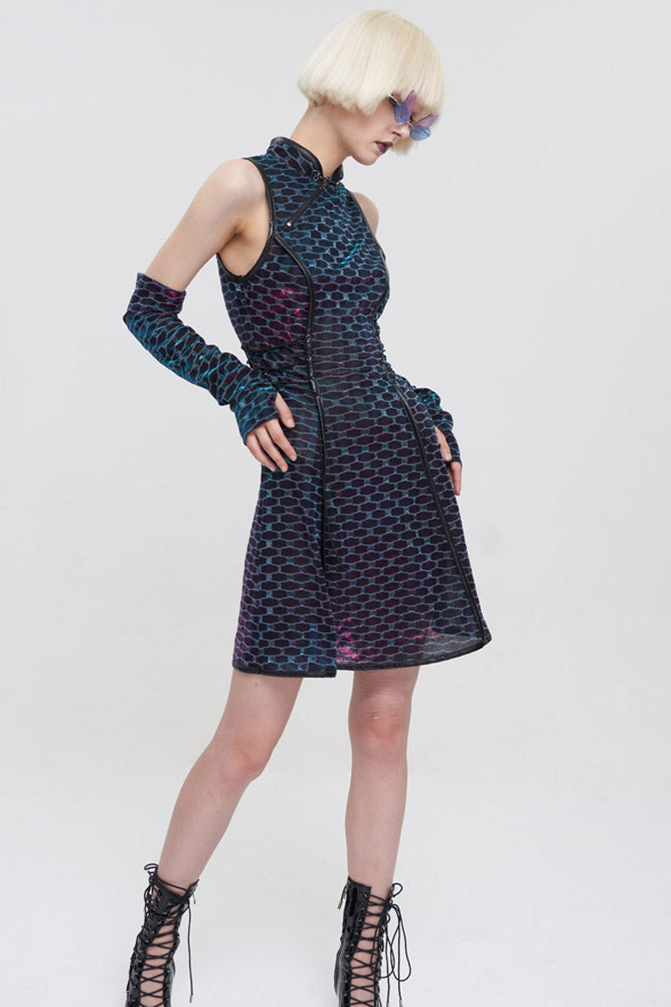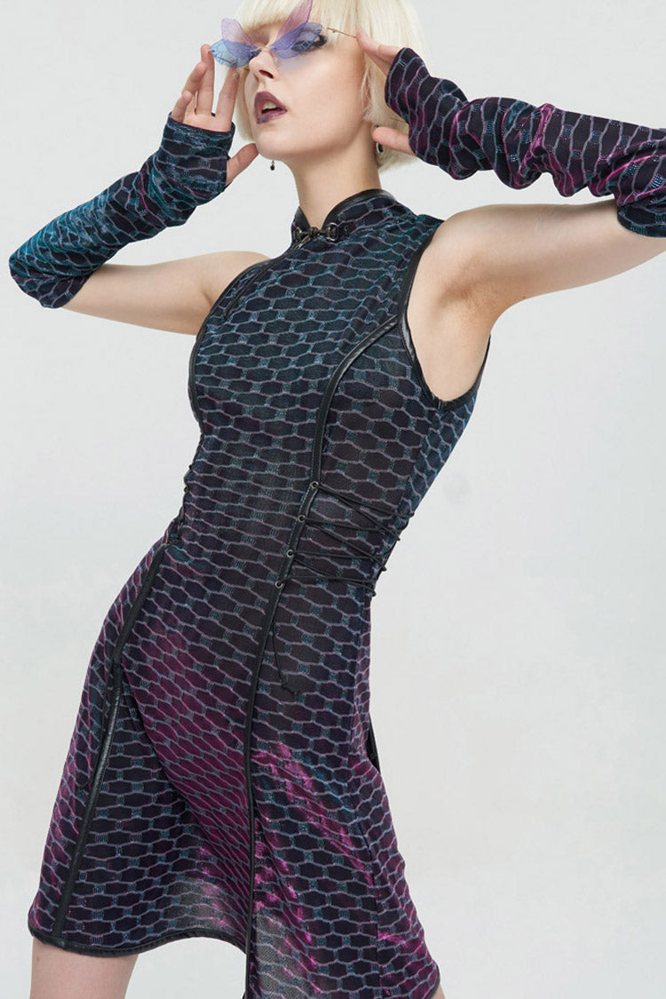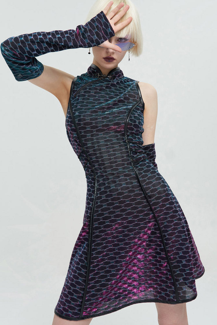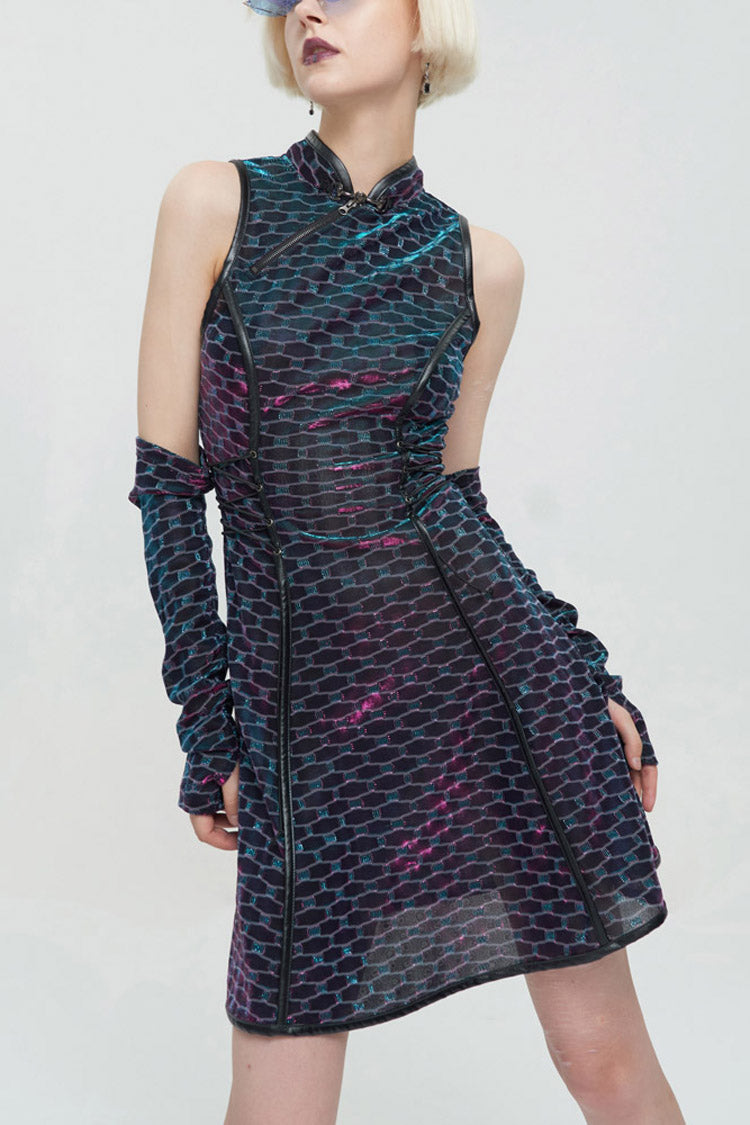 The main fabric is composite elastic mesh material, the cheongsam collar is designed, and the sleeveless short dress. Side drawstrings adjust the girth.