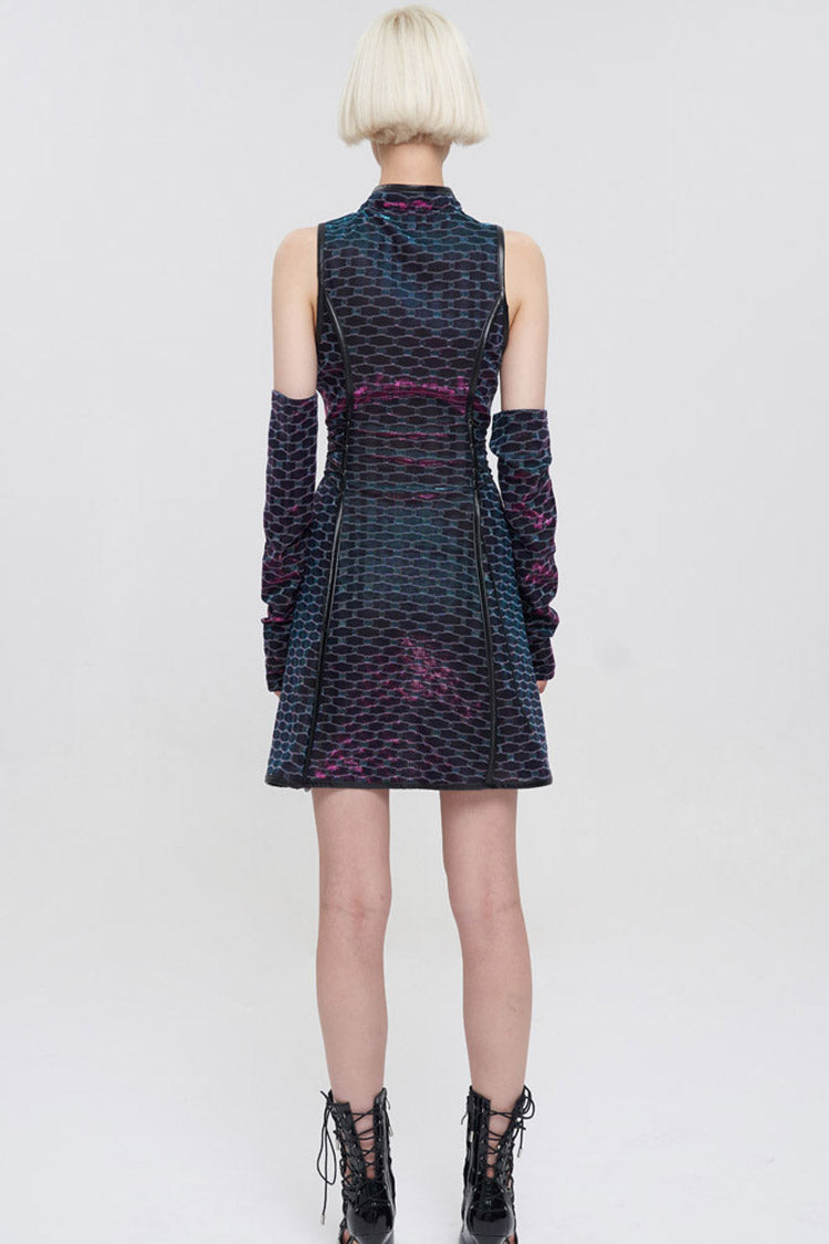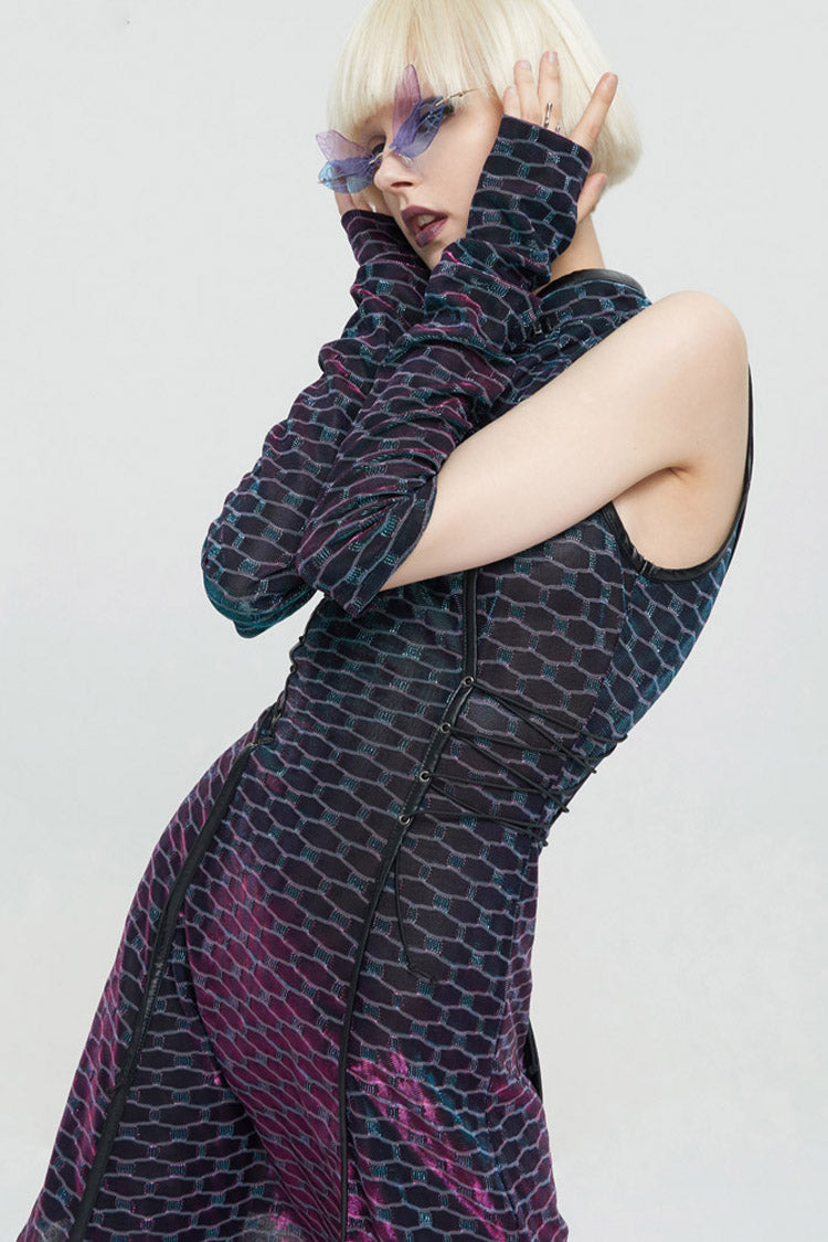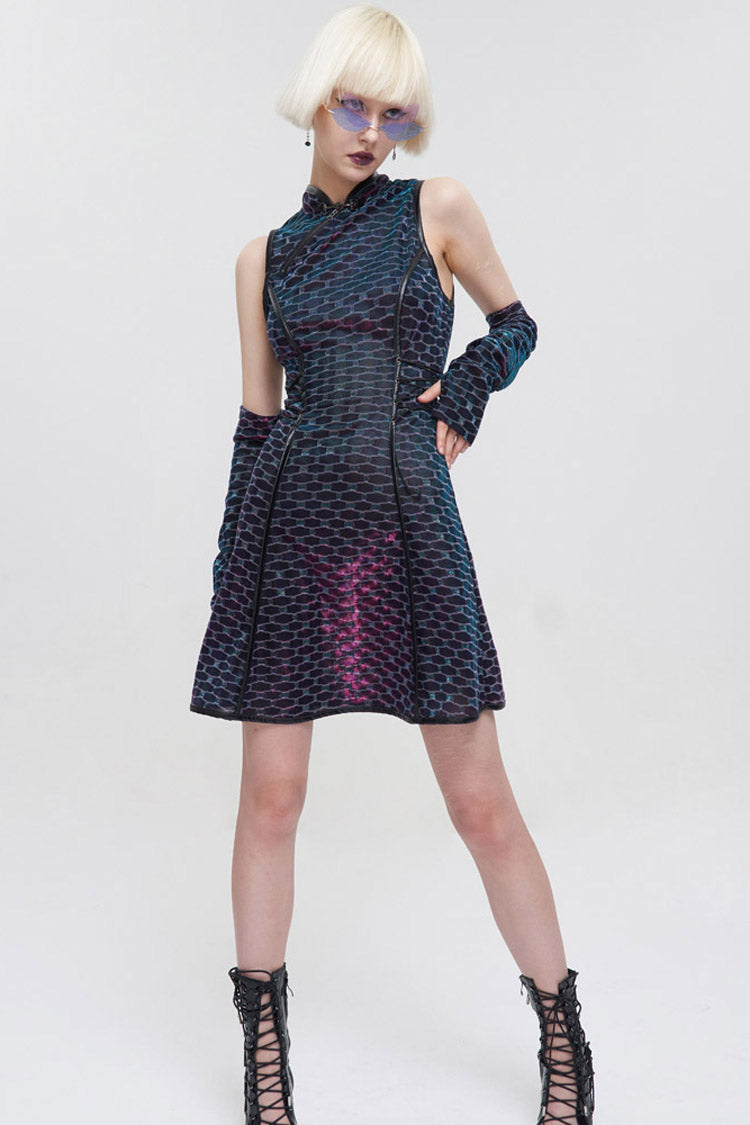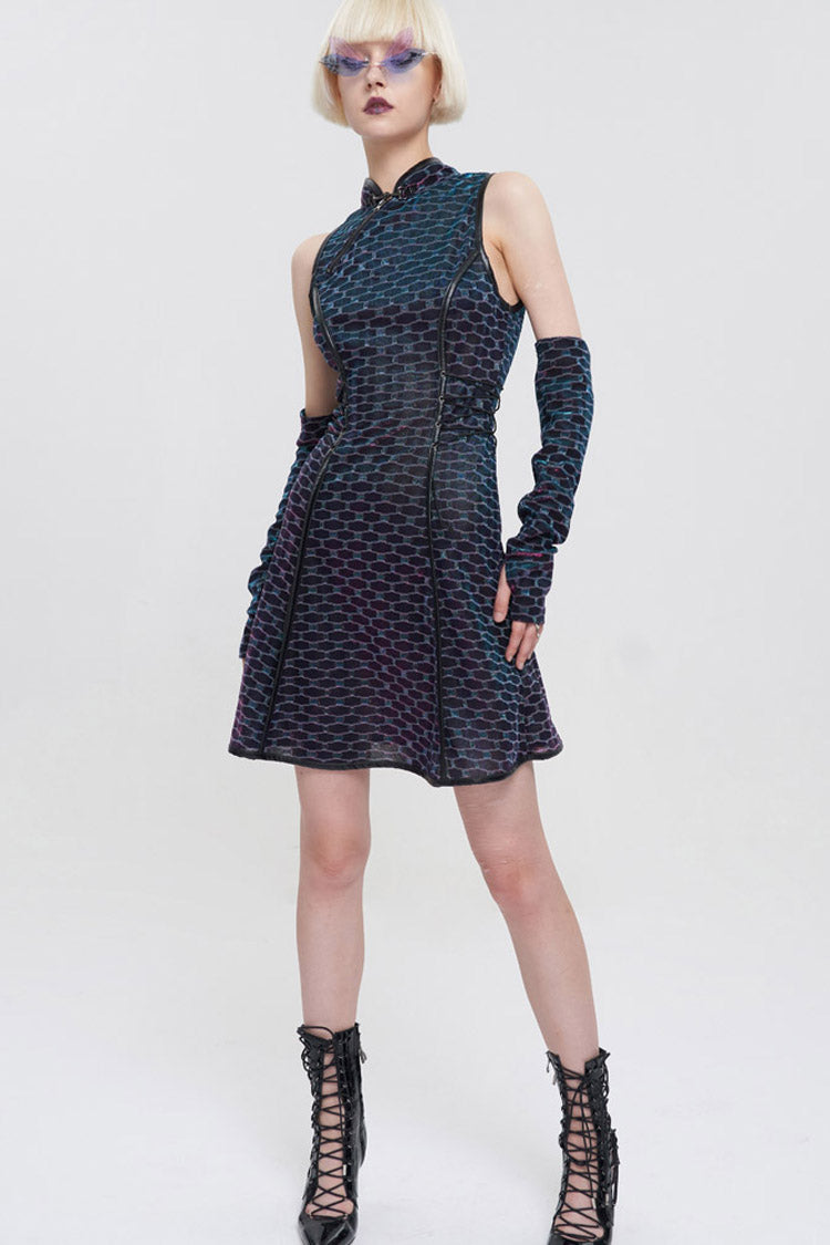 The main fabric is composite elastic mesh material, the cheongsam collar is designed, and the sleeveless short dress. Side drawstrings adjust the girth.