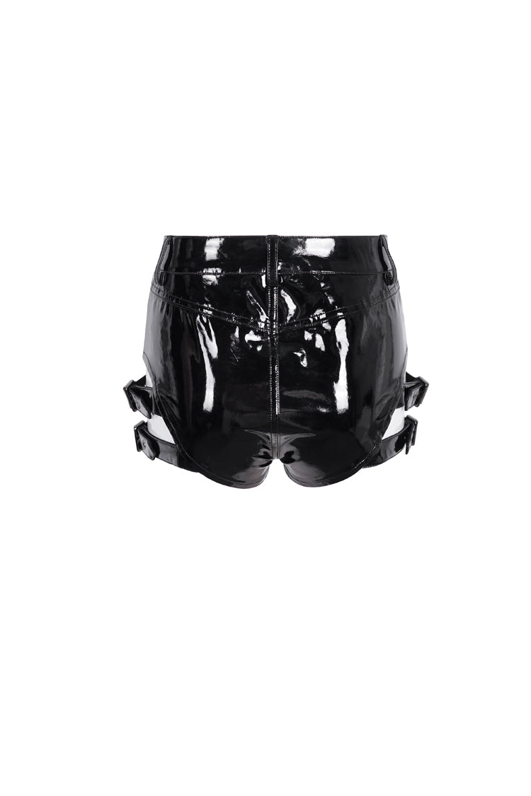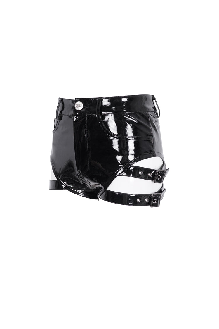 Cette paire de shorts punk à la mode est fabriquée en similicuir. Une boucle argentée à l'avant. Il est cousu avec des boucles métalliques pour l'ajustement, une silhouette ajustée et un tissu légèrement élastique.