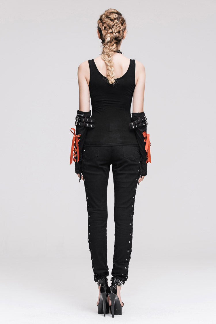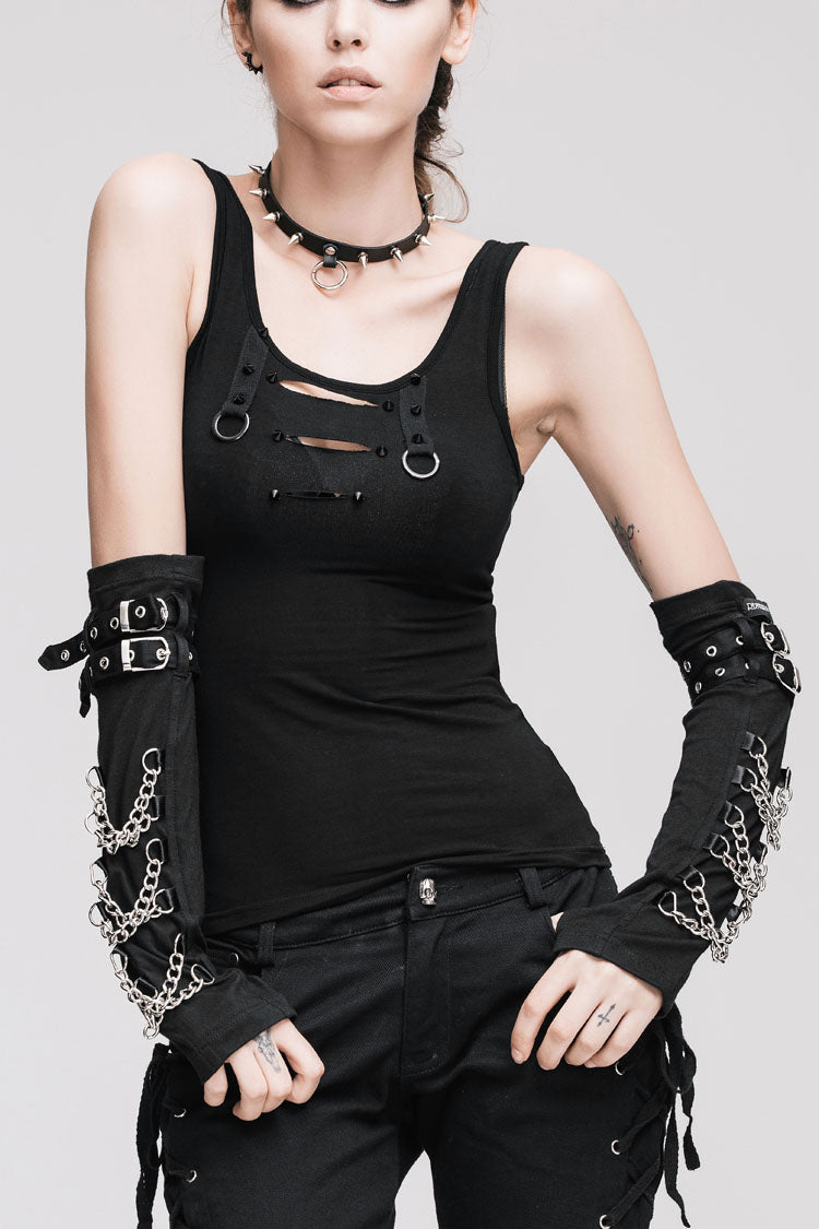 Le procédé de brûlage a été utilisé pour créer les trous cassés sur le devant de la poitrine sur 40 pièces de tissu Modal extensible, les clous pointus en résine noire ont été cousus sur les rubans à la main, et il est décoré avec l'anneau en métal.