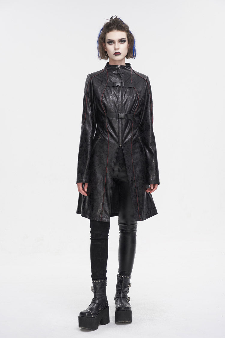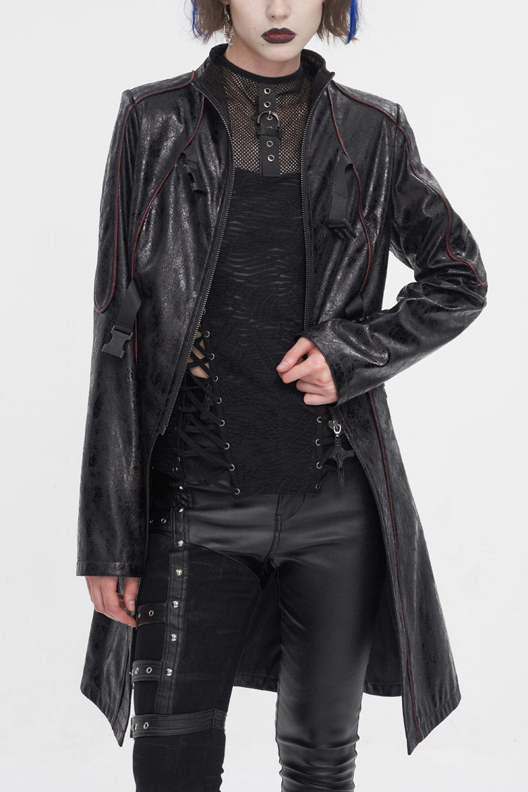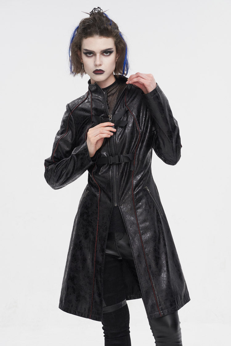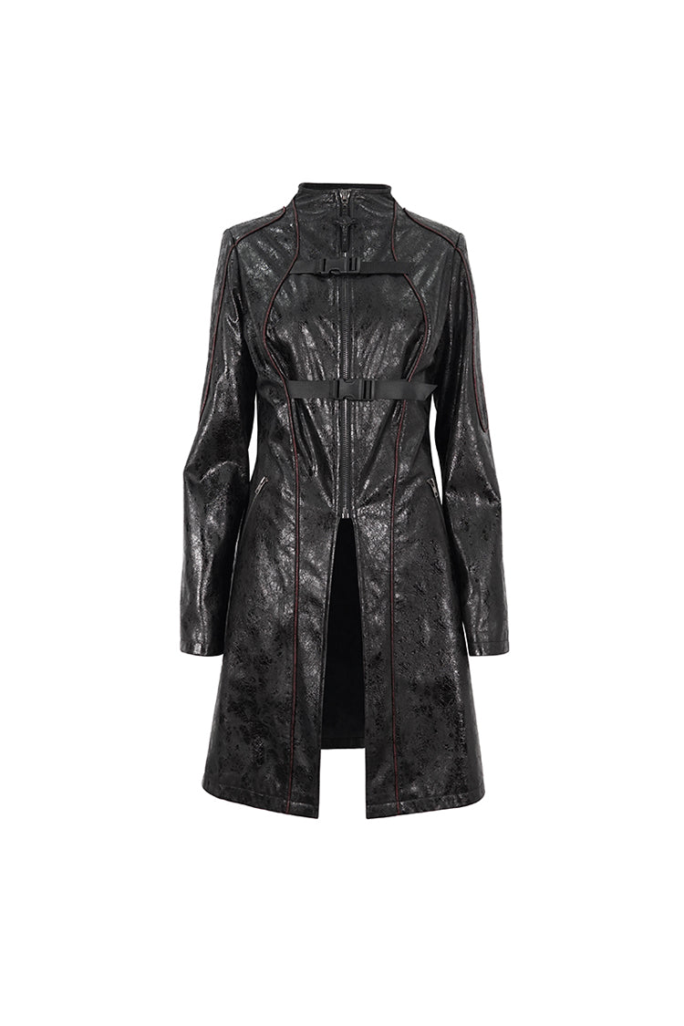 Cette longue veste punk est faite de tissu craquelé. Double boucles à l'avant. Fermeture éclair croisée pour l'enfiler et la retirer. Fente au centre avant. Silhouette ajustée. Disponible en deux couleurs.