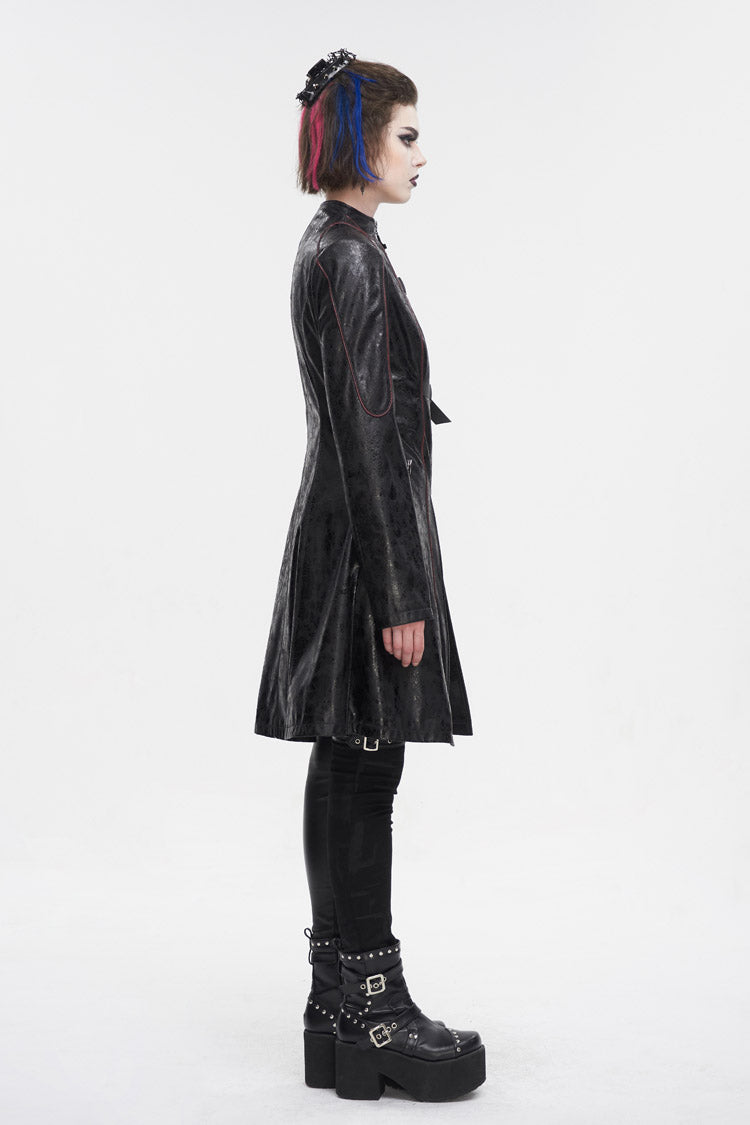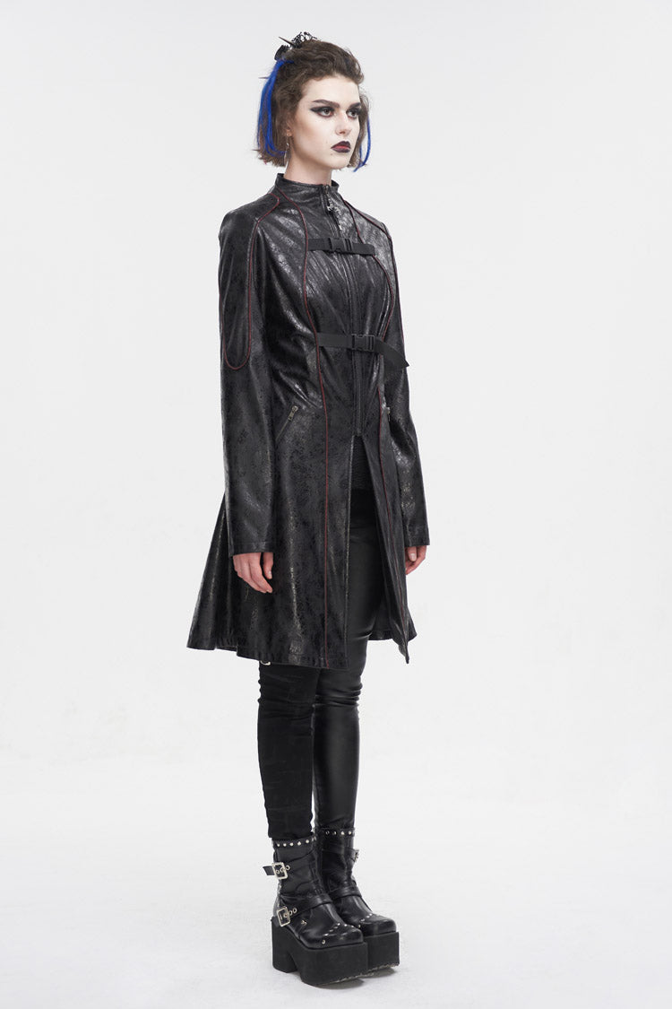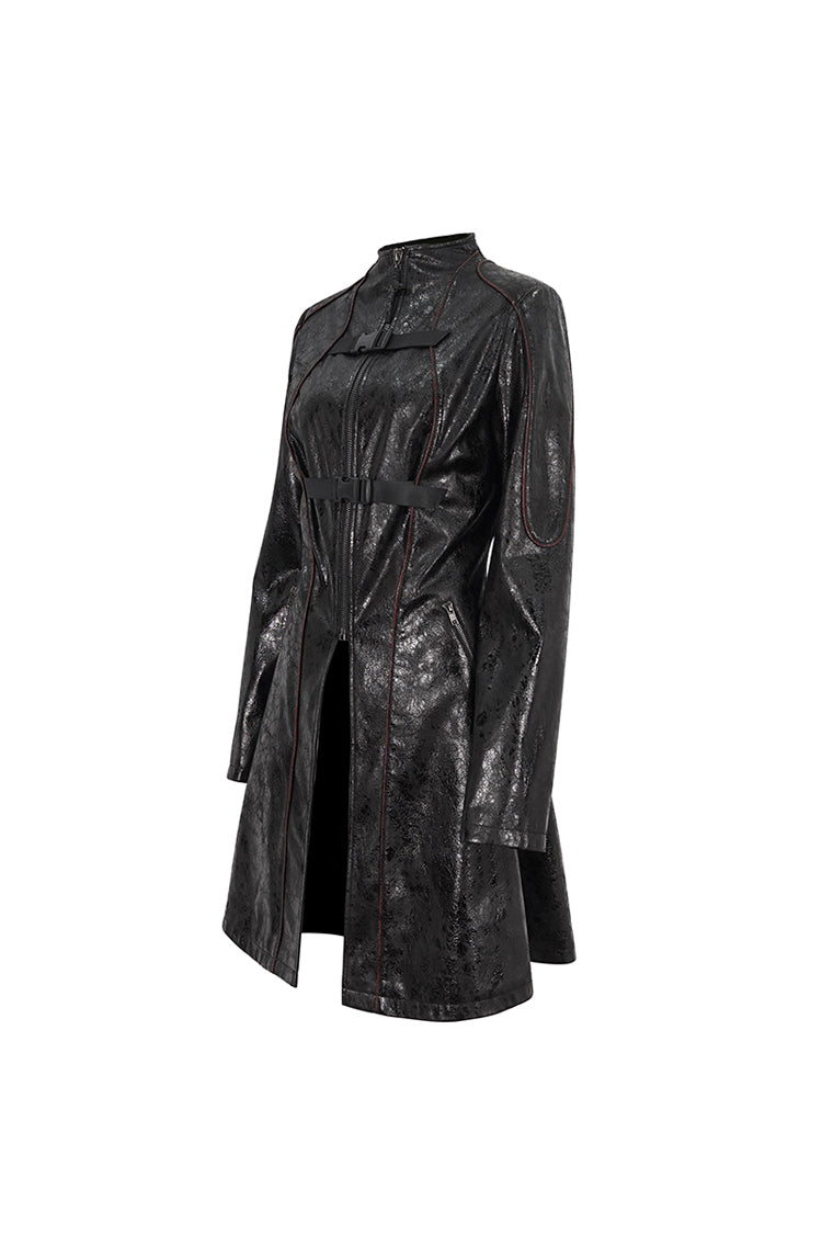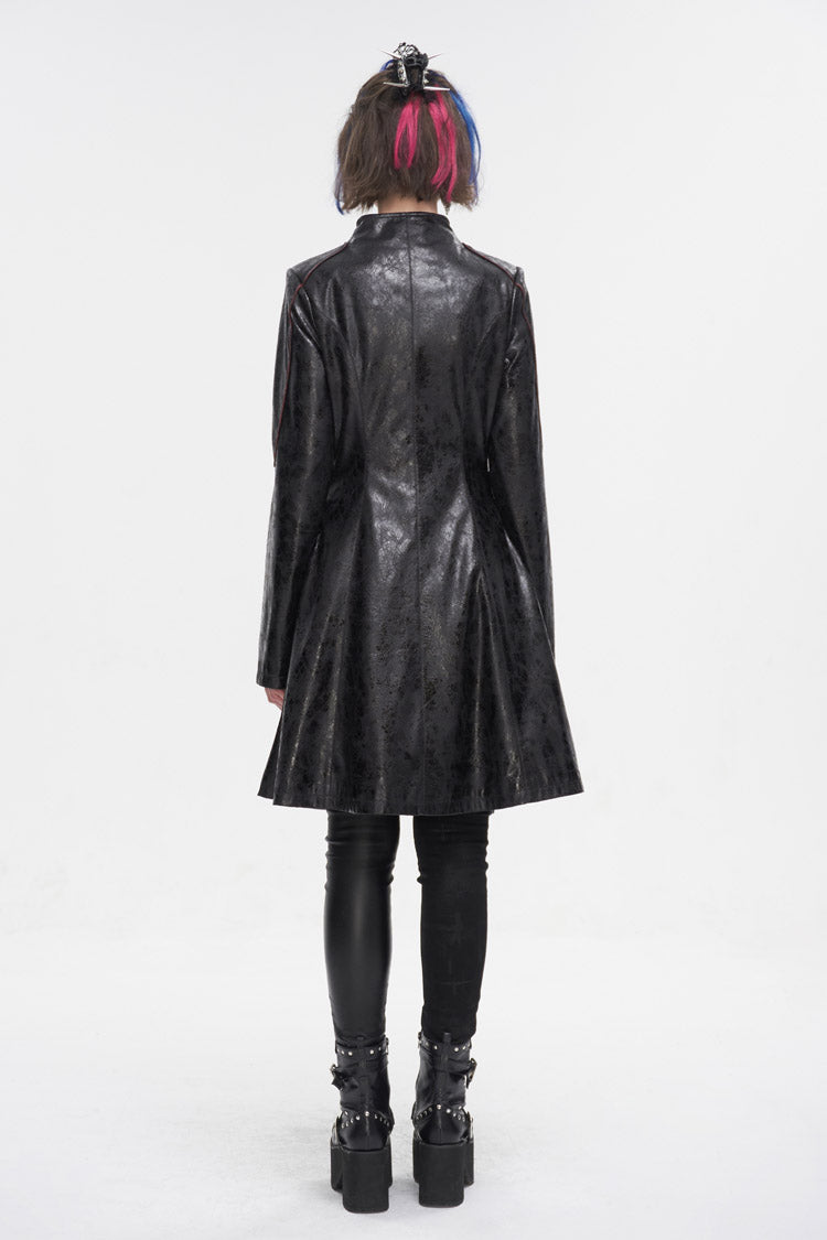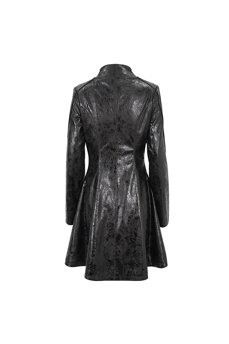 Cette longue veste punk est faite de tissu craquelé. Double boucles à l'avant. Fermeture éclair croisée pour l'enfiler et la retirer. Fente au centre avant. Silhouette ajustée. Disponible en deux couleurs.