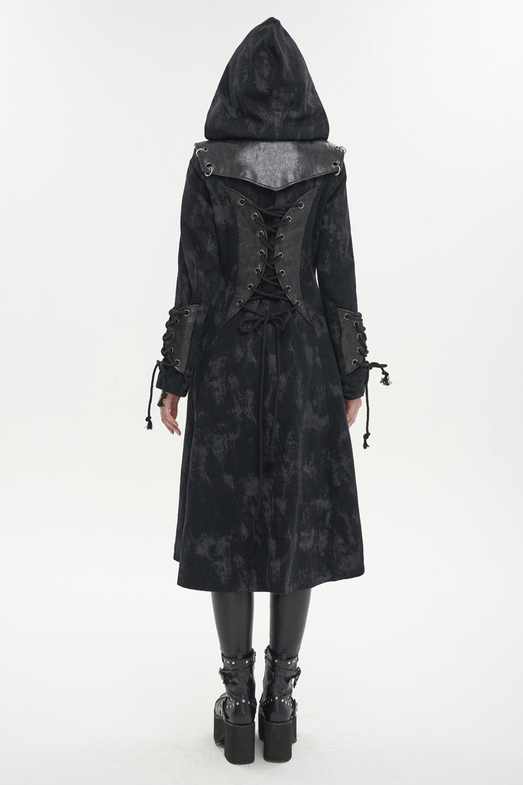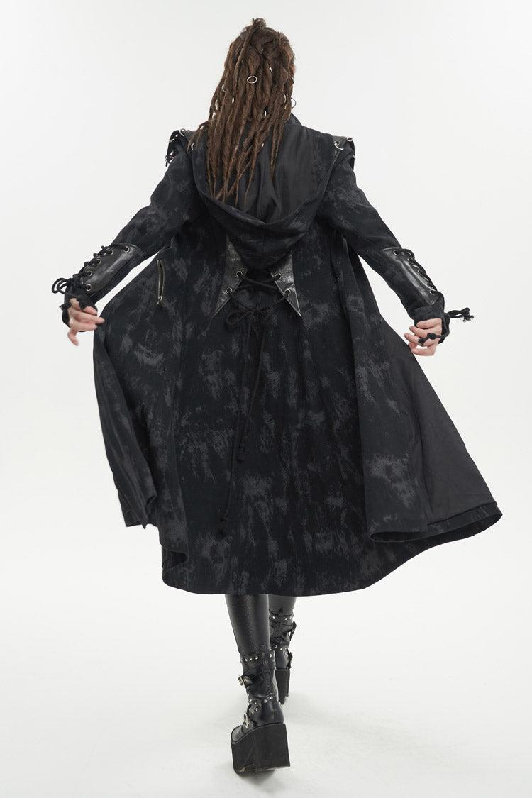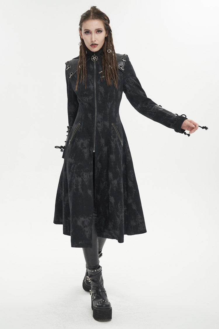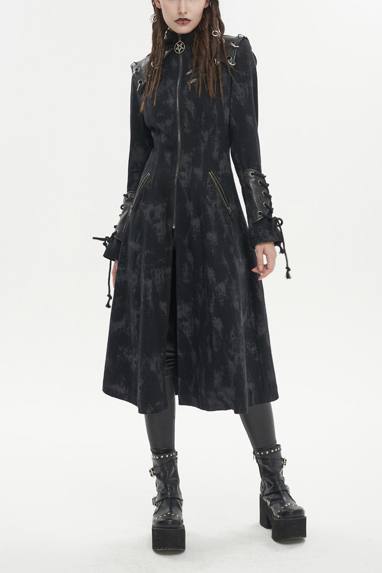 Le tissu sergé imprimé de manière irrégulière est cousu avec du cuir à grain rugueux, avec des cornes sur les épaules et des anneaux métalliques suspendus pour la décoration.
